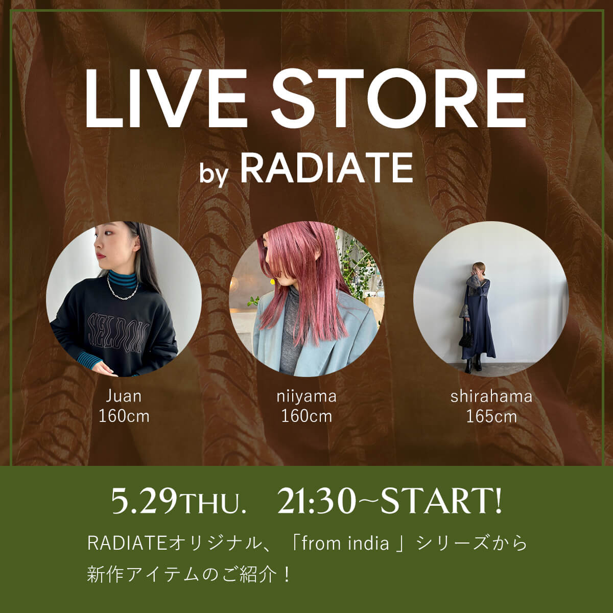 【LIVE STORE】5/29(木) 21:30 RADIATE / from india シリーズアイテムのご紹介!