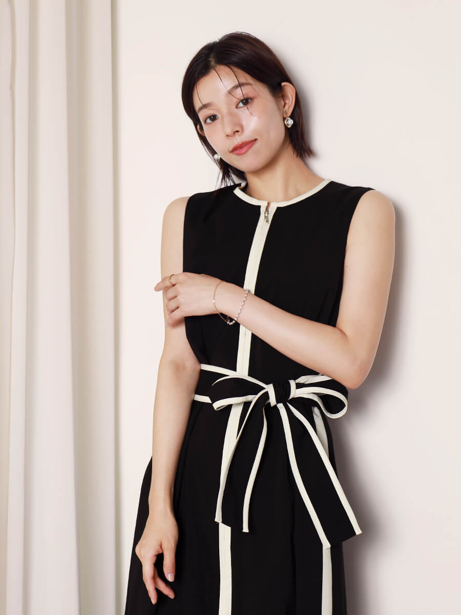ジャケットの肩掛けで肌見せのバランスを調整。