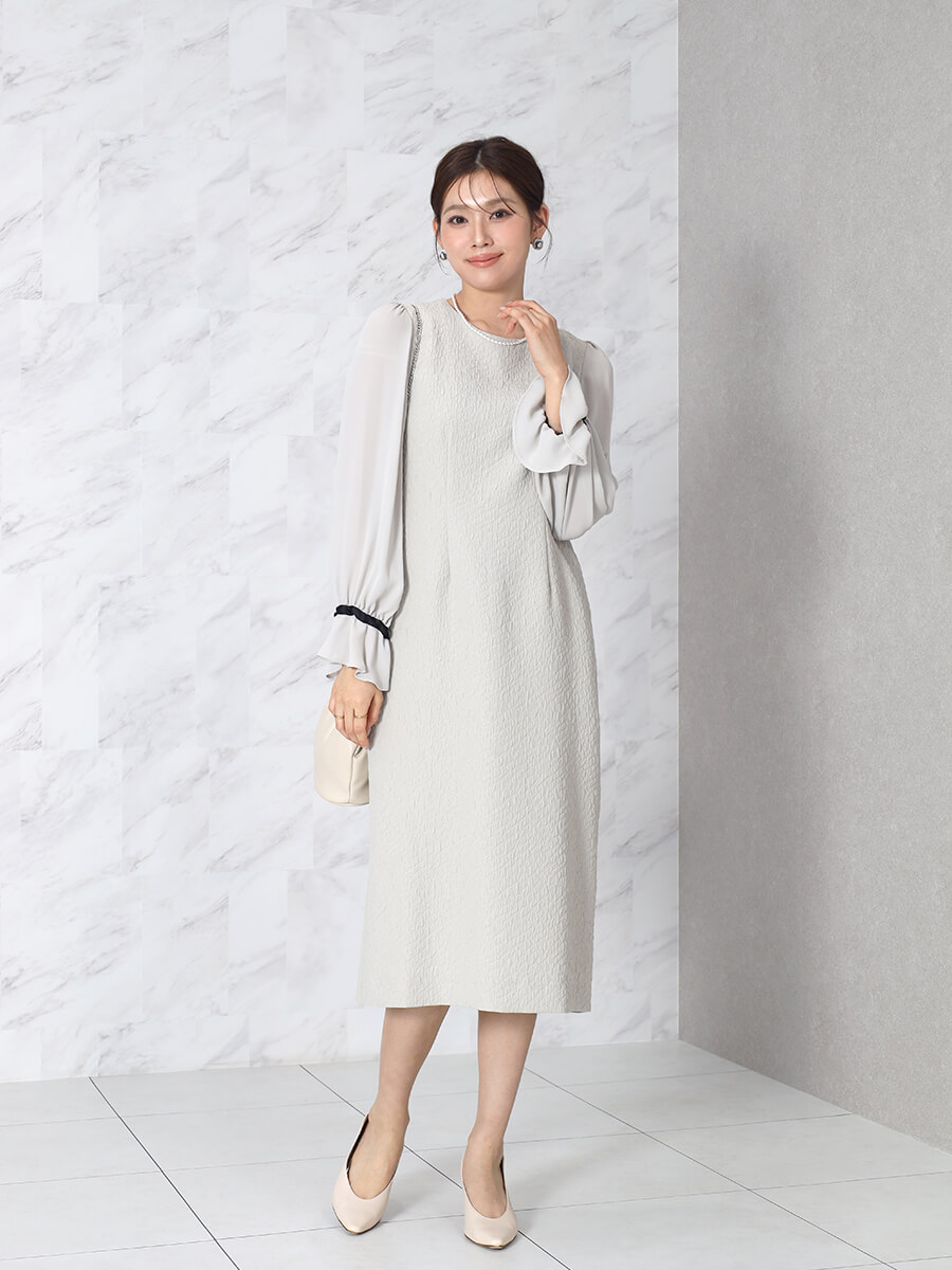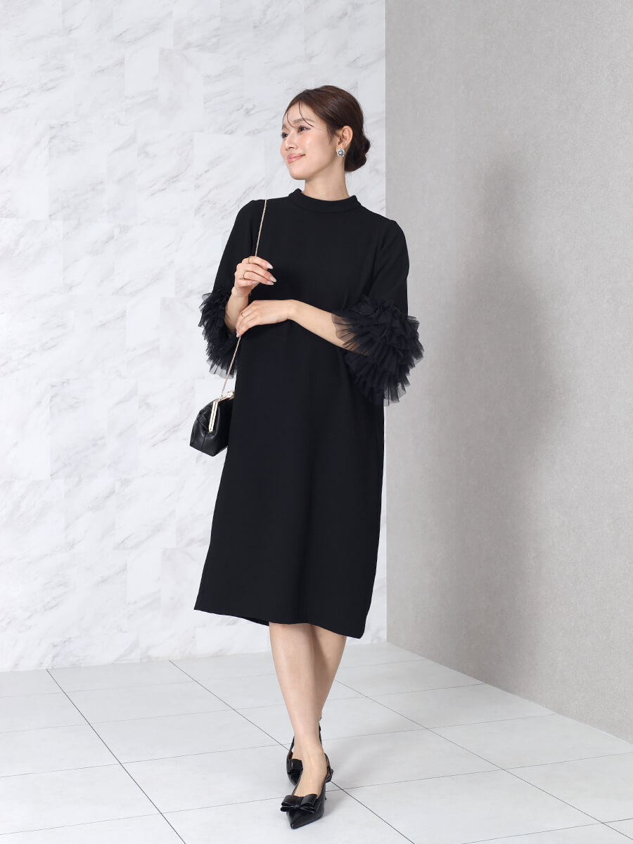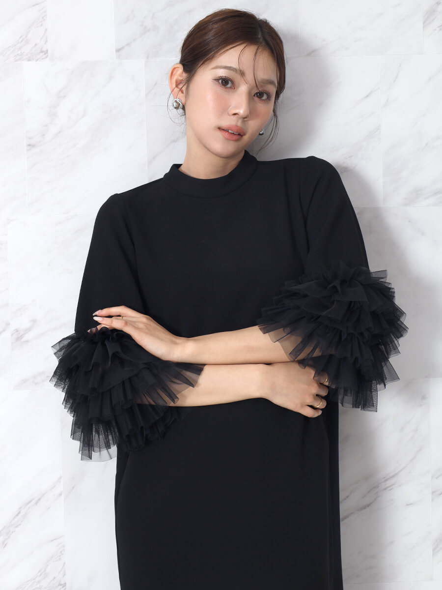 袖にボリュームを持たせたチュールデザインが、装いに華やかな彩りを添えるワンピース。甘さのあるディテールをすっきりとしたシルエットで引き締め、大人らしい洗練されたバランスに仕上げています。小物はブラックで統一することで、モード感と品の良さが際立つお呼ばれスタイルに。