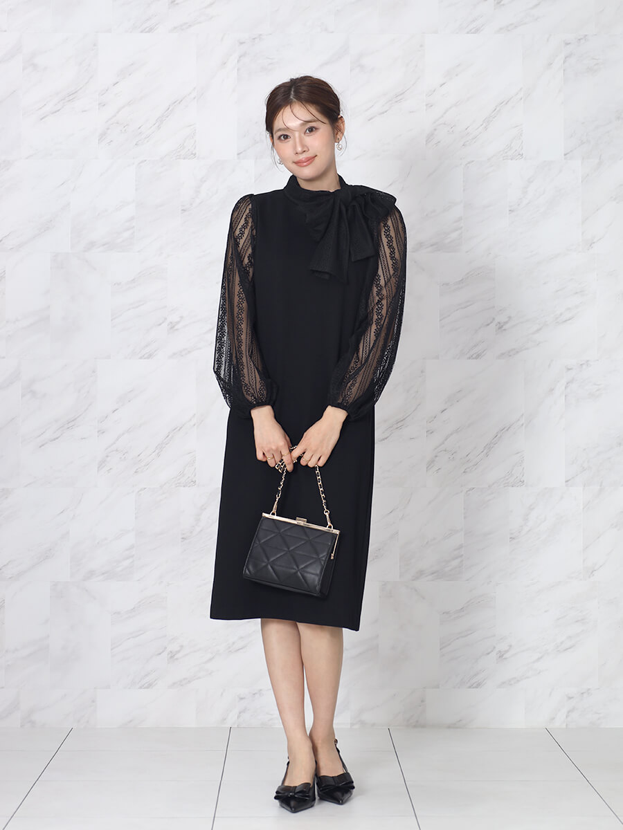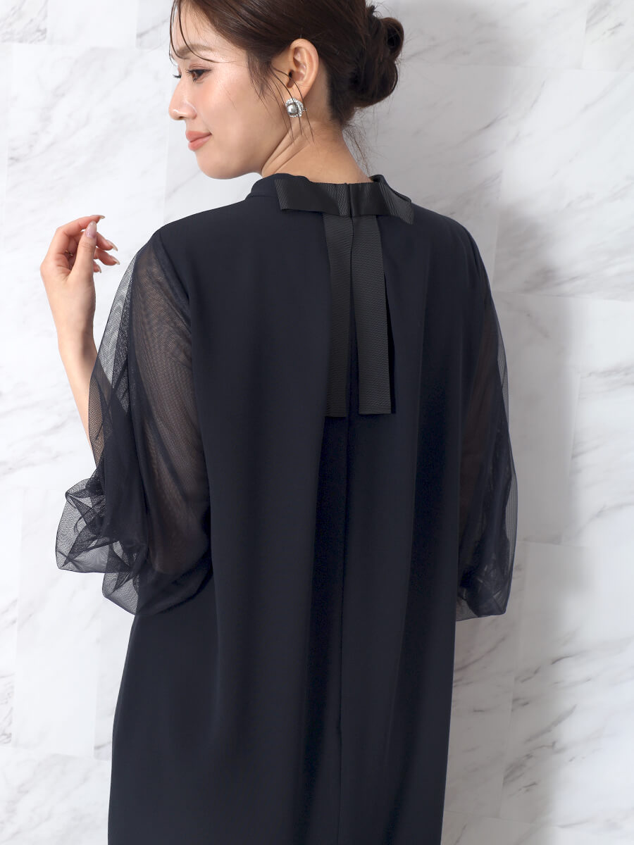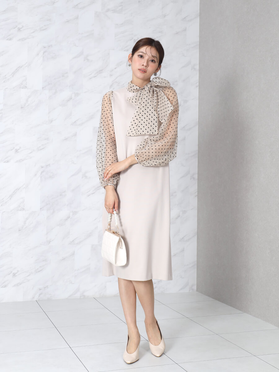袖にボリュームを持たせたチュールデザインが、装いに華やかな彩りを添えるワンピース。甘さのあるディテールをすっきりとしたシルエットで引き締め、大人らしい洗練されたバランスに仕上げています。小物はブラックで統一することで、モード感と品の良さが際立つお呼ばれスタイルに。
