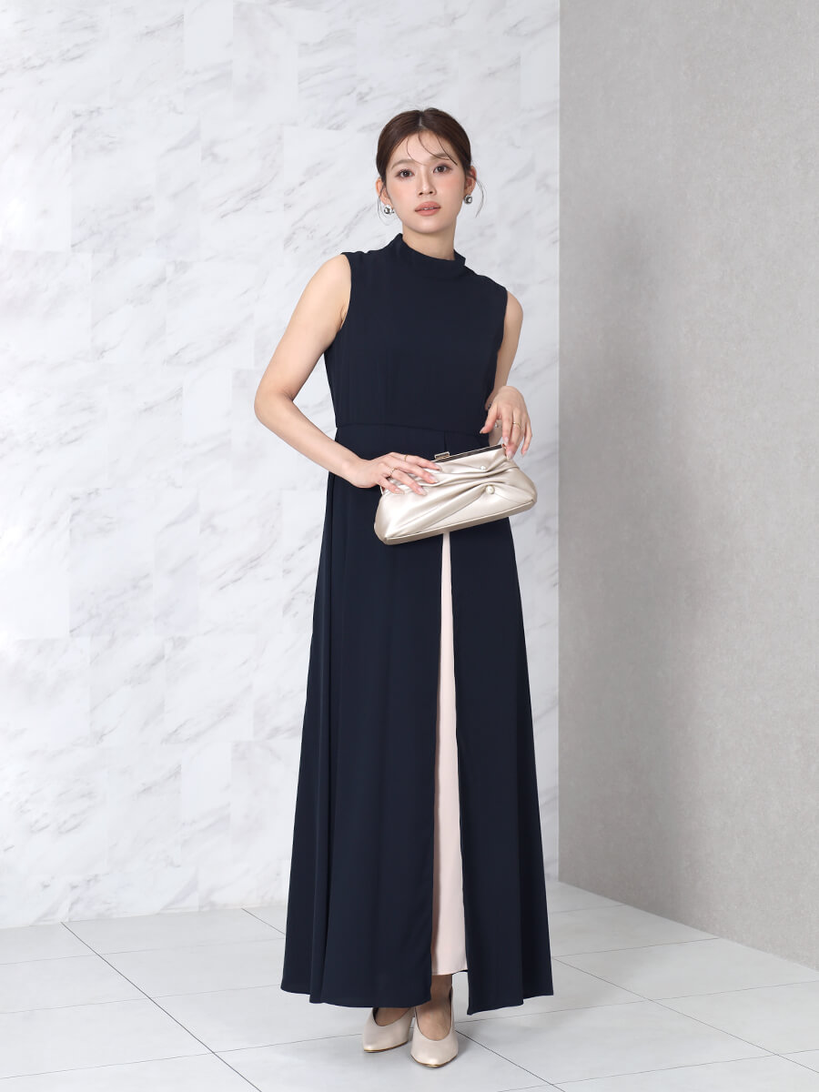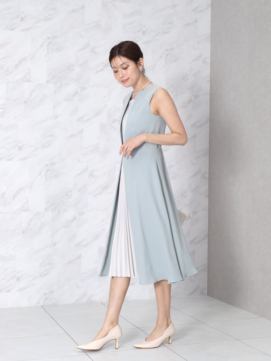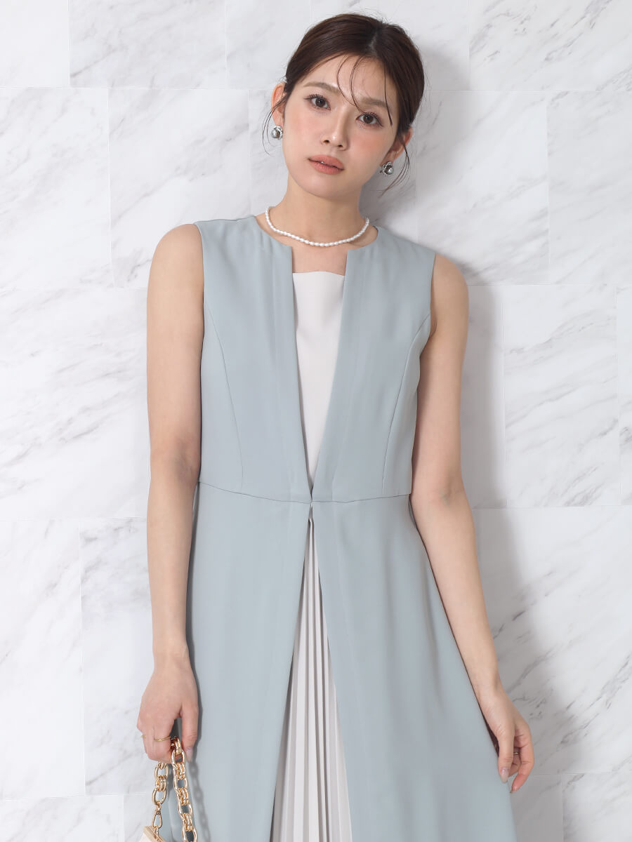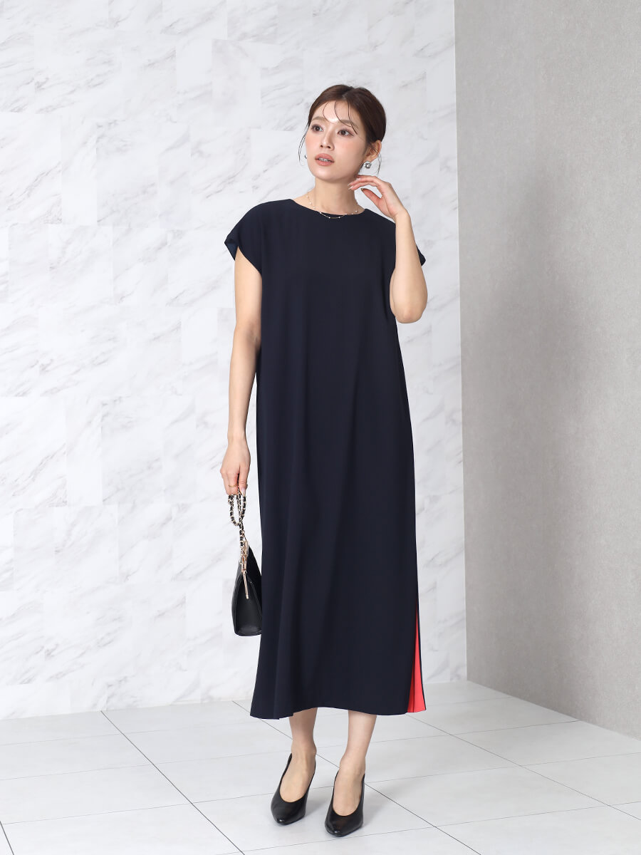ウエストのシェイプラインが美しく、一枚でサマになるワンピース。スリットから覗くバイカラープリーツが、シャープで洗練された印象を演出します。パールネックレスを合わせて輝きを足せば、特別感のある華やかな装いに。