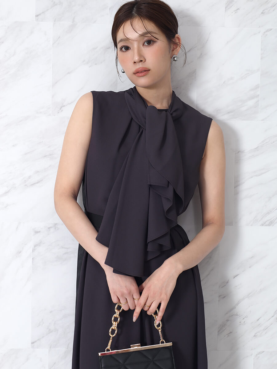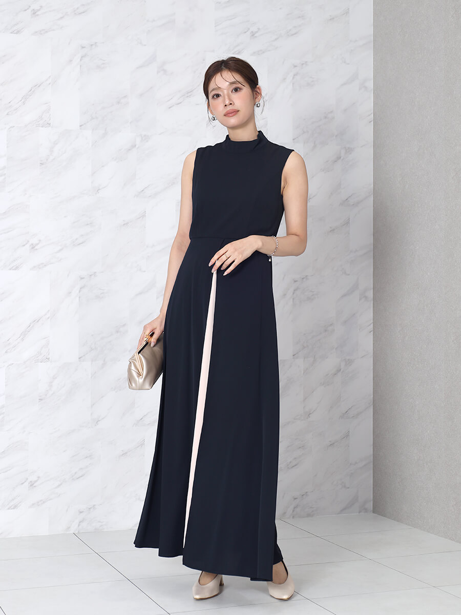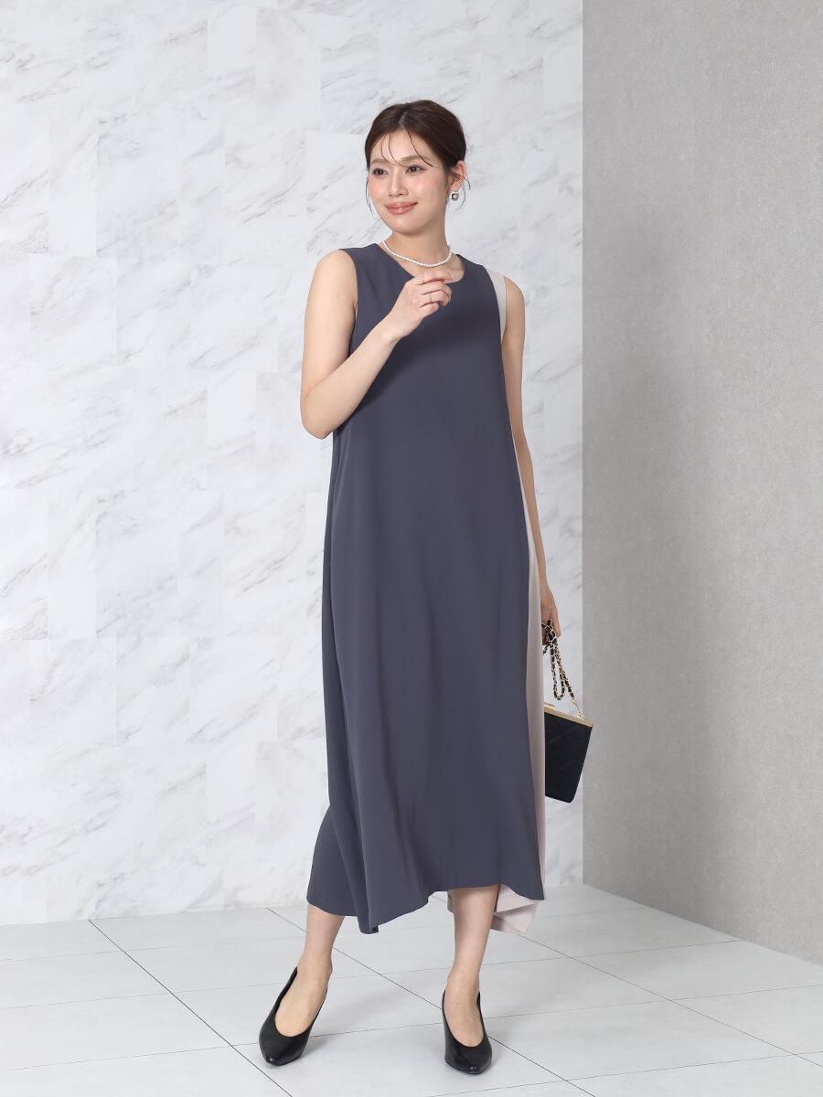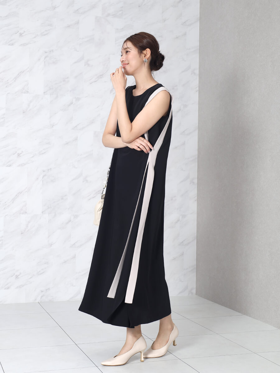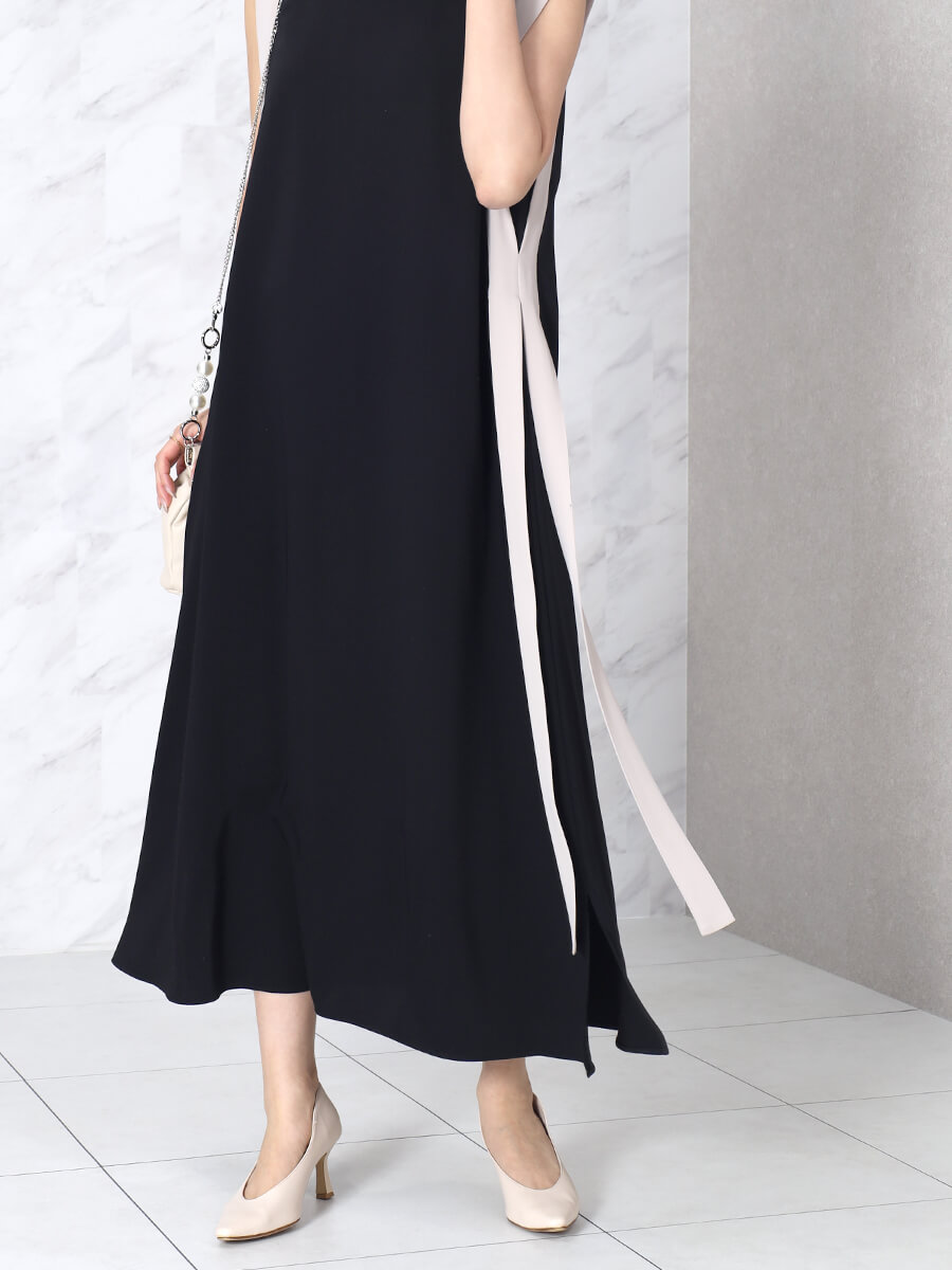 バイカラーラインが縦のラインを強調し、自然なスタイルアップを叶えるノースリーブワンピース。サイドリボンを結ぶことでウエストにアクセントが生まれ、表情の変化を楽しめる一着。きれいめなお呼ばれや食事会など、程よく華やぎが求められるシーンにも映える佇まいに。