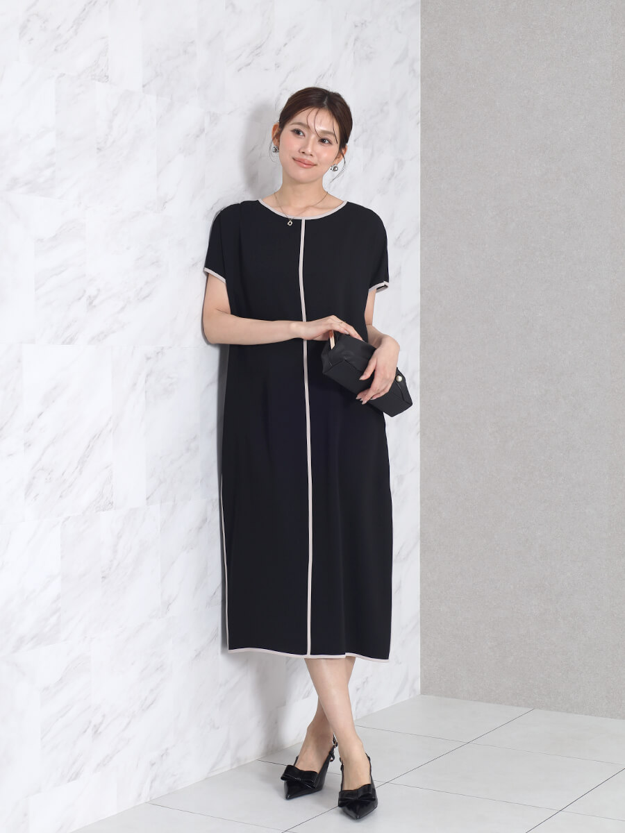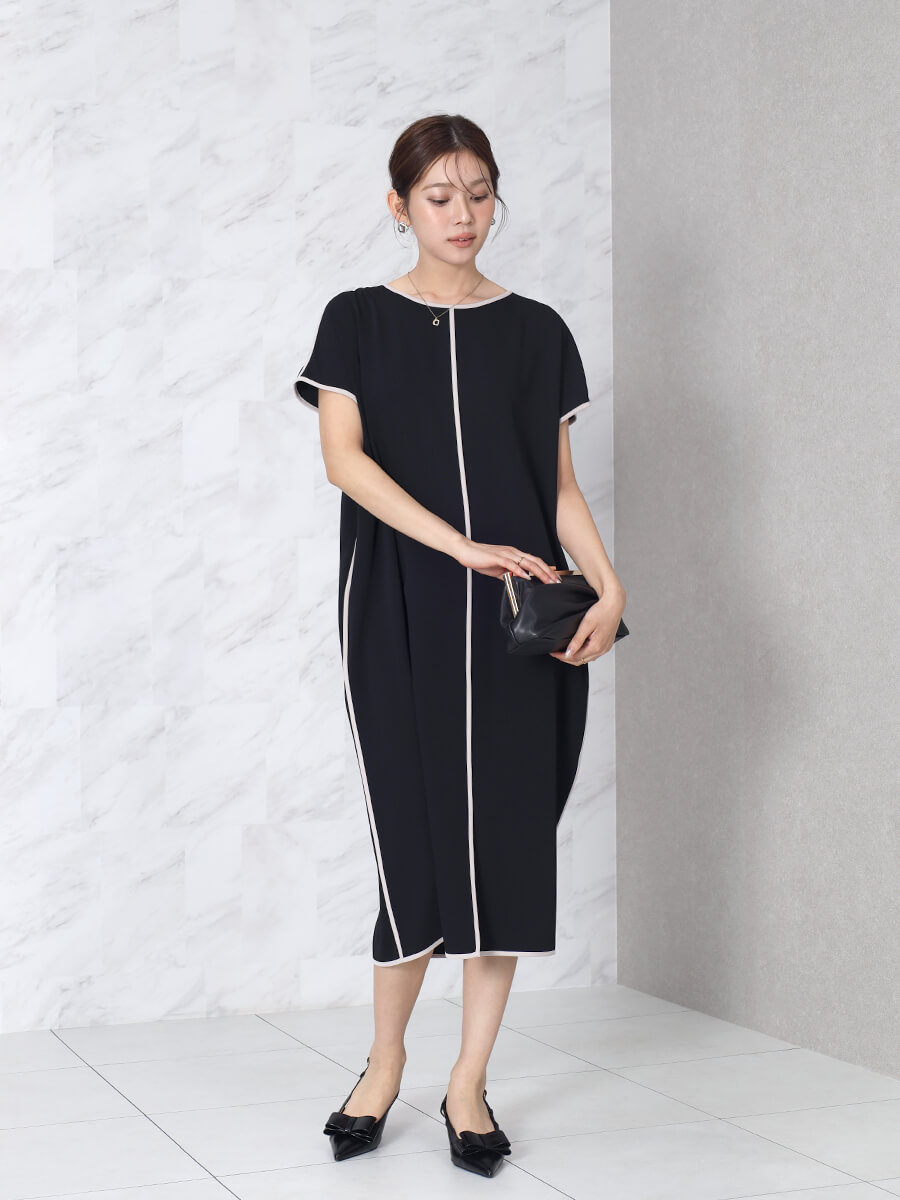 シャープな配色ラインが映えるIラインシルエットで、すっきりと洗練された佇まいを叶えるワンピース。縦に効かせた配色パイピングが自然なメリハリを生み、スタイルアップを演出します。上質なダブルクロス素材のほどよいふくらみと落ち感が品格を引き立て、アクセサリーやバッグ次第でオンオフ問わず着回せる一着です。