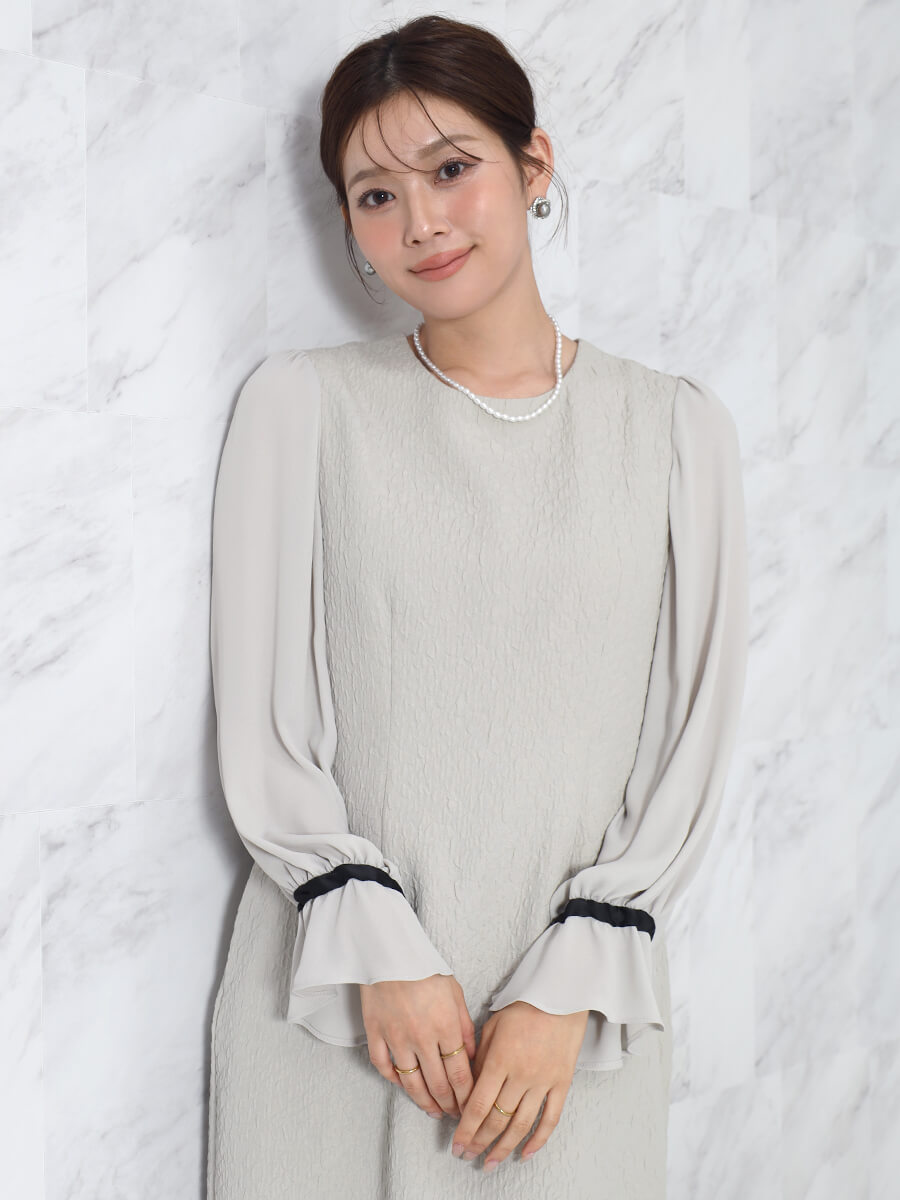 袖口をきゅっと絞ったキャンディースリーブが、愛らしい表情を添えるワンピース。立体感のあるフクレジャカード素材がシンプルな中にも存在感をもたらし、上品で洗練された印象に仕上がります。きちんとしたシーンはもちろん、日常使いにも自然に馴染む汎用性の高い一着。