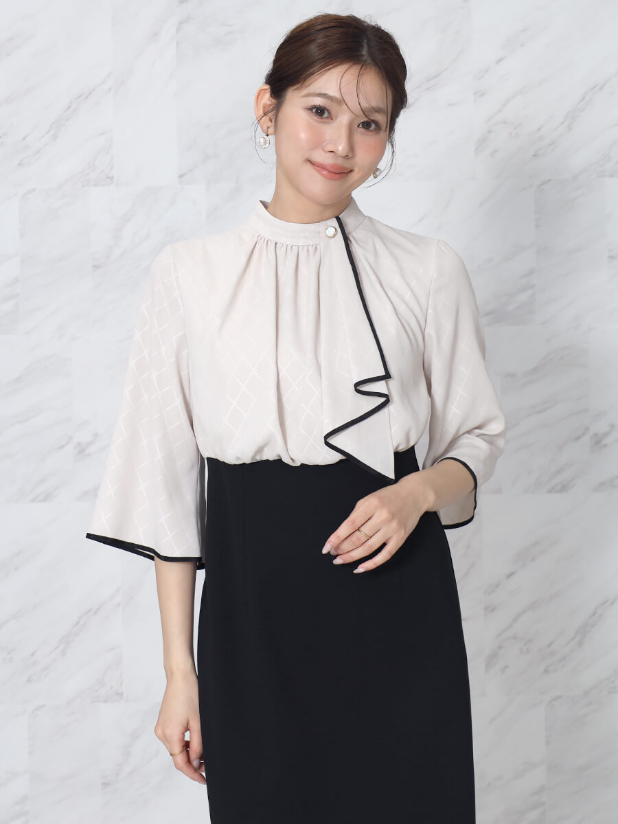 スカーフ風のタイディテールが顔まわりを華やかに彩るエレガントな一着。異素材を組み合わせたデザインが奥行きのある表情を生み、1枚で着映えが叶います。パールモチーフのバッグを添えれば、きちんと感の中に華やぎを添えた、洗練された装いに。