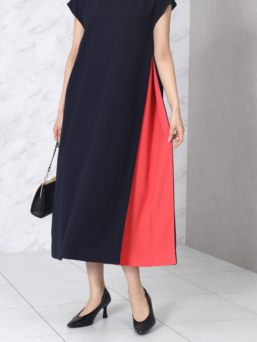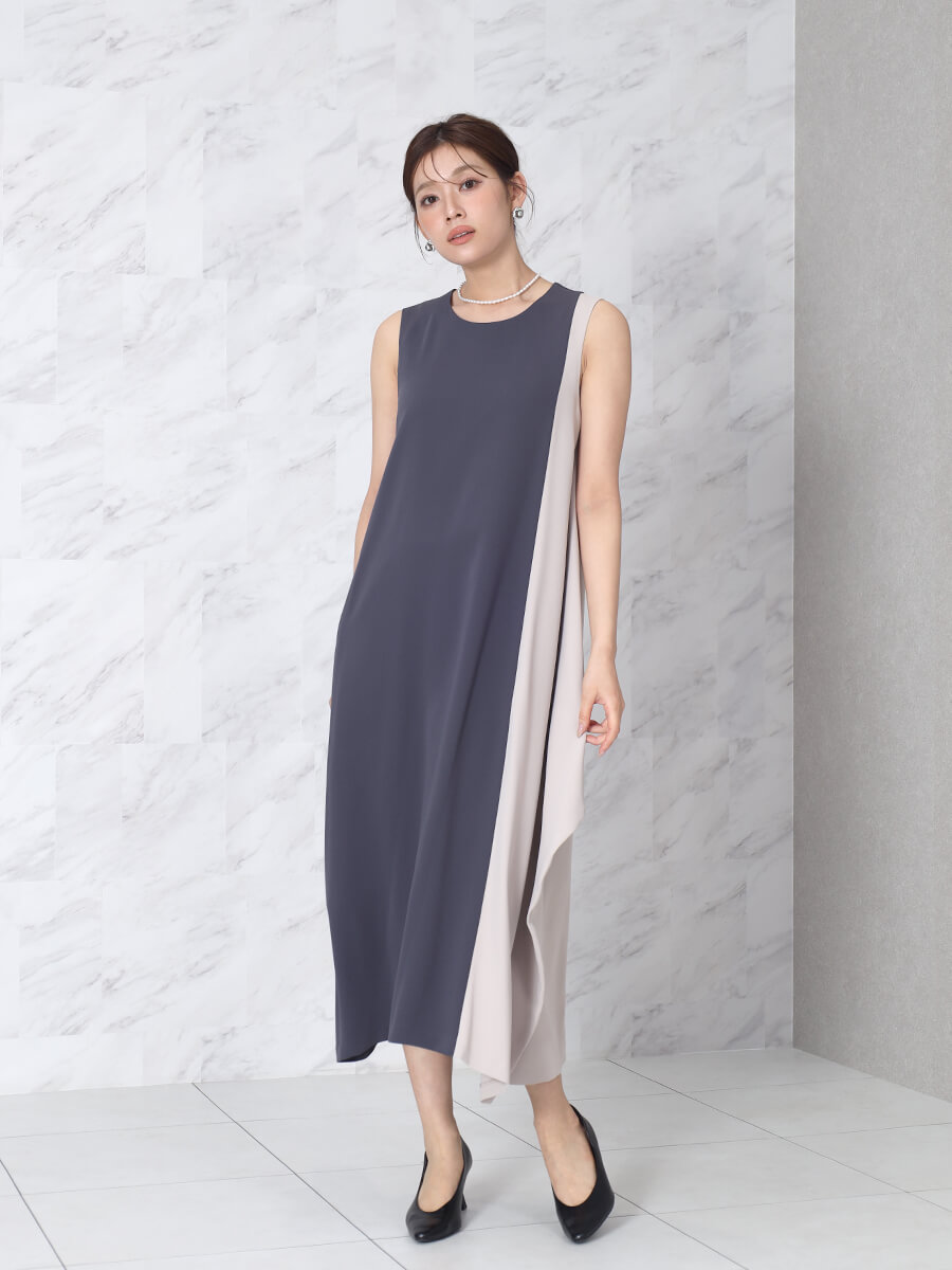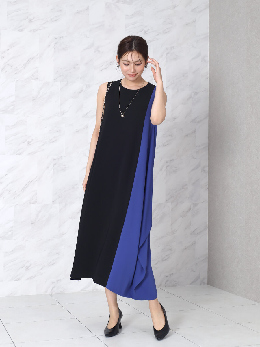 パキッとしたバイカラーが印象的なノースリーブワンピース。アシンメトリーに設計された左身頃のスクエアラインが、落ち感を美しく引き立て、洗練された佇まいを演出します。小物はシンプルにまとめることで、配色のコントラストがより際立つ装いに。