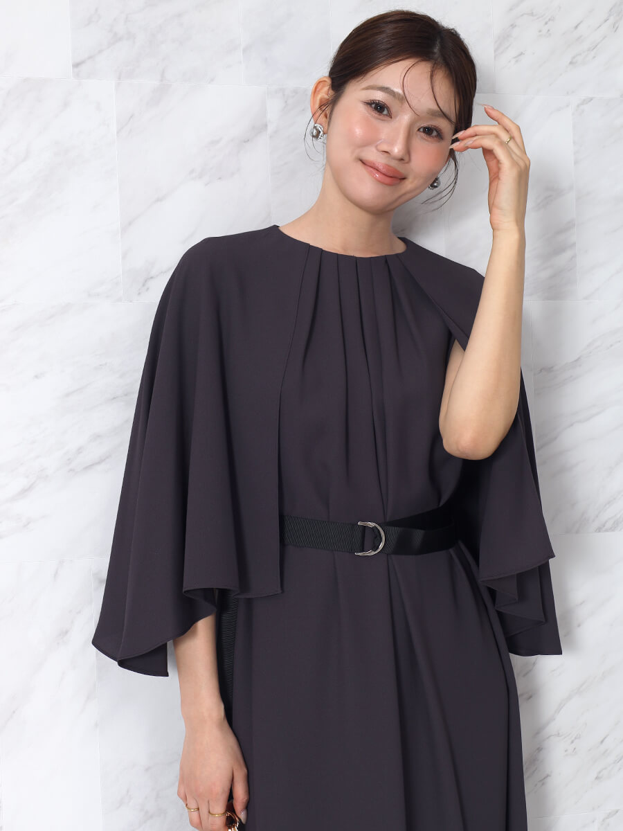 ノースリーブブラウスにケープを重ねたようなデザインが、上品で華やかな印象を演出するワンピース。ふんわりと広がるケープが腕まわりを優しくカバーし、付属ベルトでウエストをマークすることで、自然な華奢見えと女性らしいメリハリのあるシルエットを叶えます。一枚で品よく着用でき、フォーマルなオケージョンシーンまで幅広く寄り添う一着です。