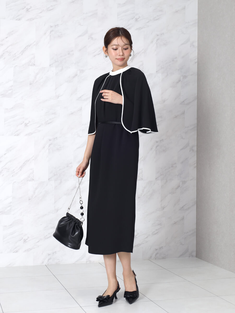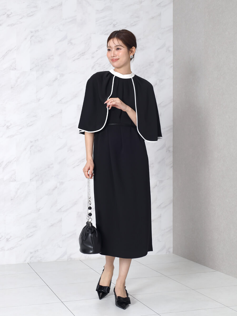 配色のサイドラインが縦のラインを強調し、凛とした印象を引き立てるケープワンピース。顔まわりを華やかに演出するケープカラーは、フロントでタイのように結ぶアレンジも楽しめ、装いに表情を添えます。さらりとしたジョーゼットが上品なドレープを描き、付属ベルトでウエストを引き締めれば、女性らしい曲線が際立つ洗練されたシルエットに。