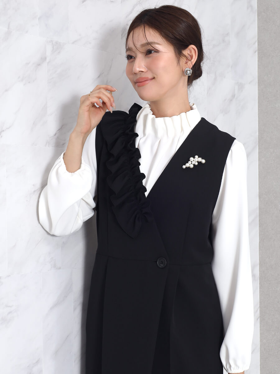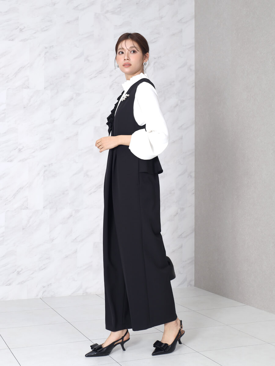 フリルディテールが印象的なオールインワンに、クリーンな白ブラウスをレイヤード。縦ラインを強調するシルエットとブラックでまとめた小物使いが、甘さを抑えた洗練された印象を演出します。セレモニーやきちんと感が求められるお呼ばれシーンにも品よく映えるコーディネートです。