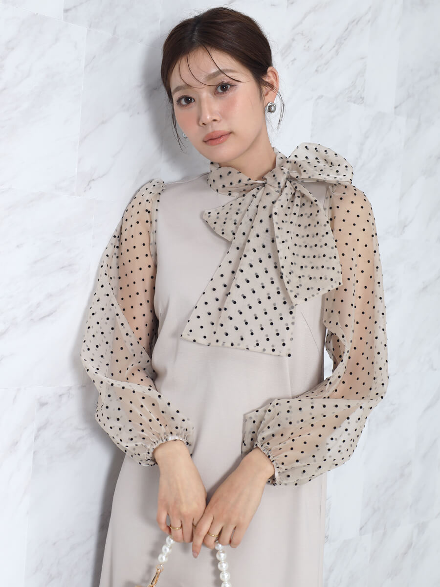 オーガンジーにフロッキードットをあしらったスリーブが、トレンド感を演出する一着。程よい透け感が軽やかな印象を与え、フェミニンながらも甘くなりすぎないバランスに仕上がります。コンパクトなバッグをプラスし、さりげなく華を添えた、品のあるスタイリングに。