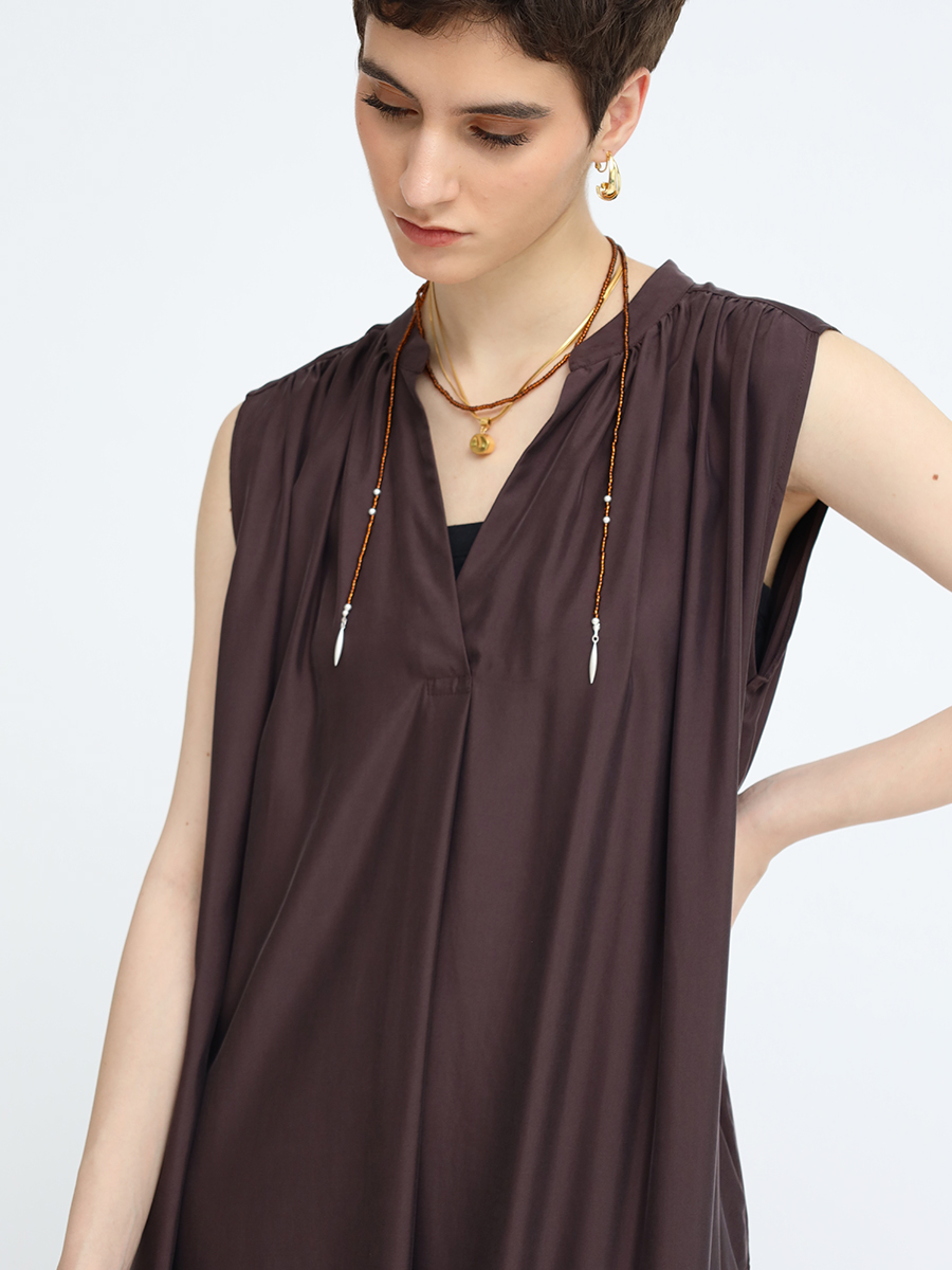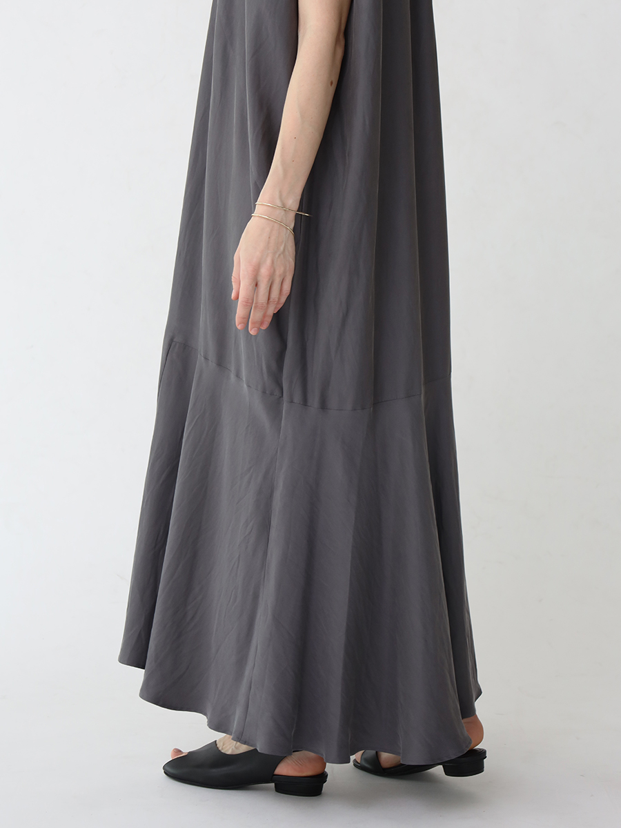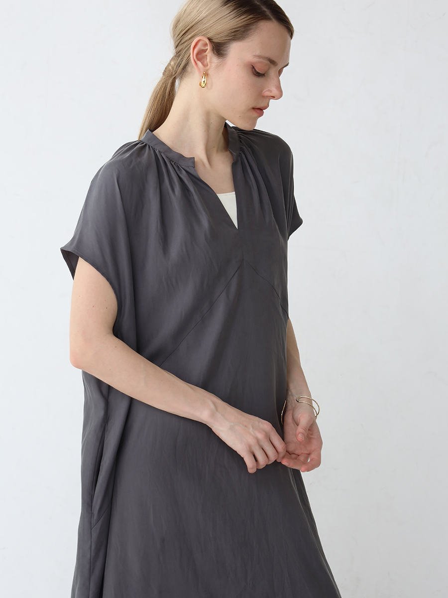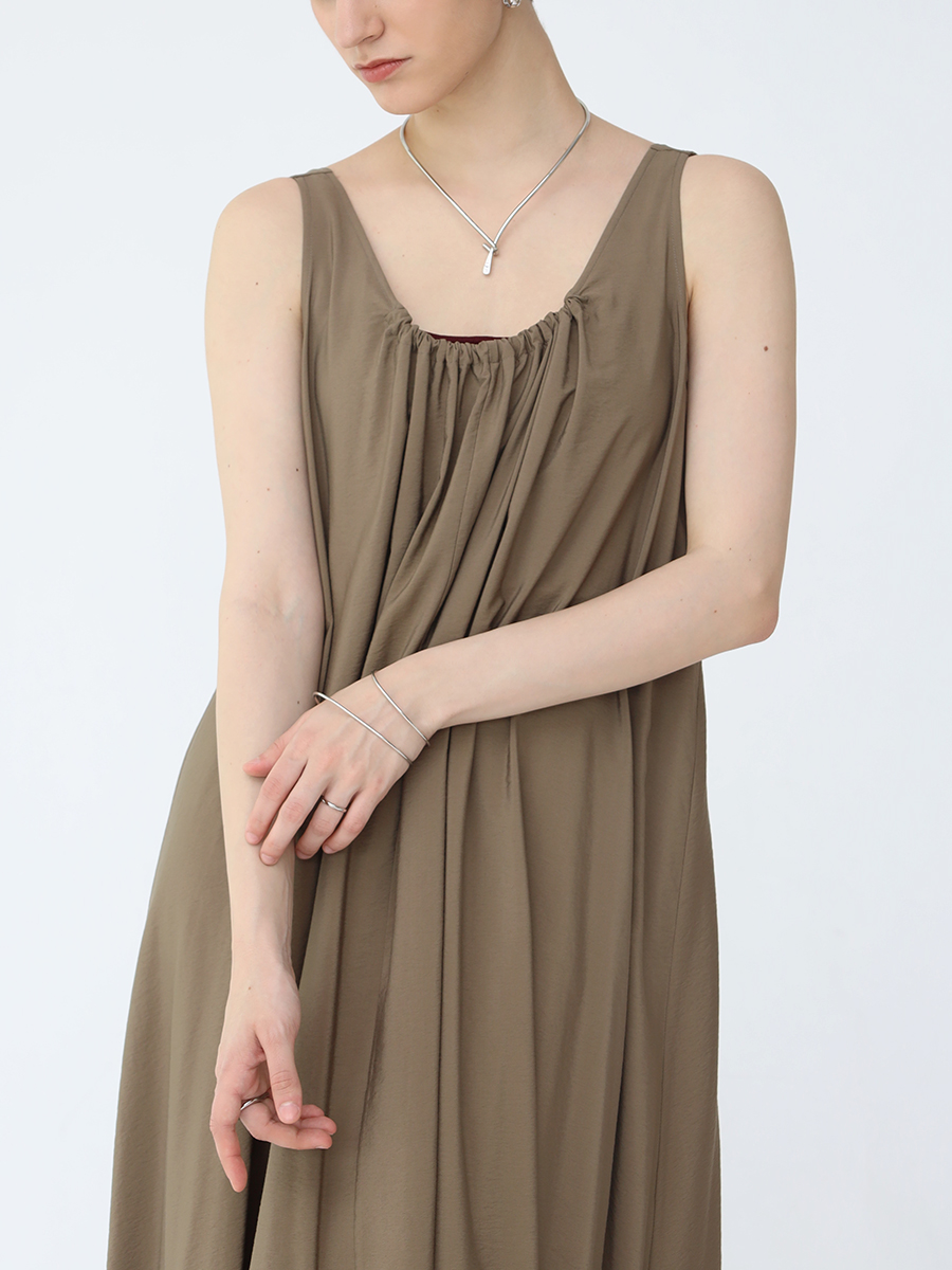柔らかなドレープ感が魅力のノースリーブワンピース。シルキータッチでどこかヴィンテージ感のあるキュプラ× ポリエステル素材。首元はデコルテラインを美しく魅せ、背面にはたっぷりと寄せたギャザーがナチュラルな立体感と優美なシルエットを演出します。