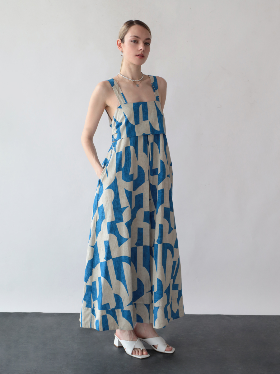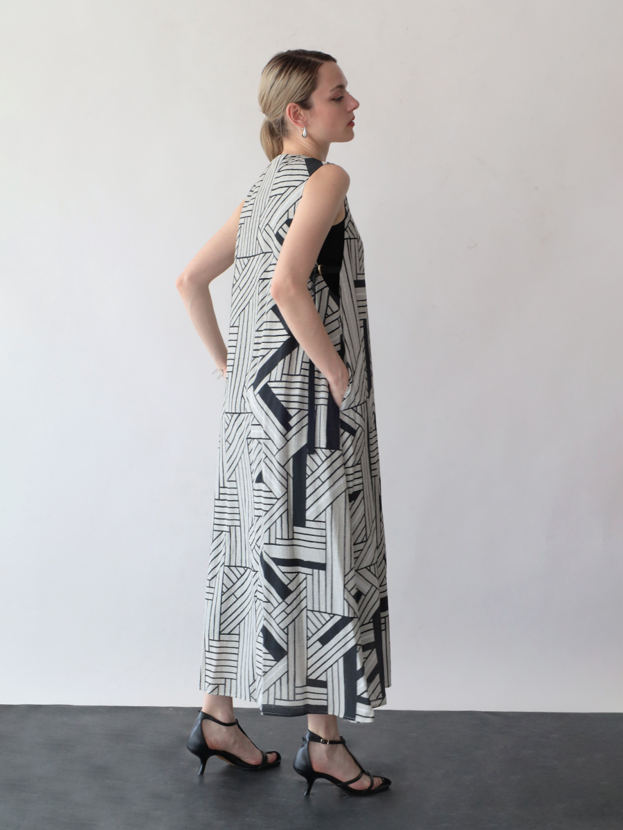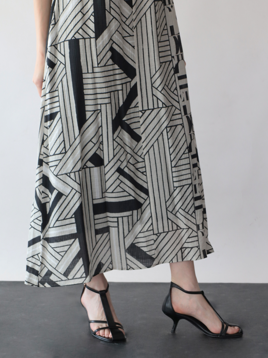 総柄のジオメトリックプリントが映えるAgaの今季おすすめワンピース。ドライタッチな質感とナチュラルな風合いがこのシーズンに心地よい素材。華麗なAラインシルエットが上品かつ様になった目を惹く逸品です。