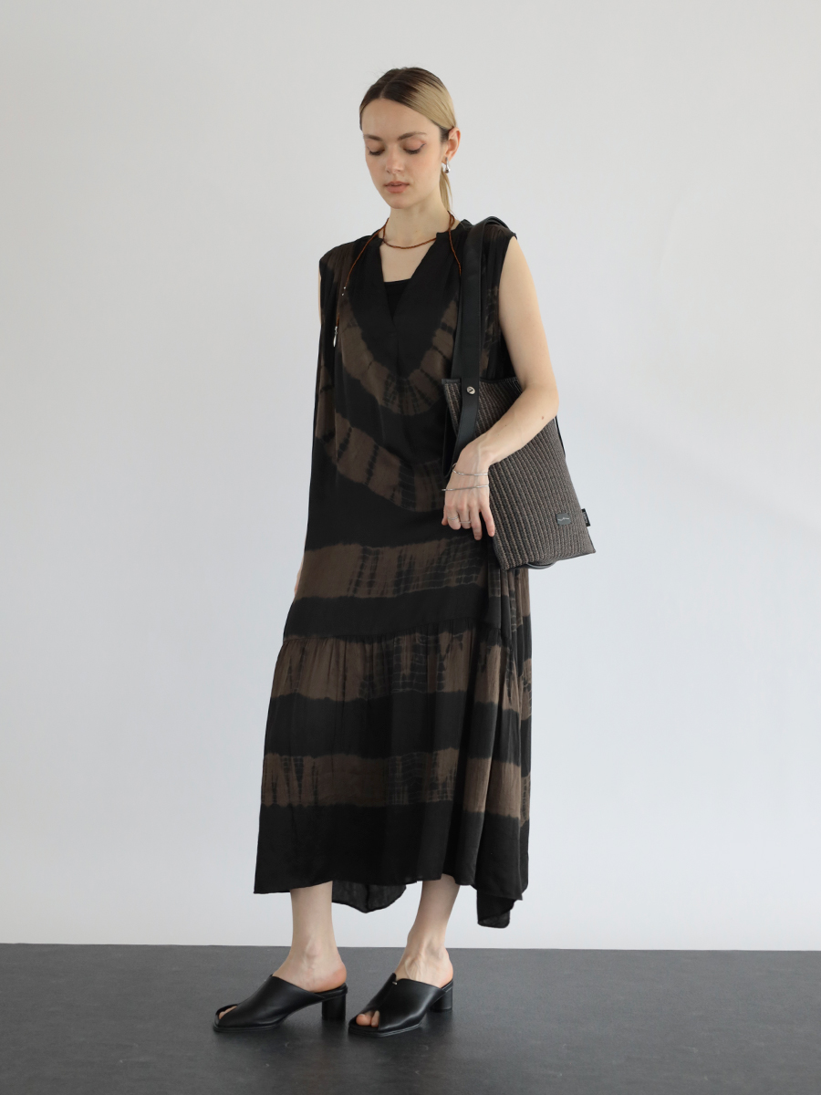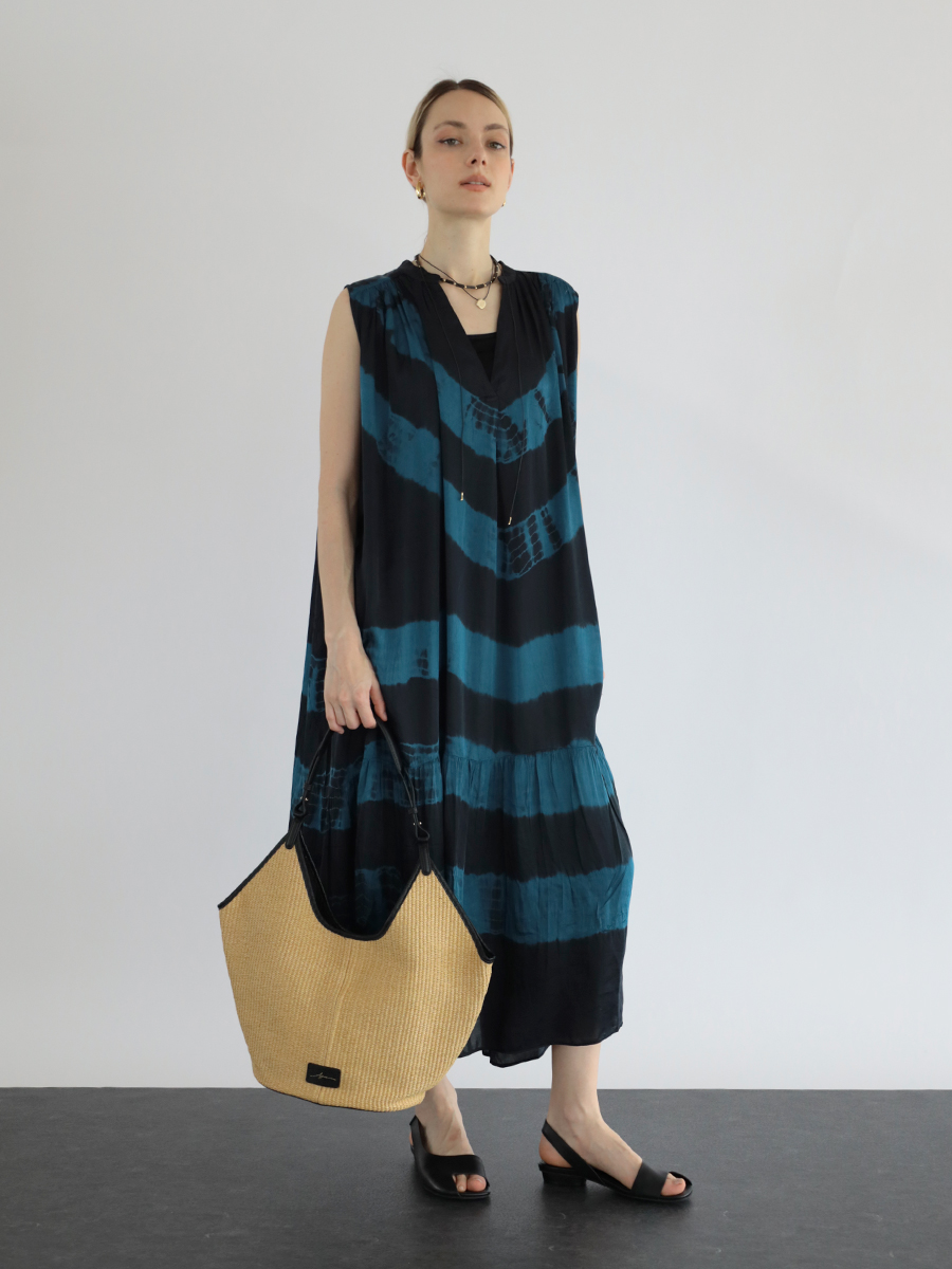 インドでハンドタイダイのプリントを施したタイダイ柄が目を惹く着映えワンピース。ドレープと美しい光沢感で上品なリゾートムード漂うサテン地に、人の手で一点一点染め上げたAgaオリジナル素材。リラクシーなシルエットに対して、首元は深めのVネック、肩回りは細かなギャザーですっきり見えを叶える計算されたデザインです。