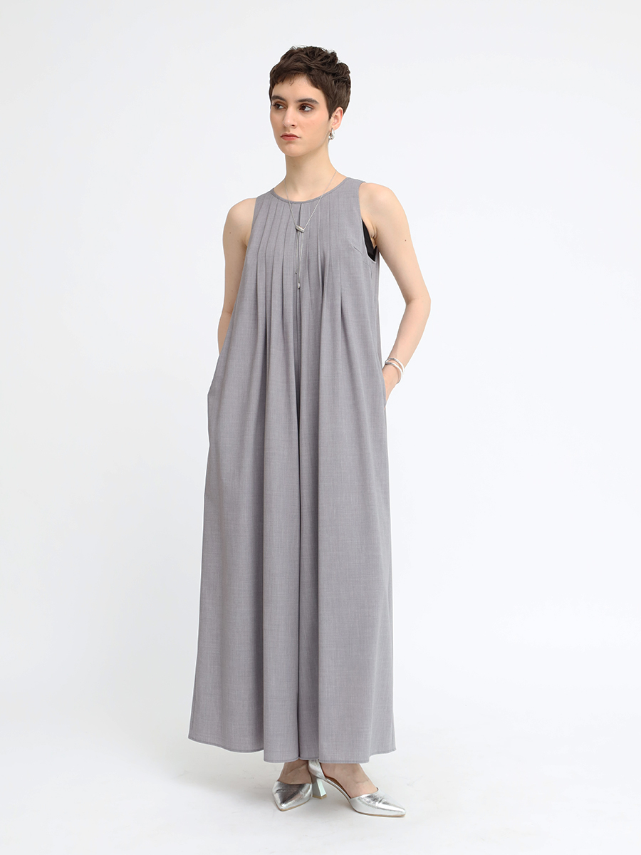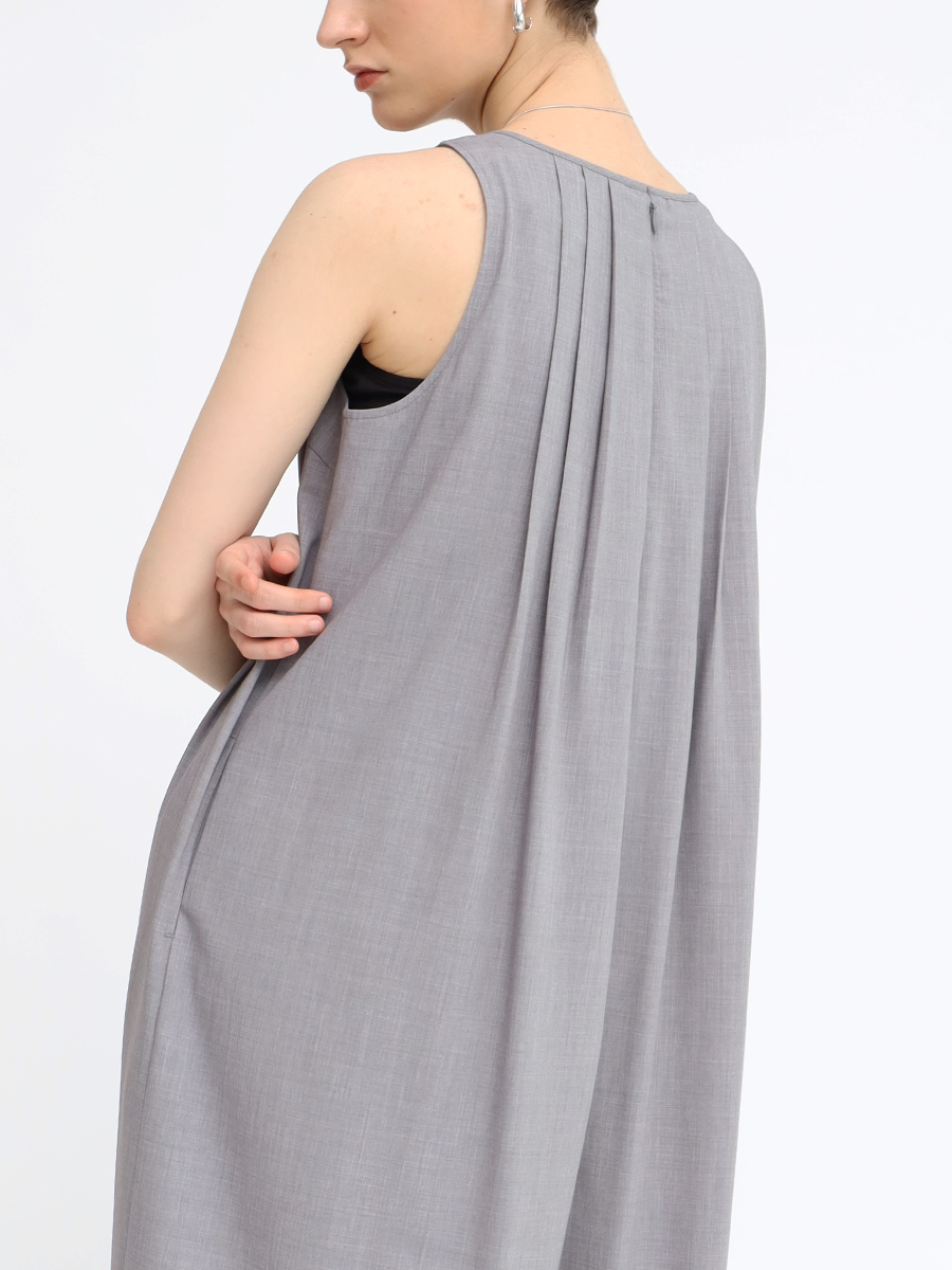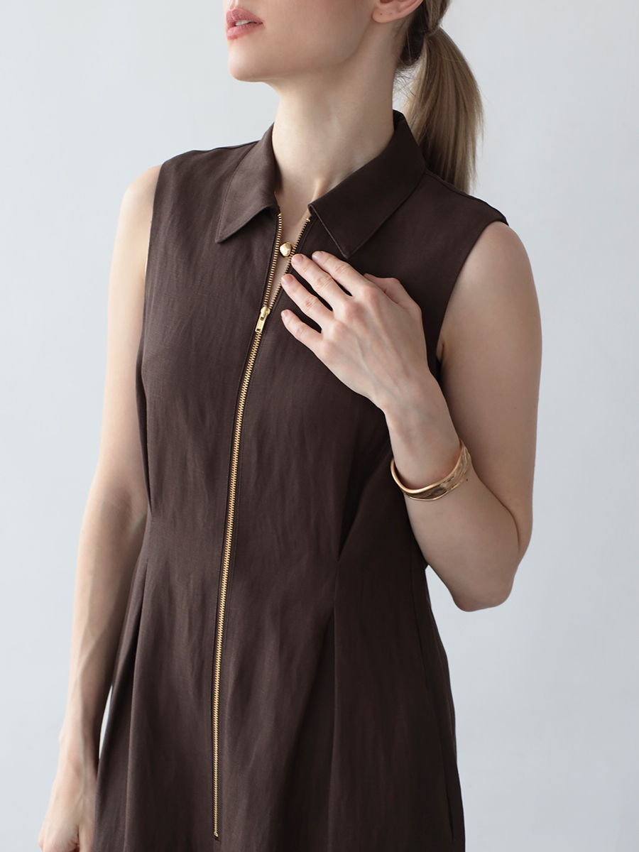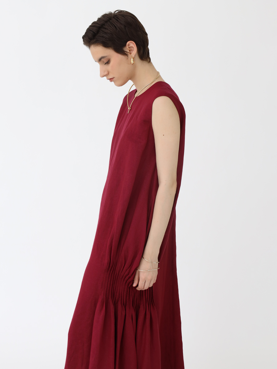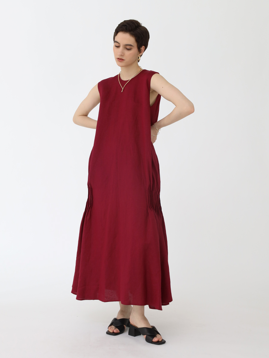 ソフトでドレープの綺麗なレーヨンとスラブ感が特徴の麻を使用した混紡素材。通気性が良く、表面に出した麻特有のナチュラルな風合いがシーズンムードを高めてくれます。デサイドのピンタックデザインが1枚のノースリーブワンピースにアクセントと立体感をもたらす着映えワンピースです。