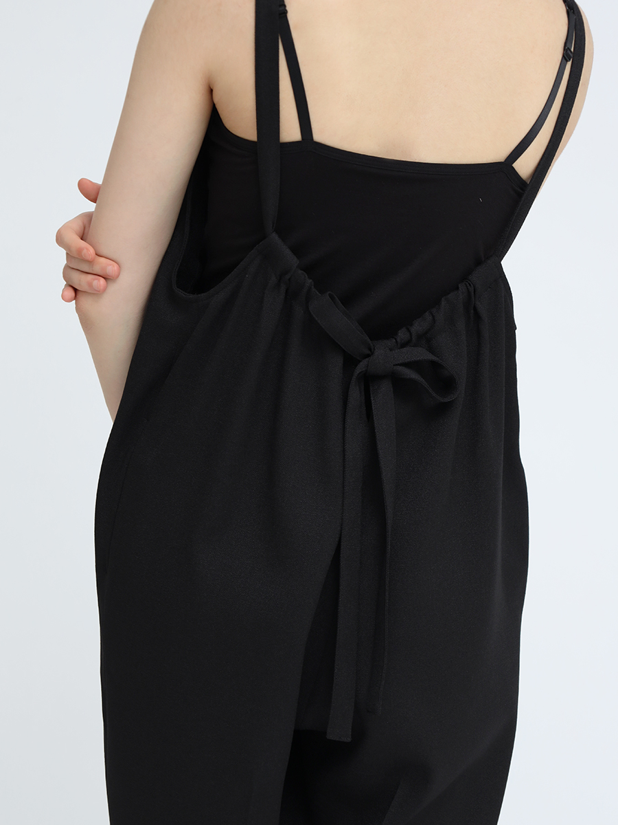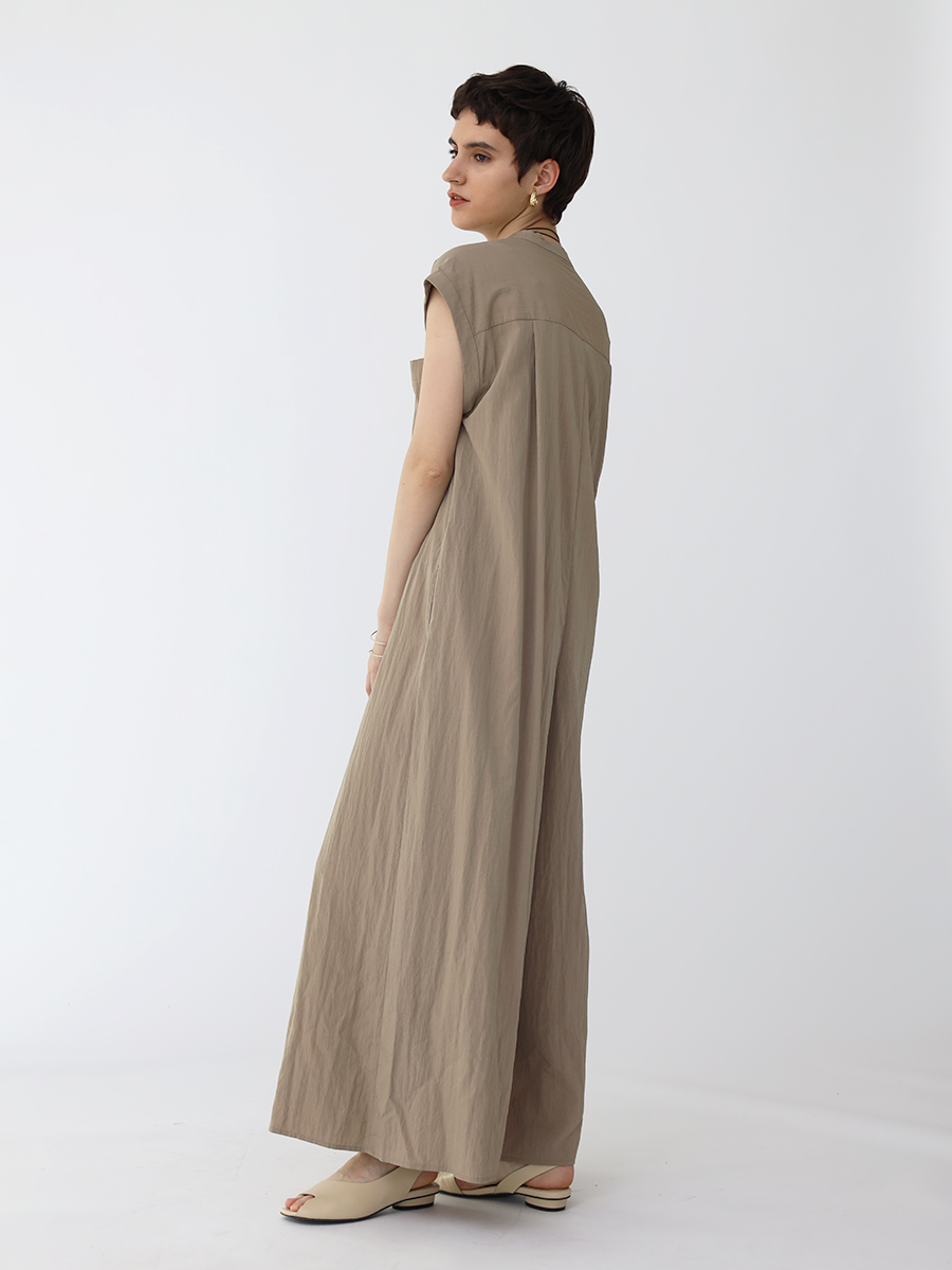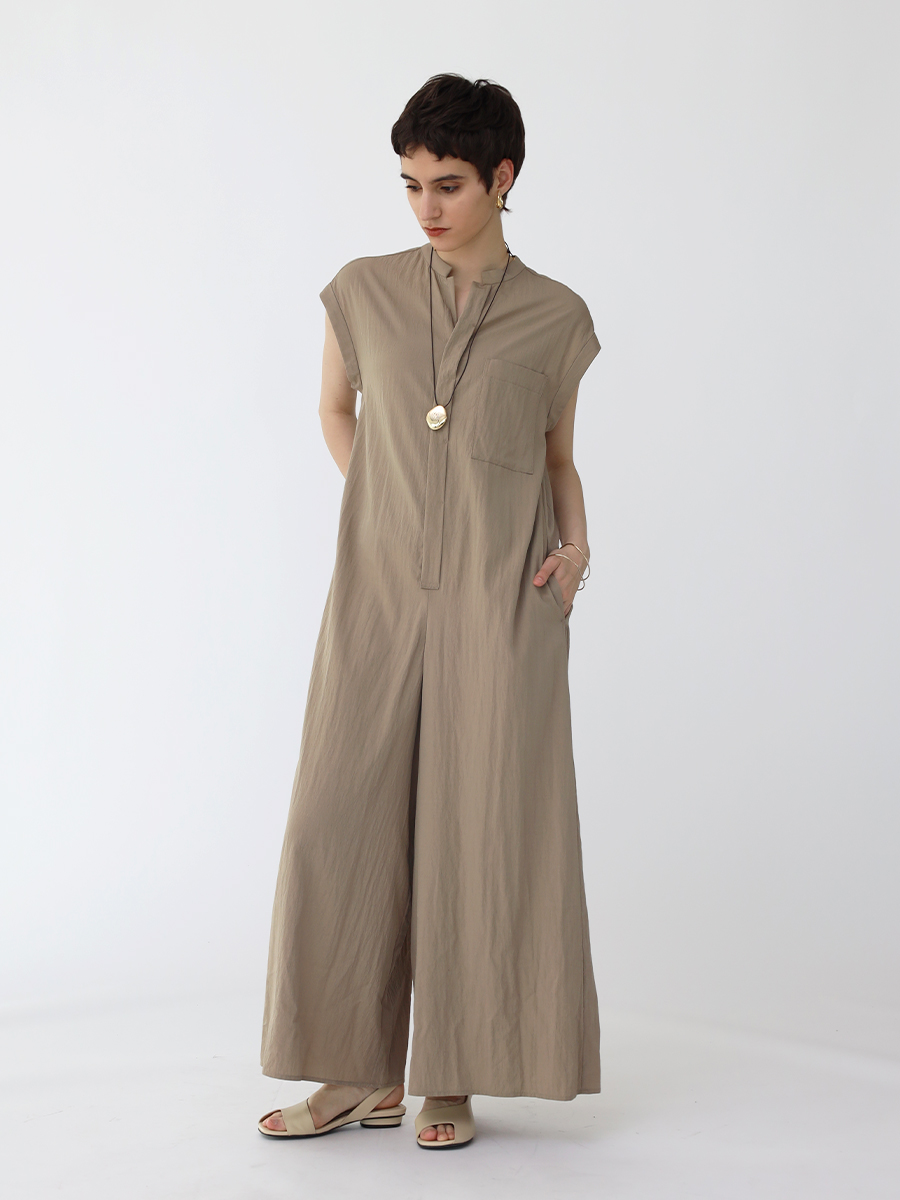 胸元や背後に入ったプリーツがアクセントとなるオールインワン。ゆとりある身頃がボディーラインを拾わずリラクシーな着心地ながらも、見た目はすっきりとスタイルアップを叶えます。レーヨン混のしなやかさと上質感に優れ、程よいハリがシルエットを綺麗に保つ混紡生地。シワになりづらく、さらっと清涼感ある薄手生地がこれからの季節手に取りやすいアイテムです。