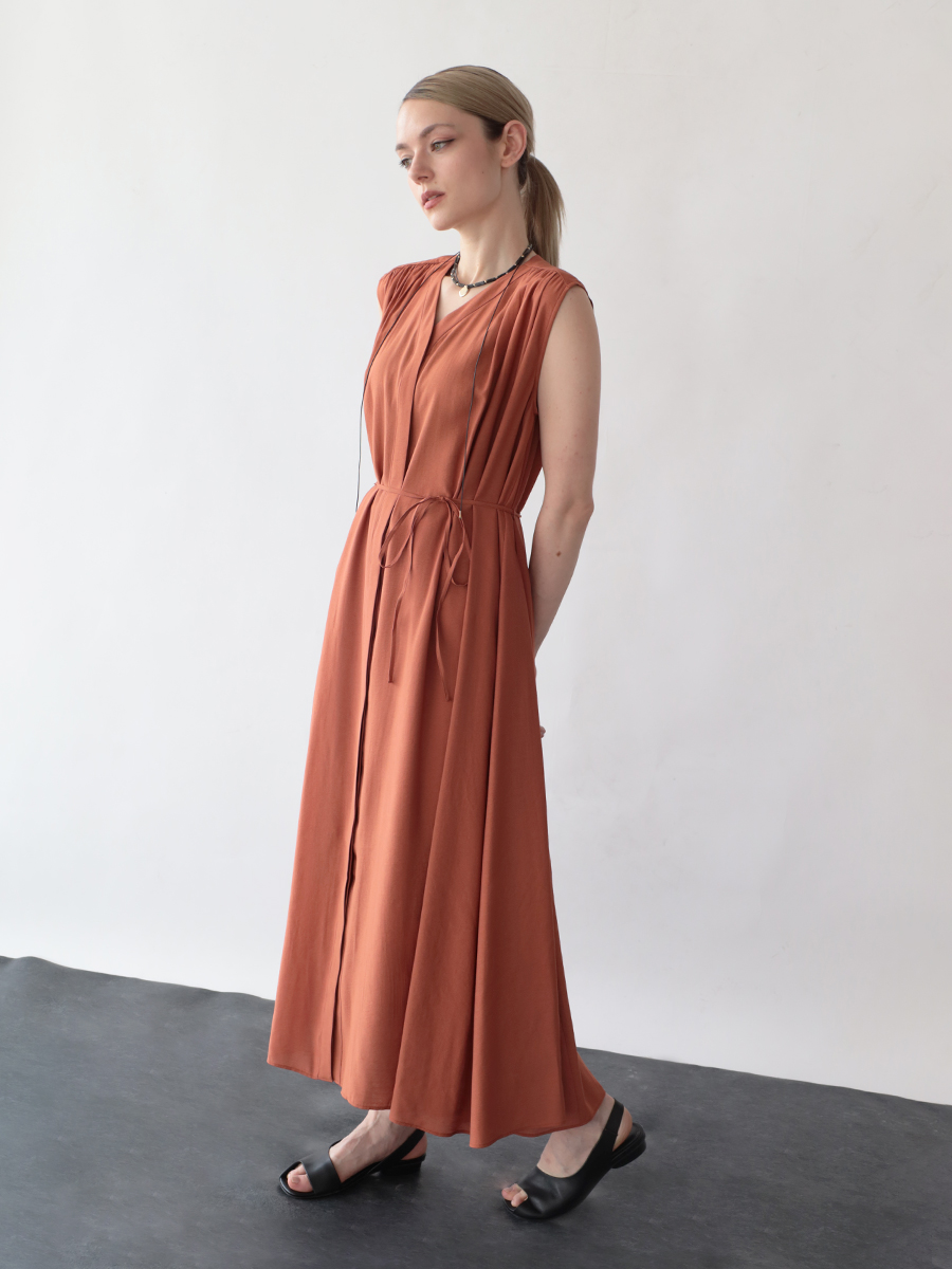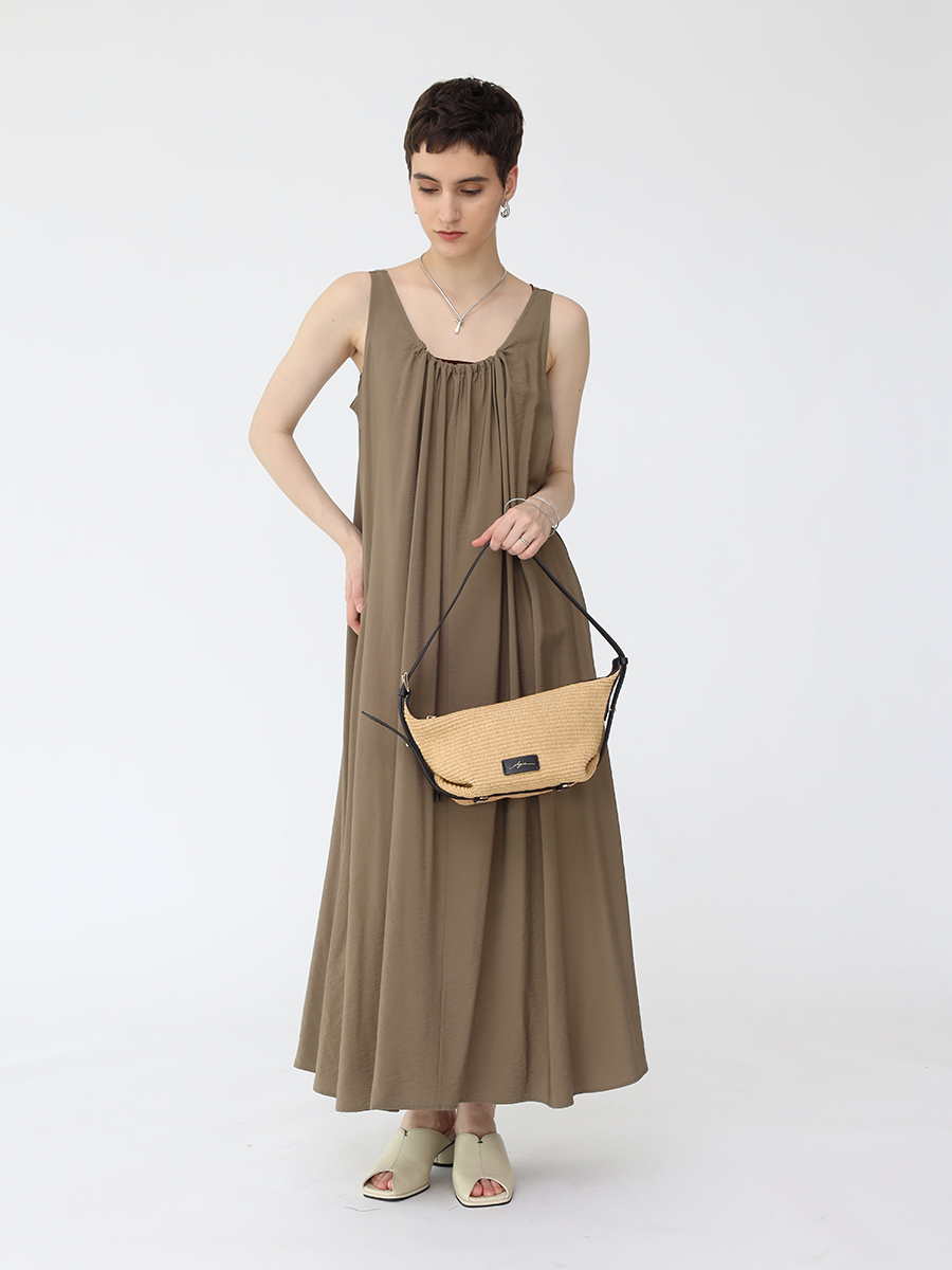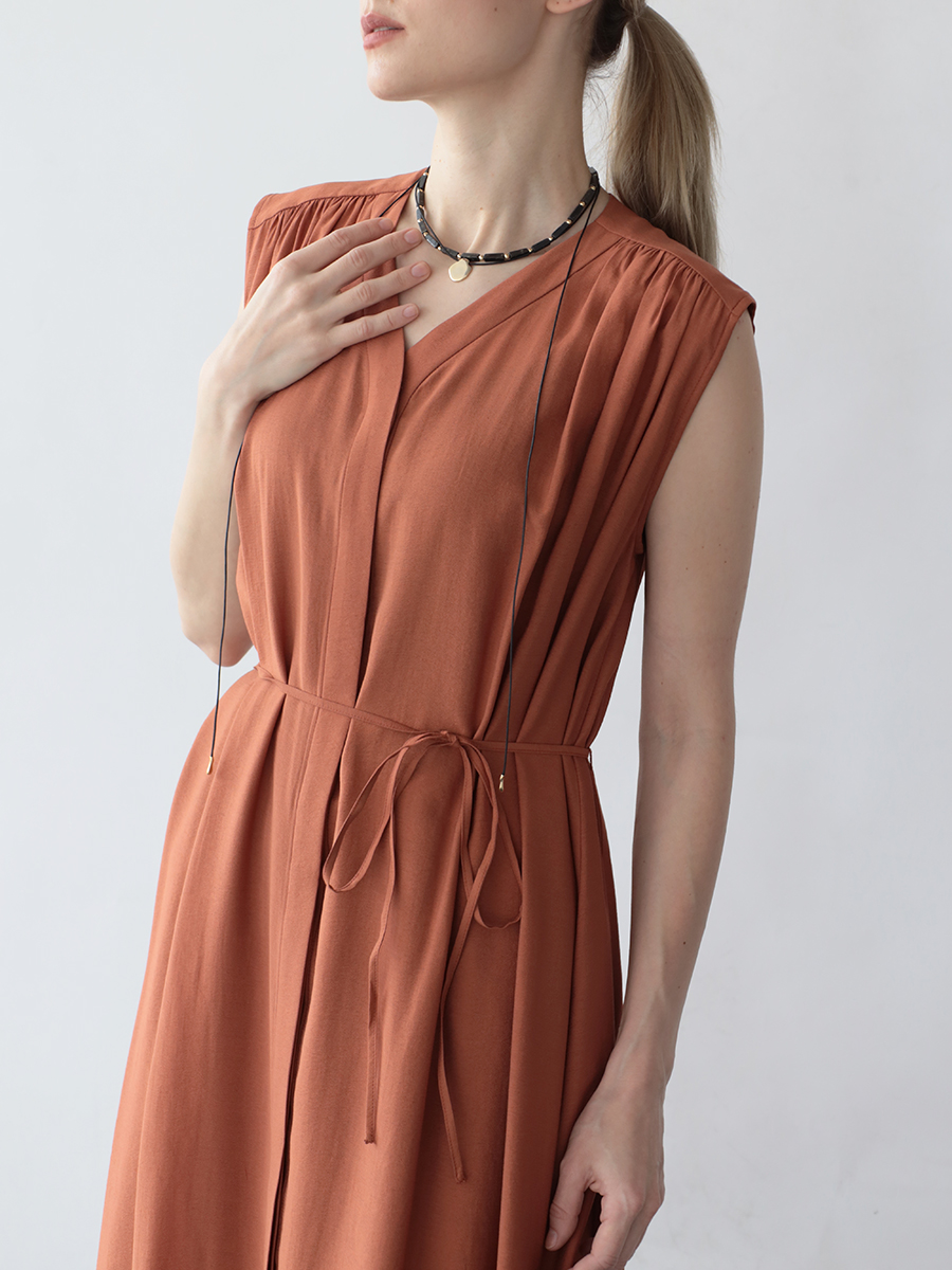 柔らかなドレープ感が魅力のノースリーブワンピース。ソフトでドレープの綺麗なレーヨンに、綿のナチュラル感と程よいハリをプラスした凹凸感が特徴の素材。たっぷりと寄せたギャザーがナチュラルな立体感と優美なシルエットを演出します。