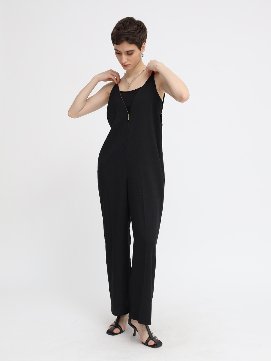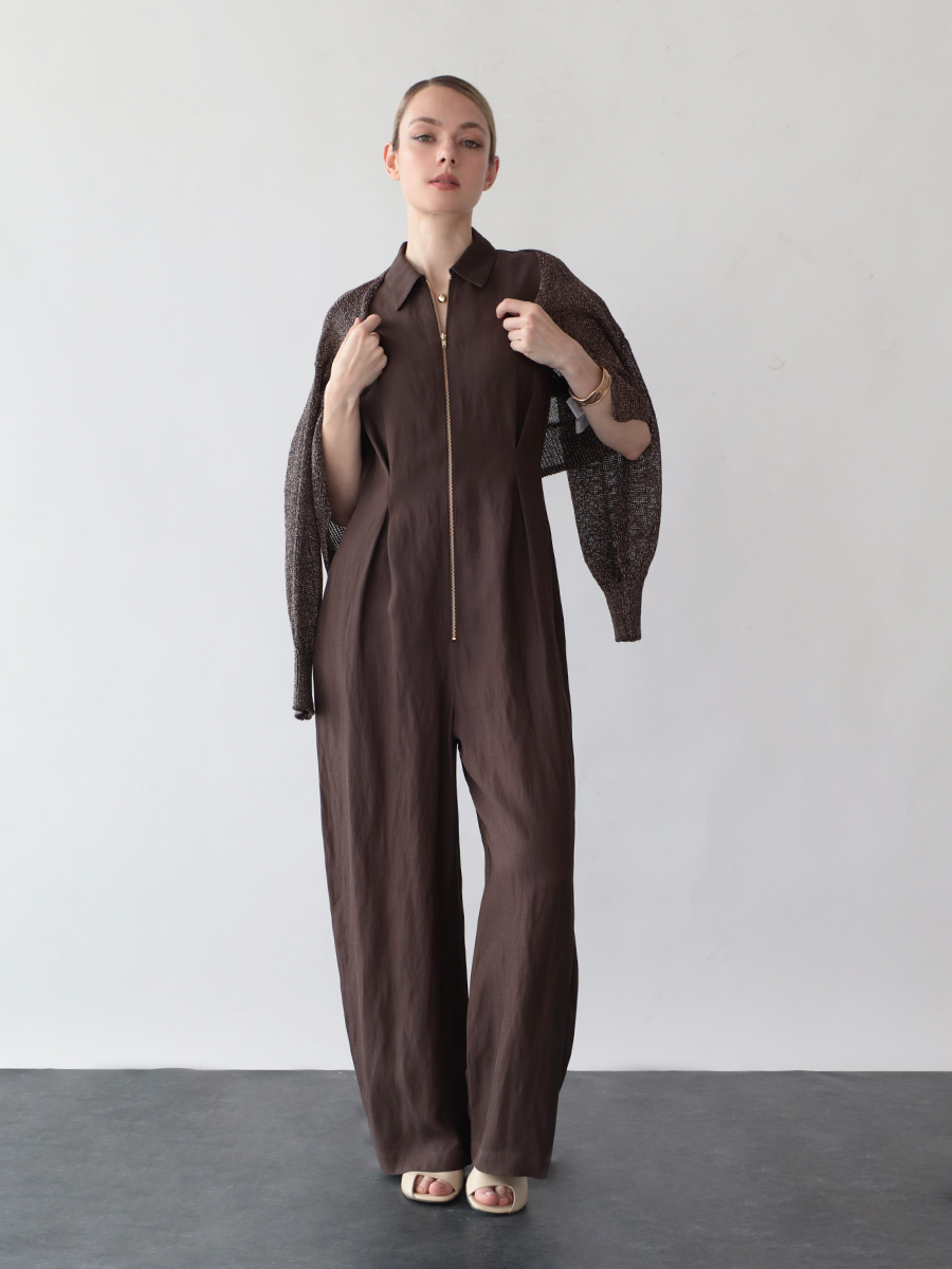 胸元チャックを施した緻密なディテールの新しいデザインに肩紐を調節できるバックリボンが女性らしさをプラスしたオールインワン。麻のようなナチュラル感と、ドライな風合いの麻調合繊。濃淡表現豊かなメランジ糸を使用しツイーディでシャリ感のある風合いが特徴です。