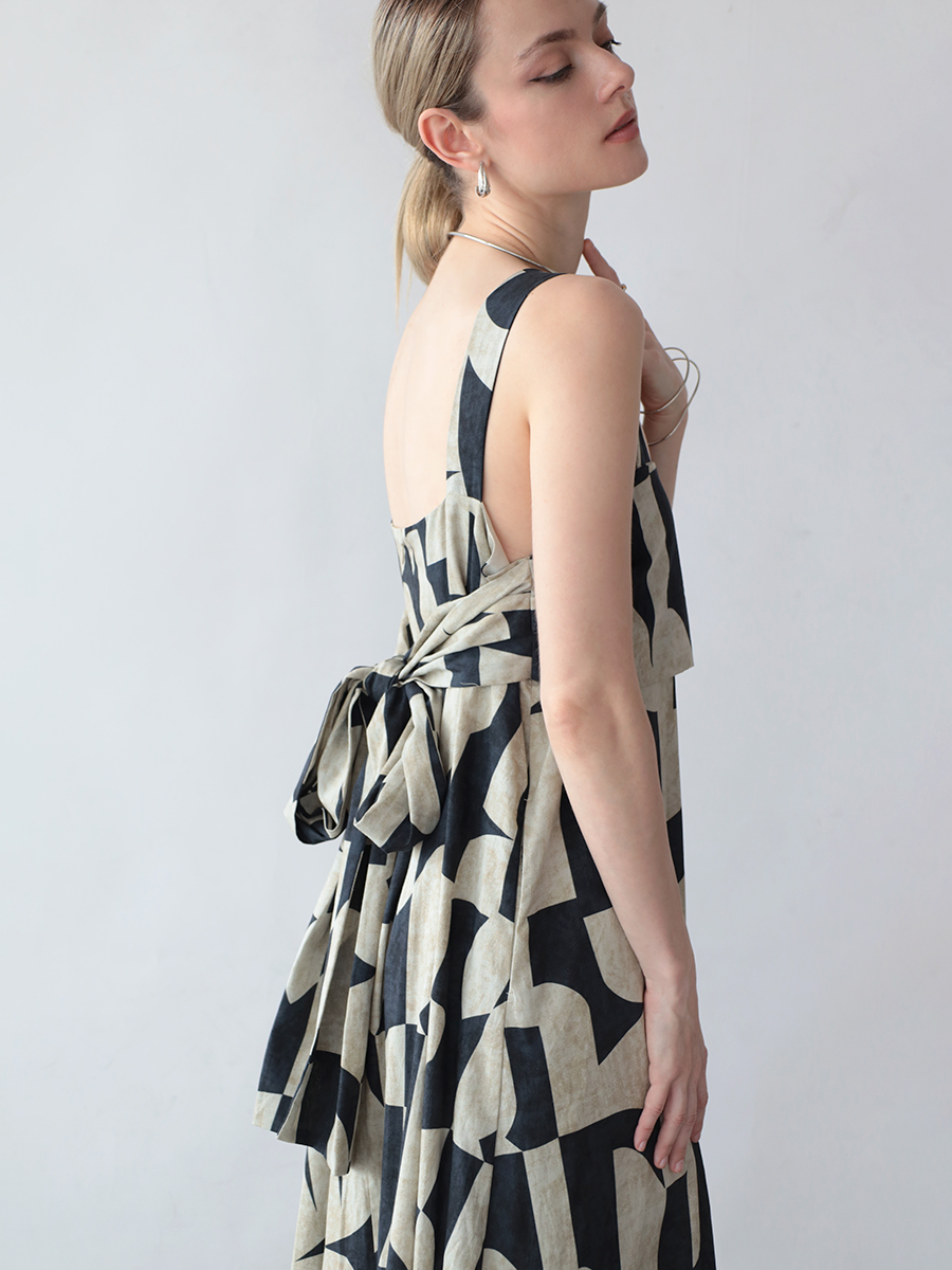 昨年大好評だった幾何学柄ワンピースが今季新色でブラッシュアップ。着心地の良さを後押しする吸湿性・吸水性に優れた再生繊維と綿の混紡素材に加え、軽やかでなびくような美しいドレープ性も魅力。ウエスト位置にはバックリボンを取り入れ、自然なスタイルアップを叶えるだけでなく360度どこから見ても着映えが叶います。