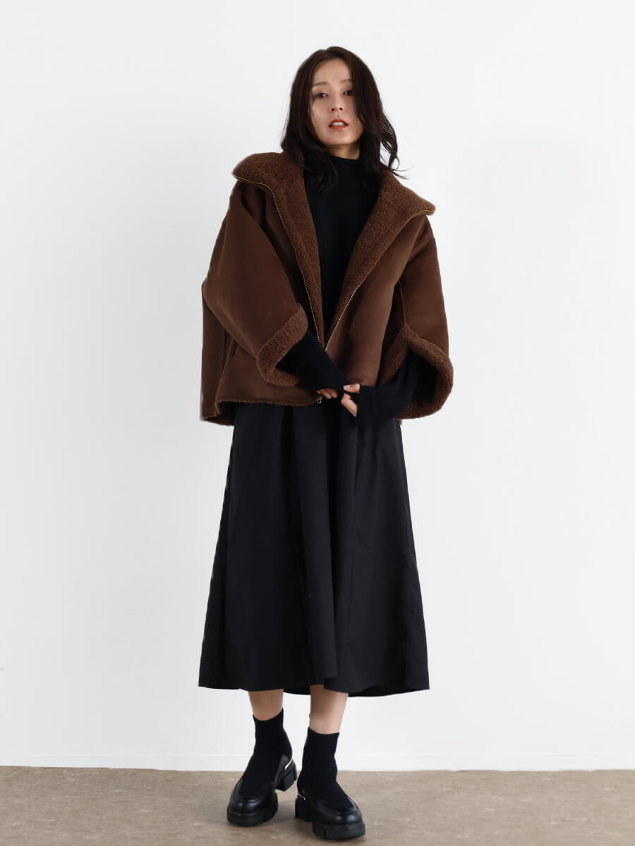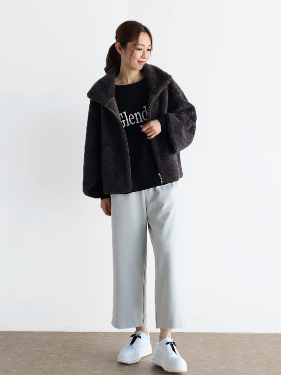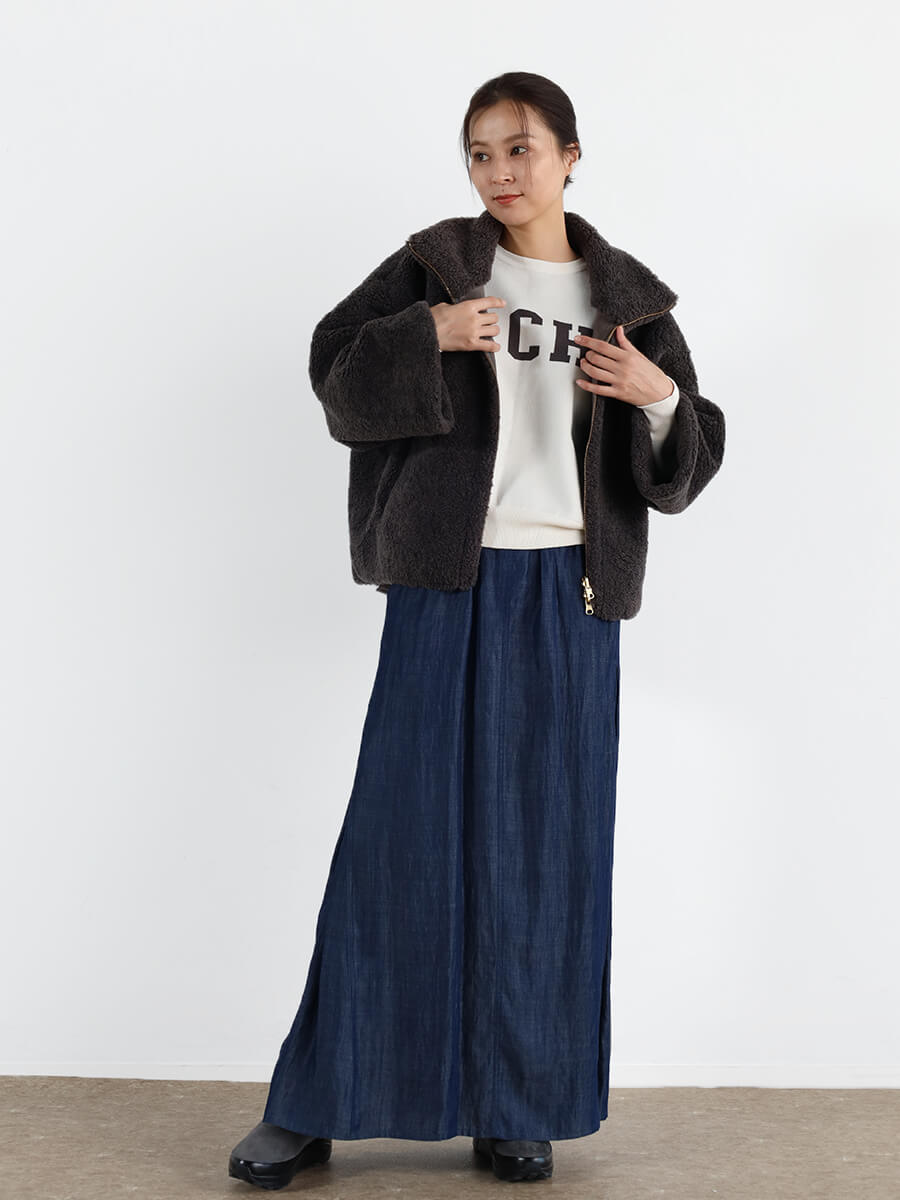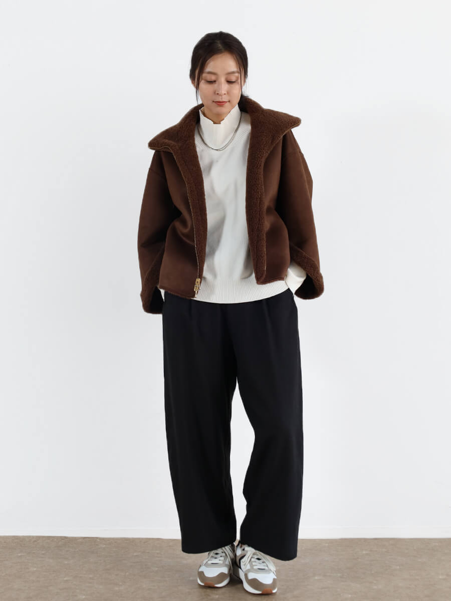 異素材ミックスのアウターが、温かみと質感のコントラストを演出。