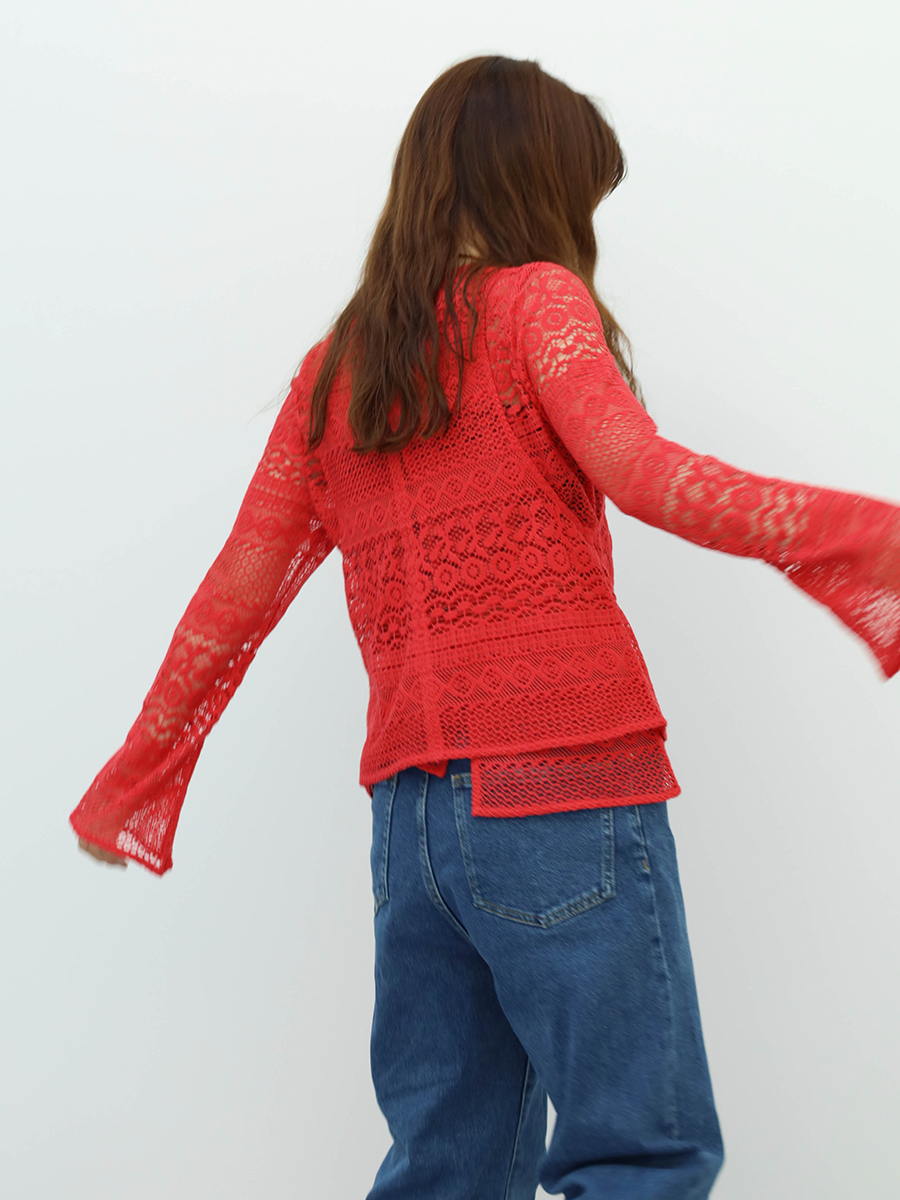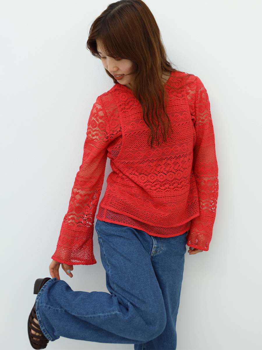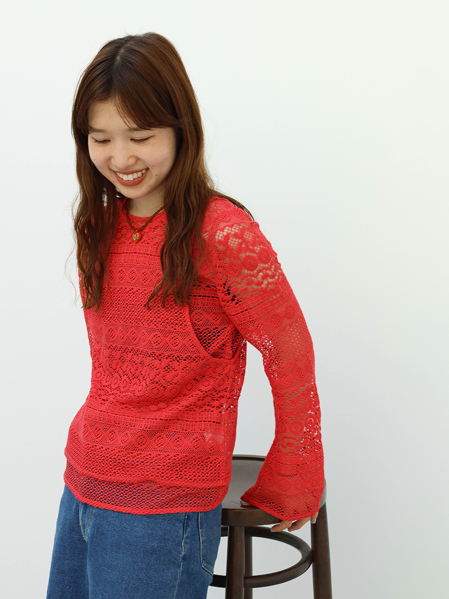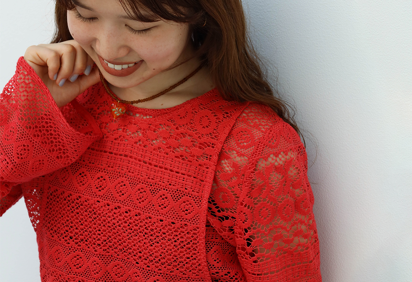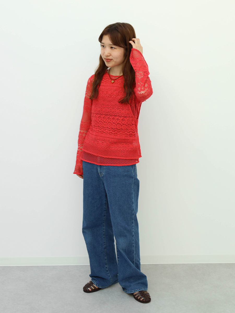 鮮やかなレッドカラーが主役のレイヤードコーデ。赤のトップスはデニムと好相性で、メリハリのあるスタイリングに仕上がります。同素材でレイヤードすることで統一感が生まれ、初めての方でも取り入れやすいバランスに。首元にも赤のネックレスを添え、まとまりのある印象に仕上げました。