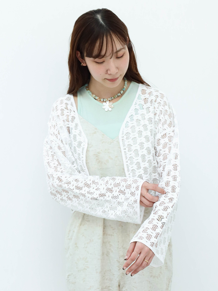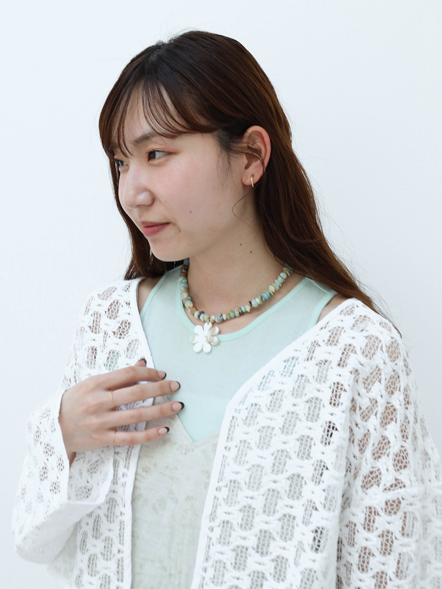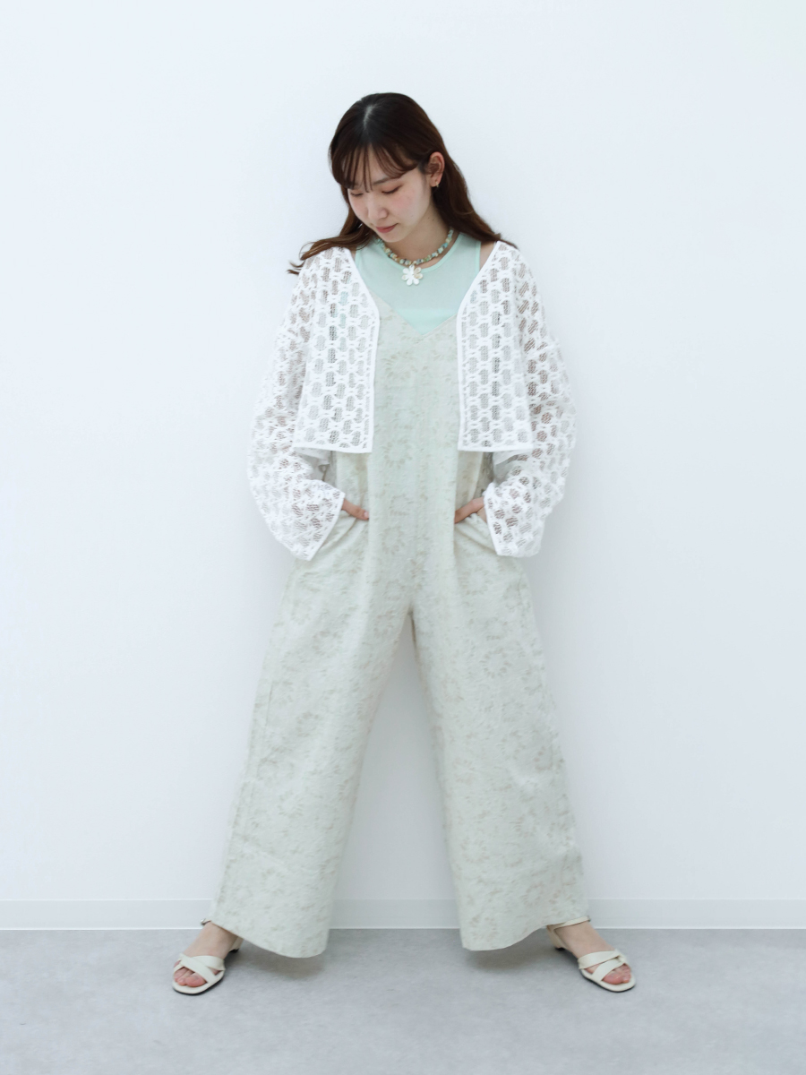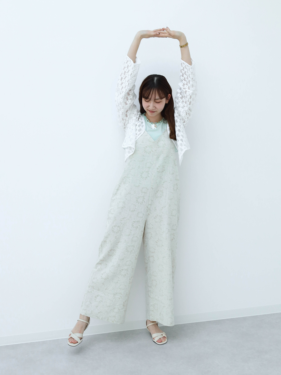 毎年人気のオーバーオールに、爽やかなミントカラーのタンクトップを合わせたシーズンムード高まる着こなし。ラフになりがちなバランスも、首元に存在感のあるネックレスを添えることで、ぐっと引き締まった印象に仕上がります。仕上げにミニマルなレースの羽織を重ねることで、軽やかさとこなれ感をプラスしました。