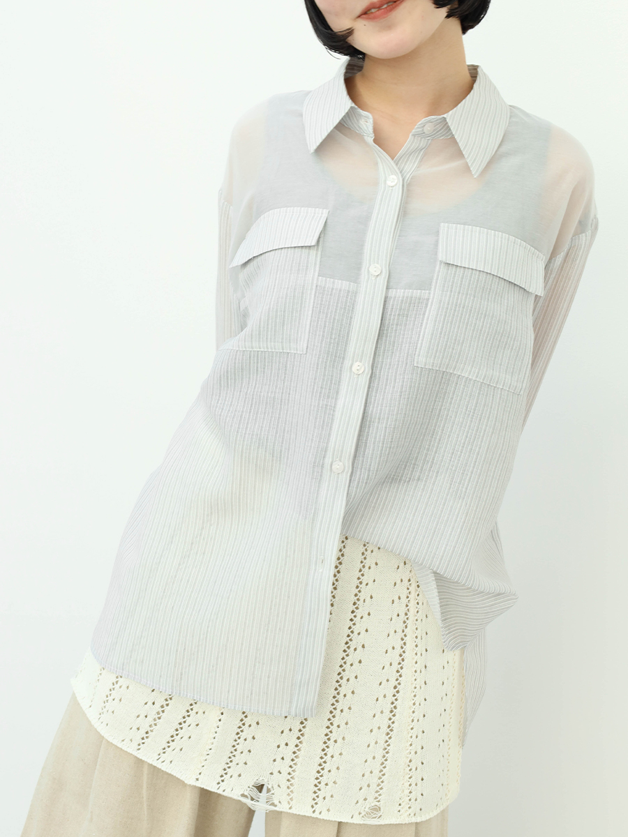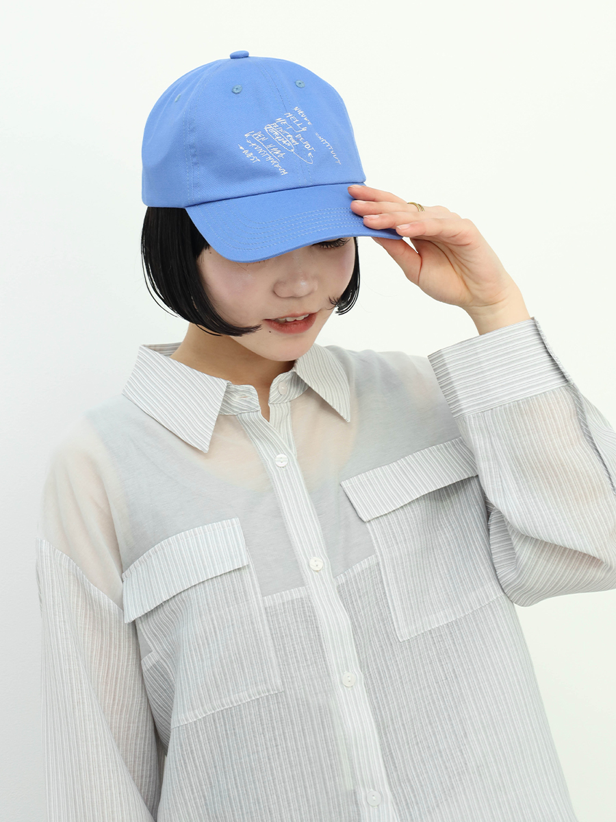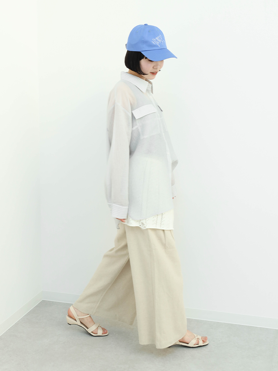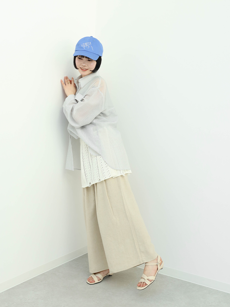 鮮やかなブルーのキャップをアクセントにしたコーデ。シアー感のあるストライプシャツが軽やかな印象をプラスします。ニット素材のラップスカートをレイヤードすることで、FIKA.らしいナチュラルなムードに。
