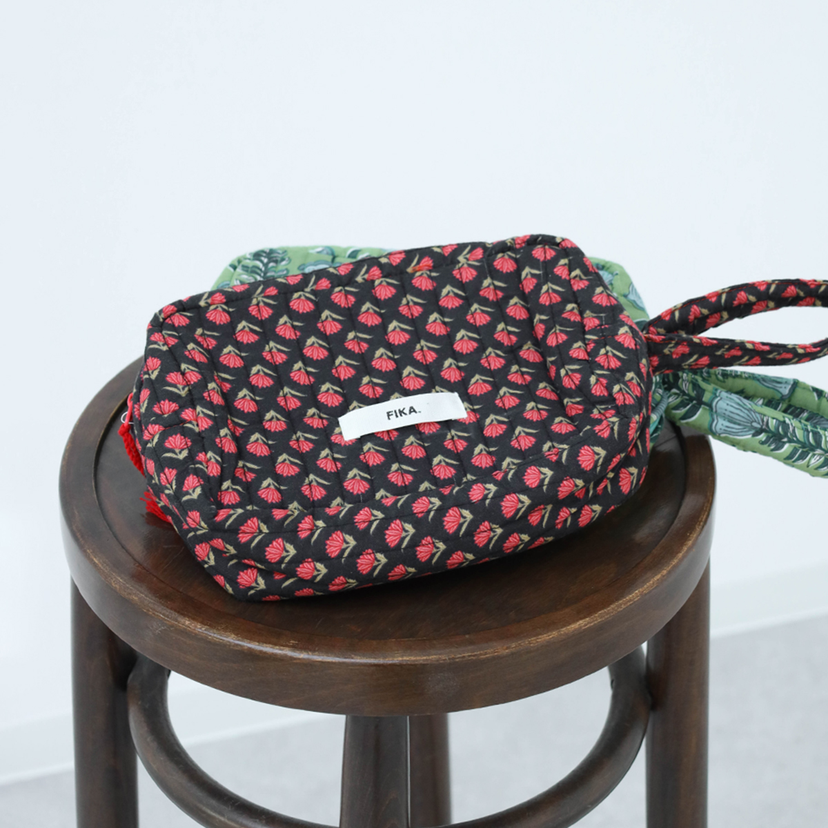 FIKA.スタッフがサイズ感から生地選定までこだわり抜いたノベルティポーチ。インドに伝わる伝統技法「ブロックプリント」により、職人の手作業で1枚ずつ柄を刷り上げています。インクのかすれや柄の揺らぎが生む、手仕事ならではの奥行きある風合いが魅力です。