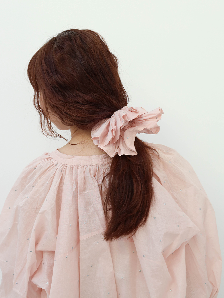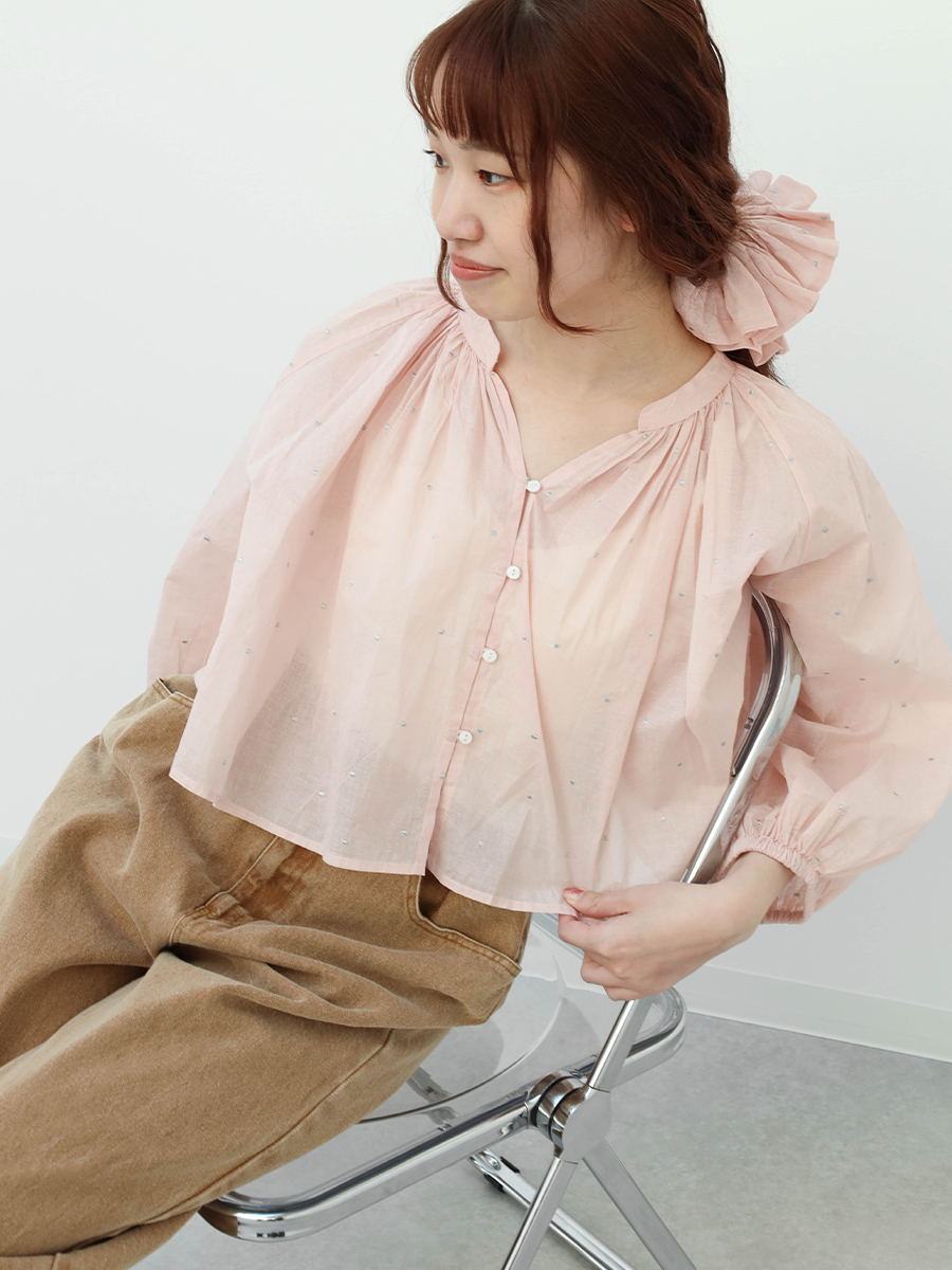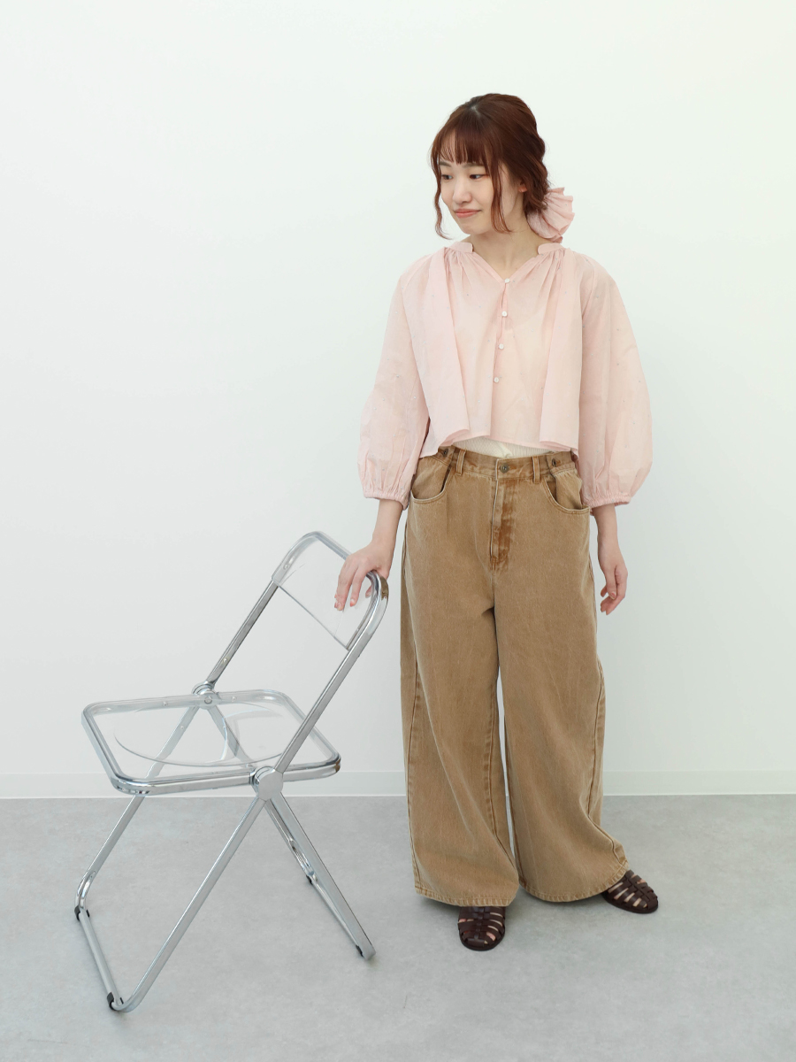 春らしい色合いが目を惹くスタイリング。さりげないスクエアドットの刺繍と、ボリューム感のあるスリーブが華やかさを演出します。ベージュのカラーデニムは絶妙な色味で、1本あると着回しに重宝するアイテム。同素材のシュシュを合わせ、さりげなくリンクした仕上がりに。