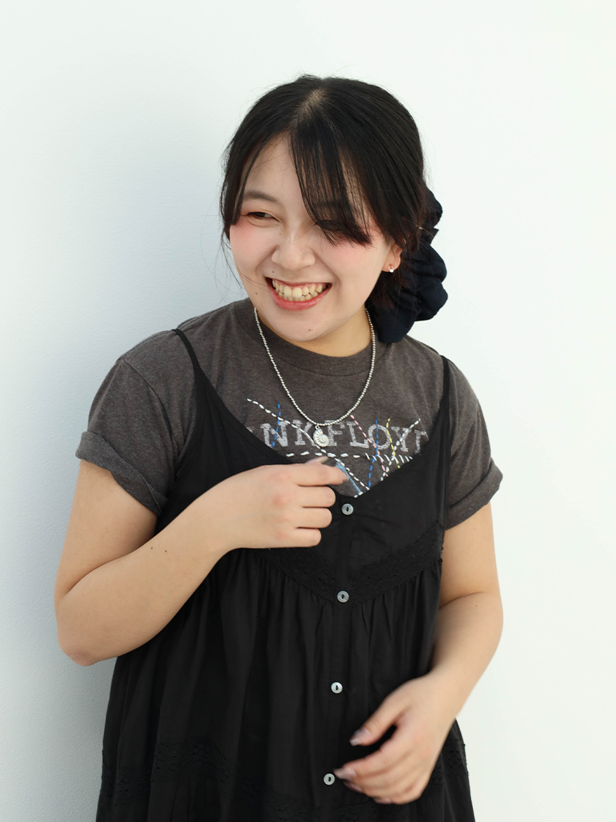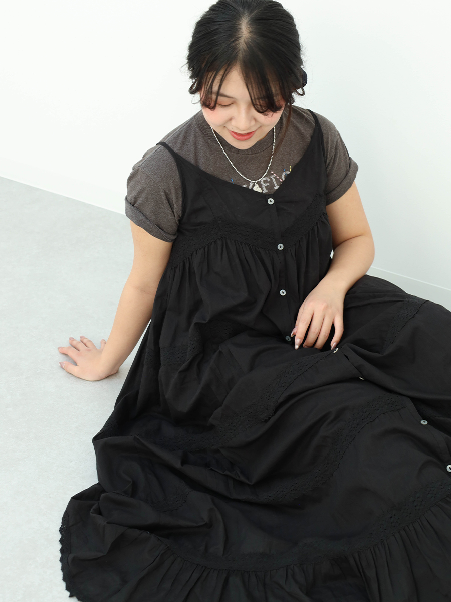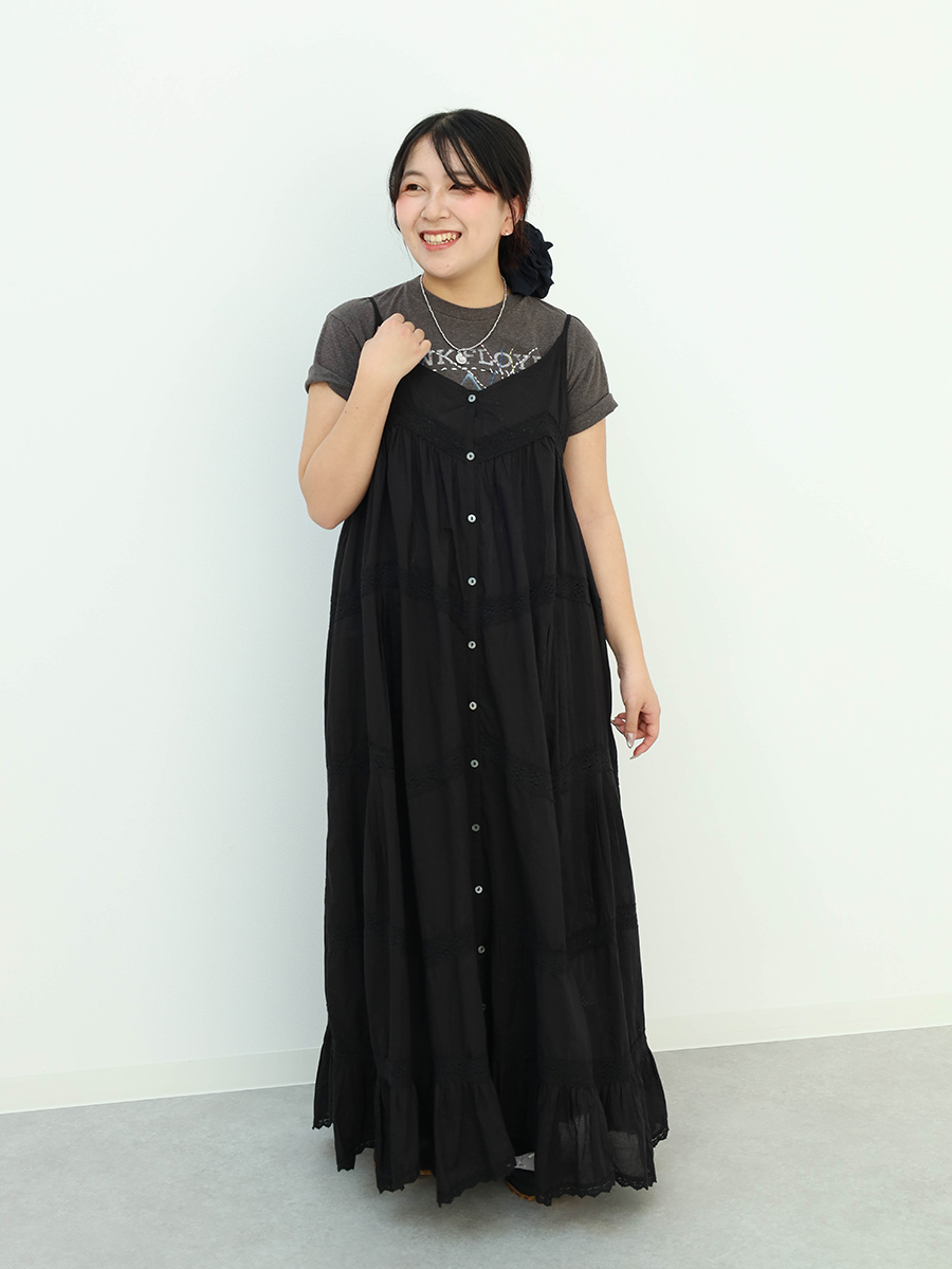 動くたびにふんわり揺れるコットンワンピースが主役。ヴィンテージ感のあるTシャツに重ねて、ほどよくカジュアルな印象に。存在感のあるシュシュをプラスし、360度どこから見ても目を惹く着こなしに仕上げました。