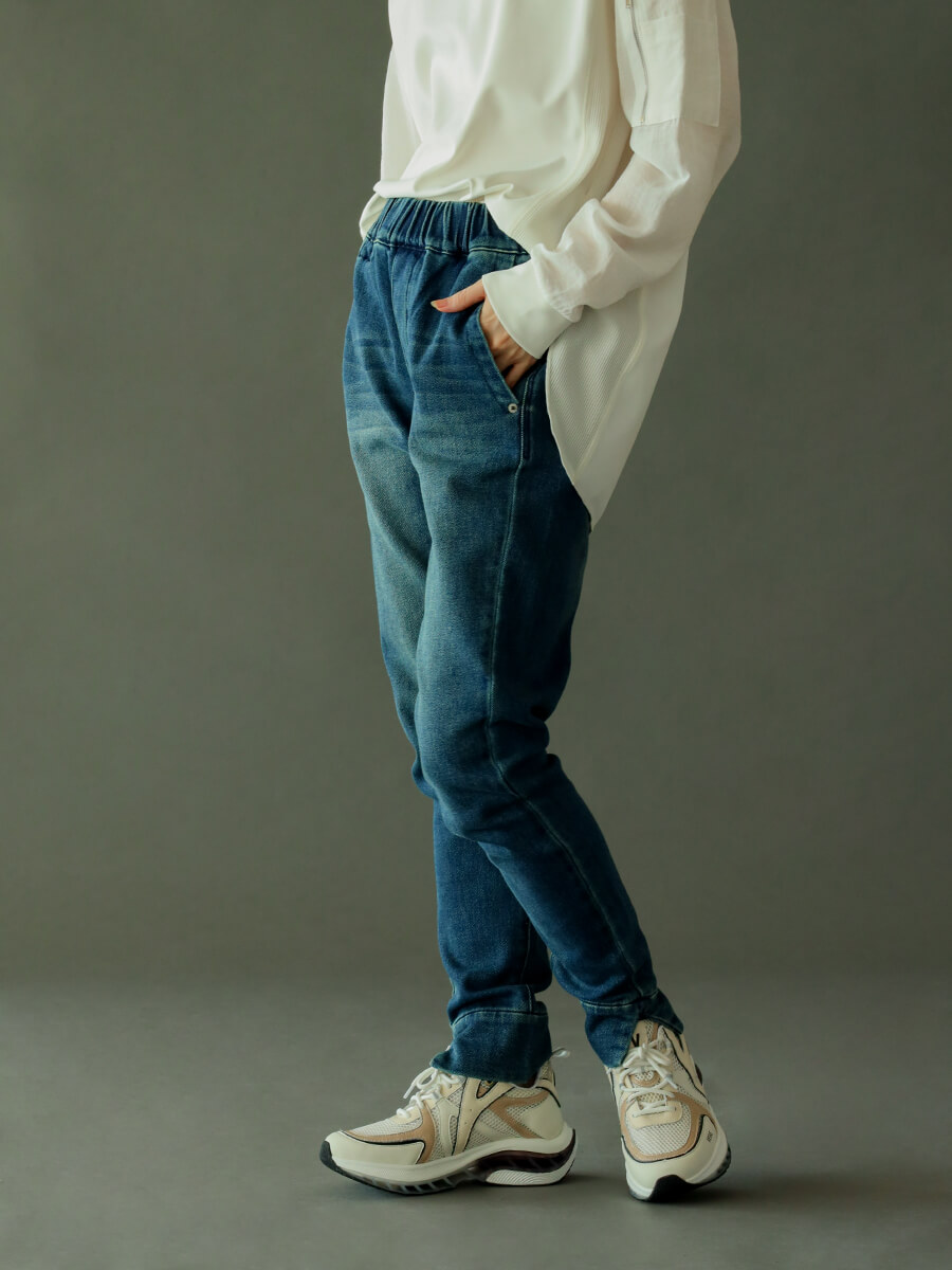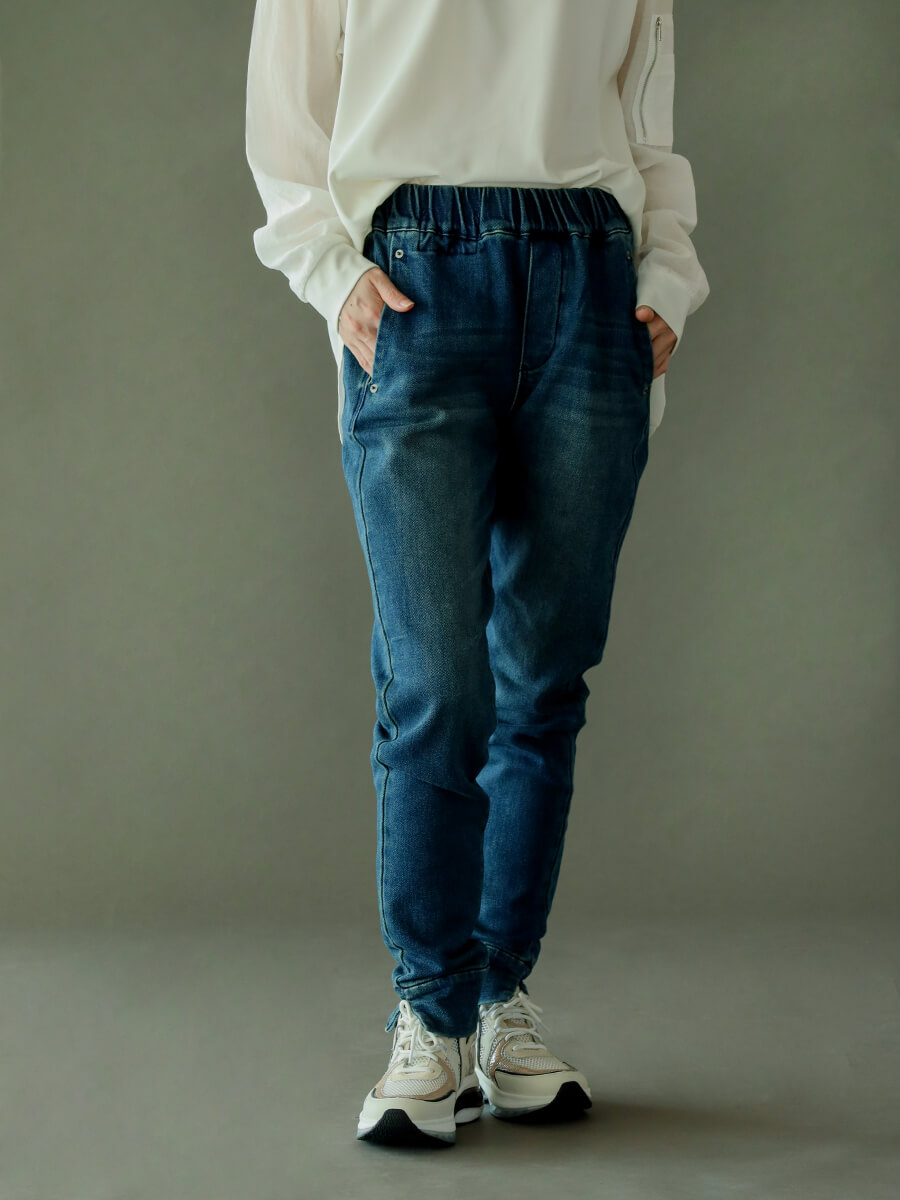 伸縮性のあるストレッチデニムを使用し、快適な穿き心地を実現。