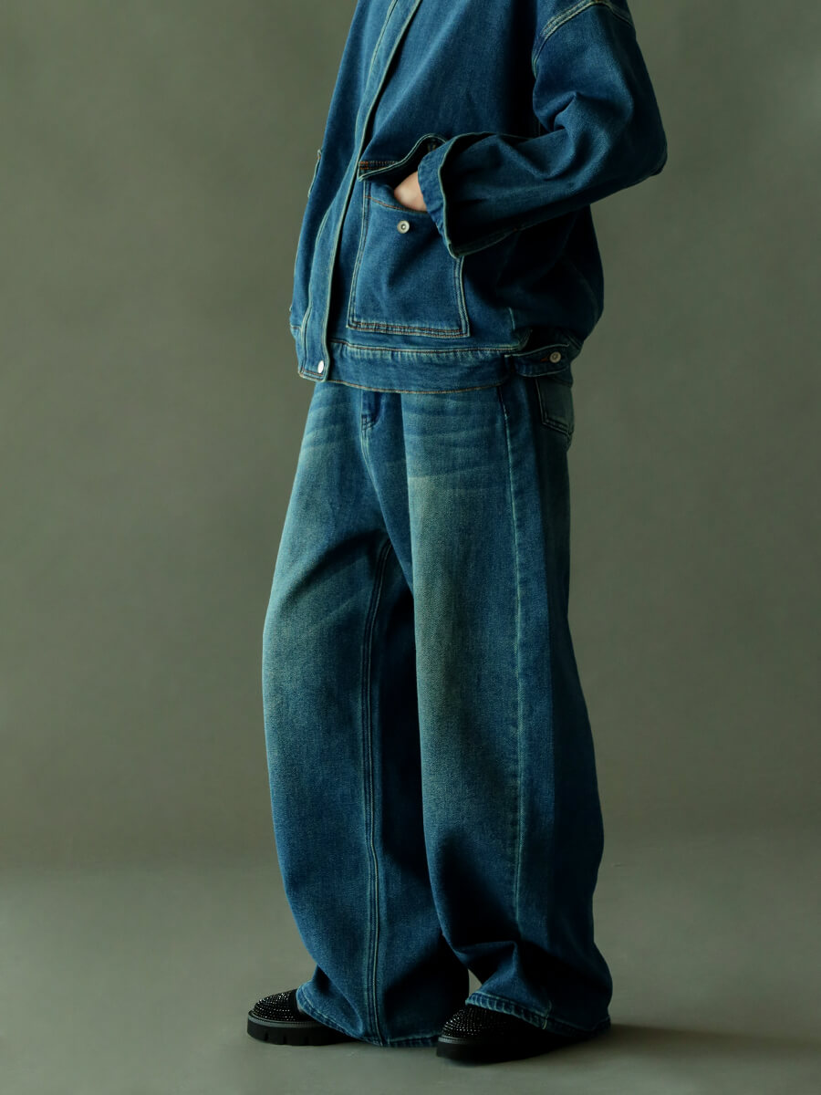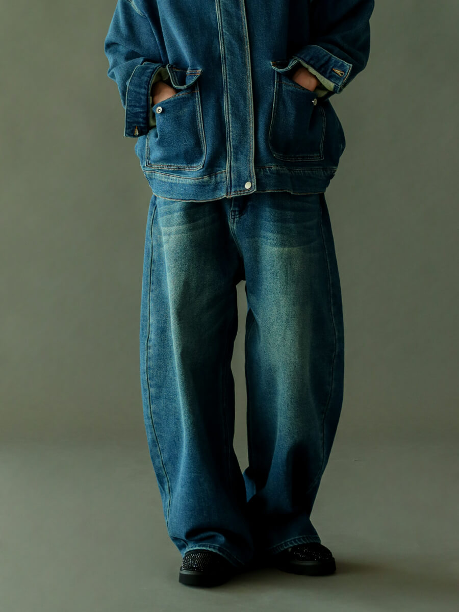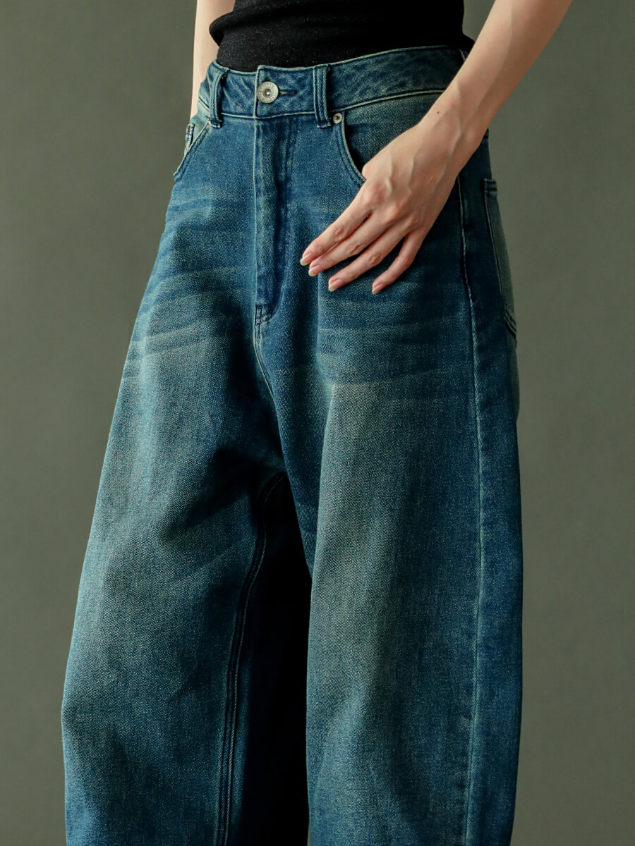 ヴィンテージ感のある色合いと、カーブラインが魅力のデニムパンツ。