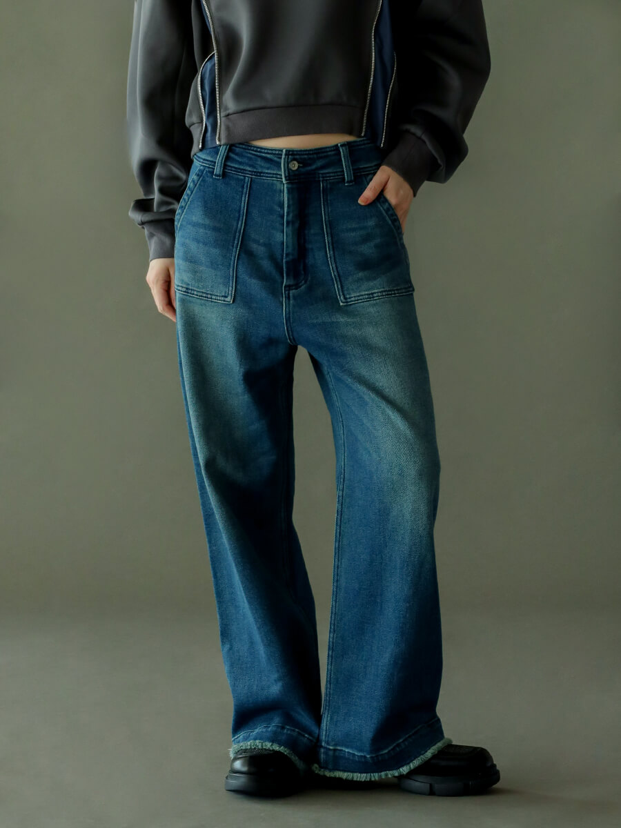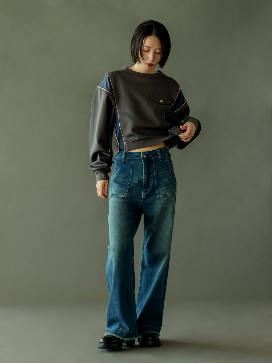 ヴィンテージライクなデザインが魅力のカットオフワイドデニムパンツと