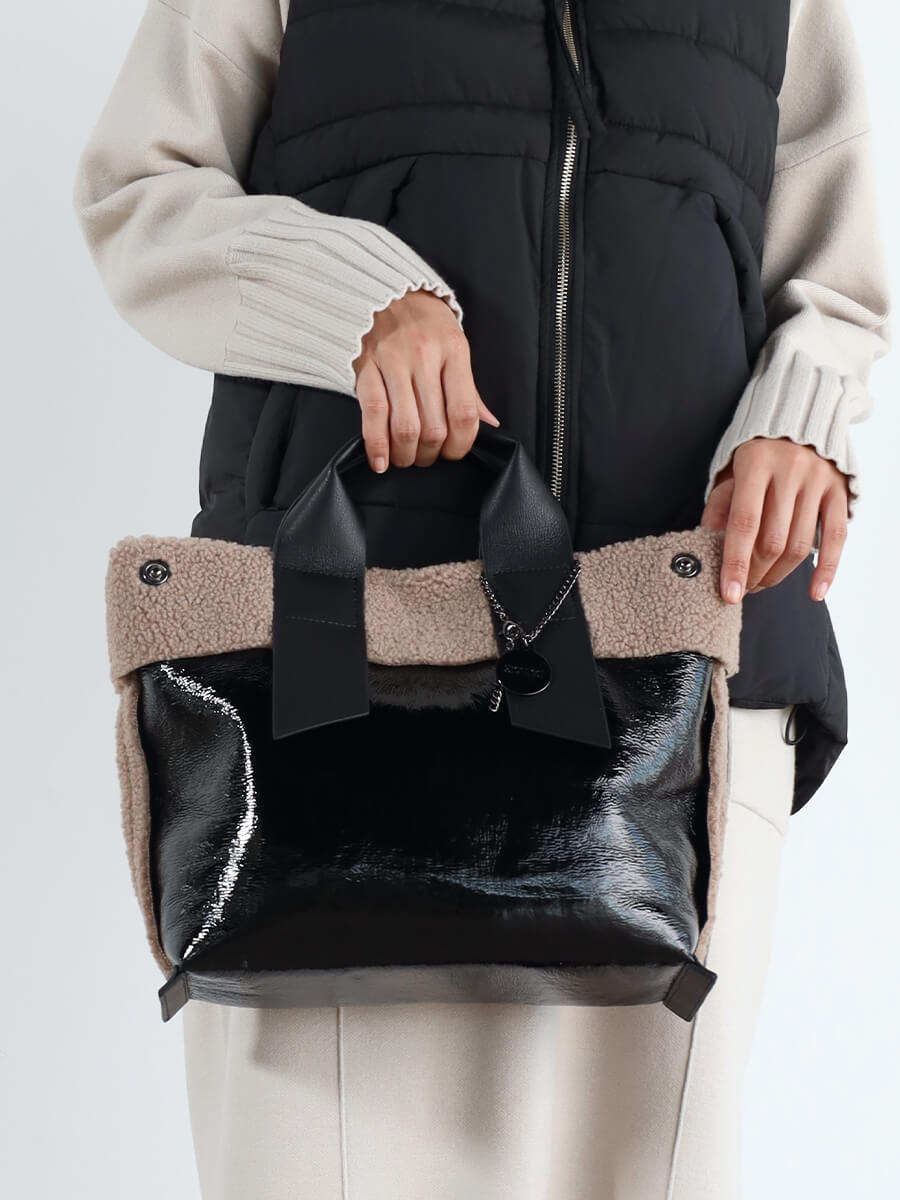 ボア素材にツヤ感のあるエナメルを組み合わせ