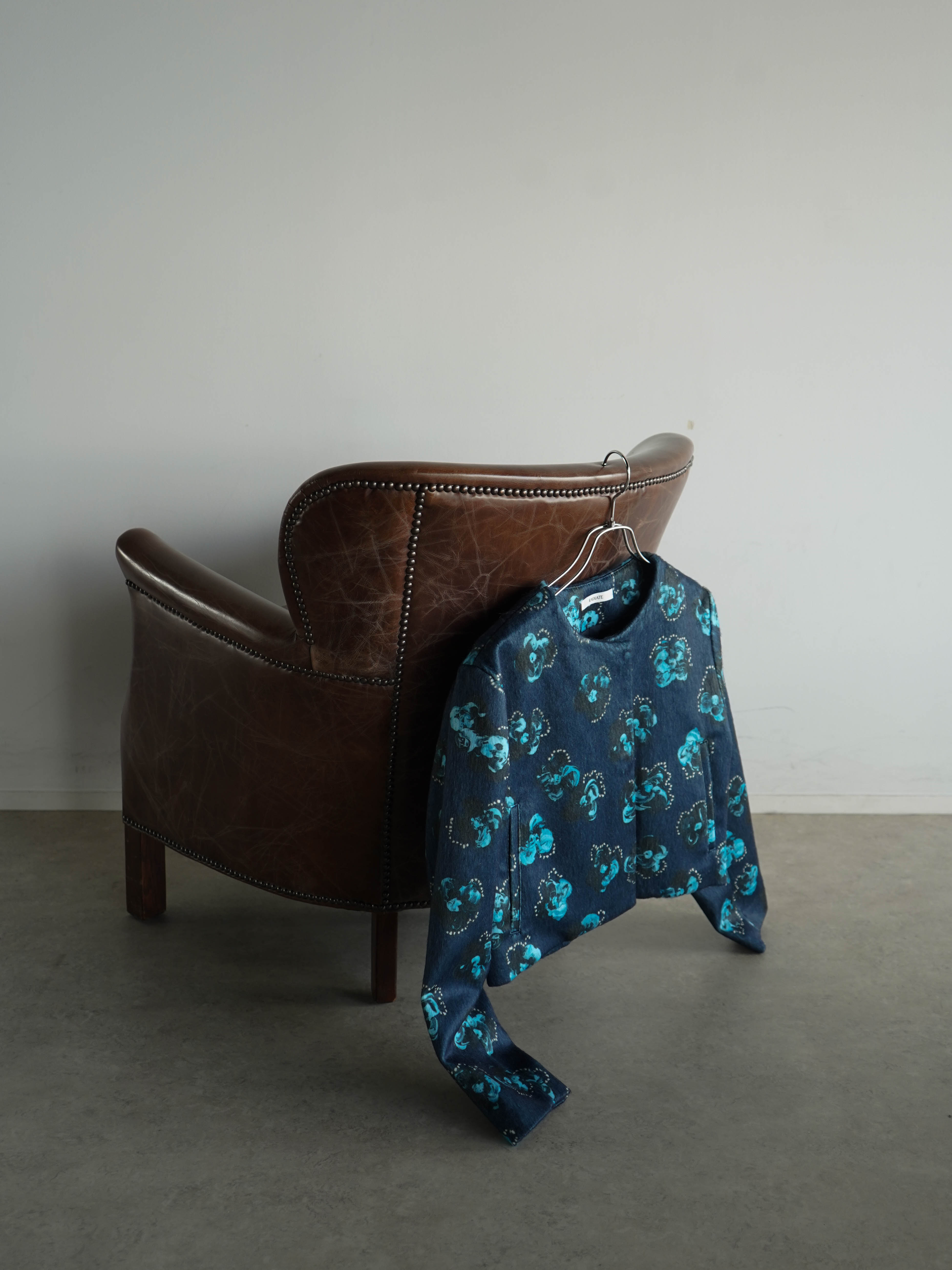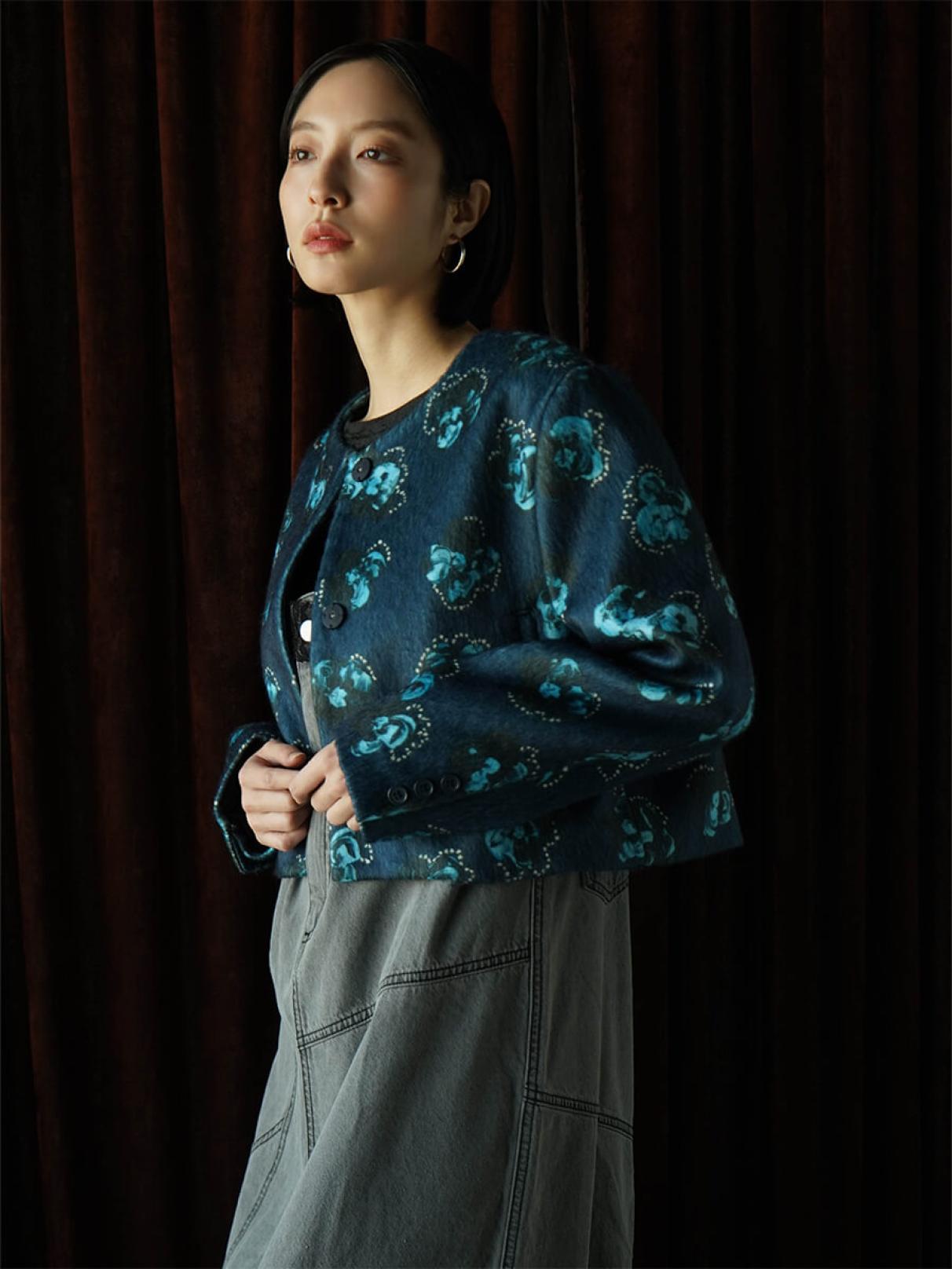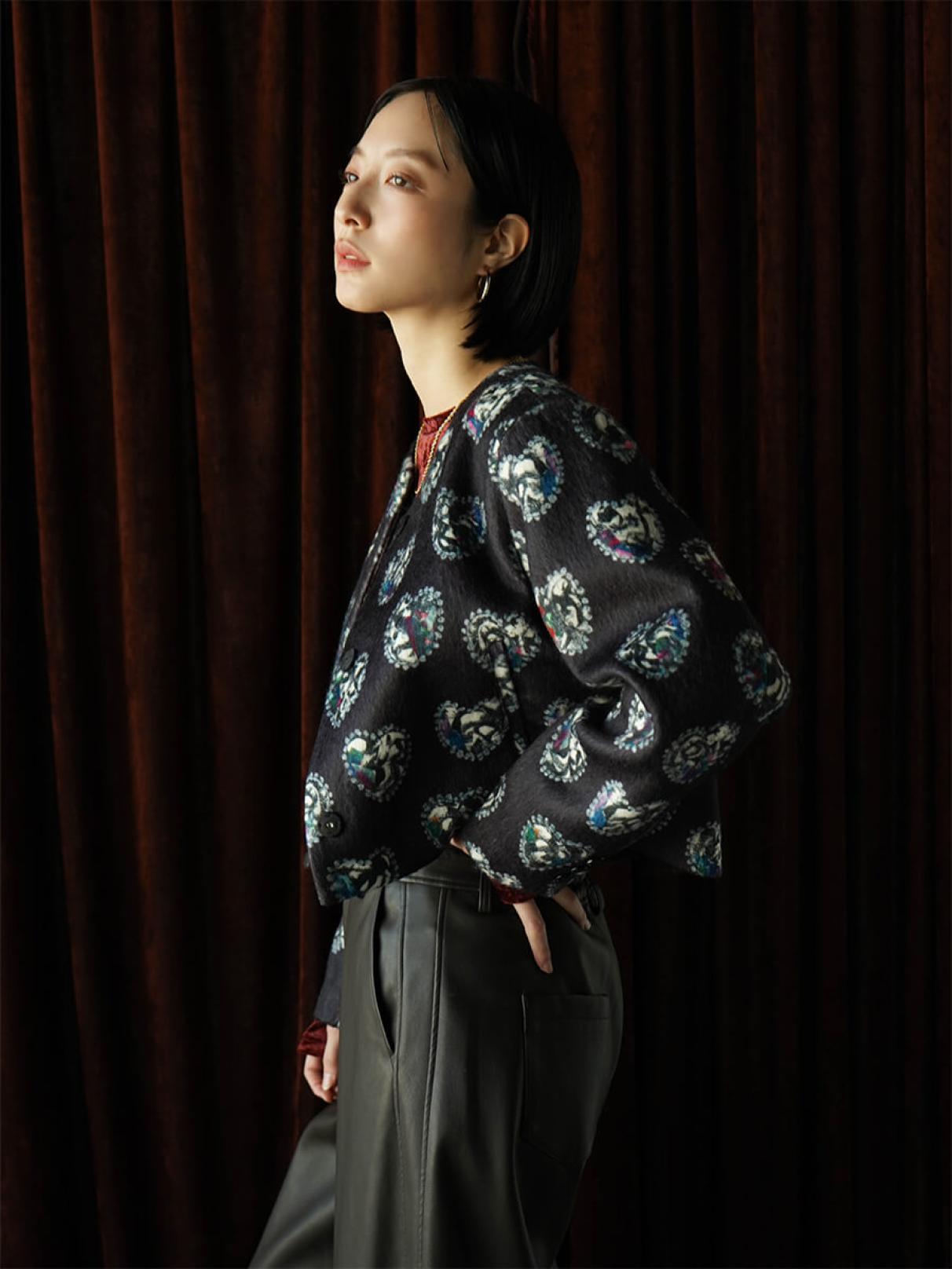 毛足のあるシャギー素材の上からプリントを施した、表情豊かな1着。寒い季節にぴったりな、表面に凹凸感のある素材をセレクトし、季節感のある仕上がりにしました。
