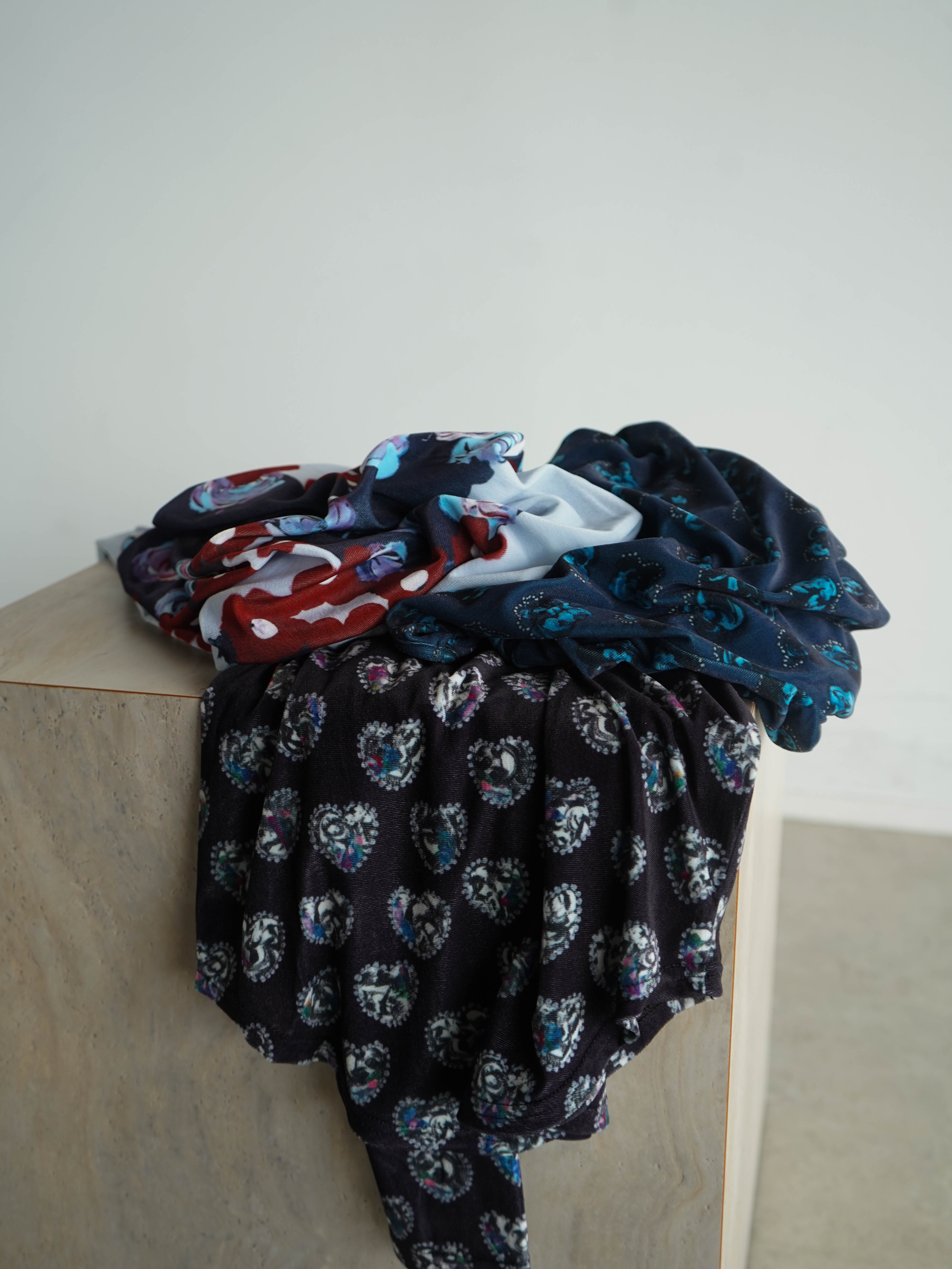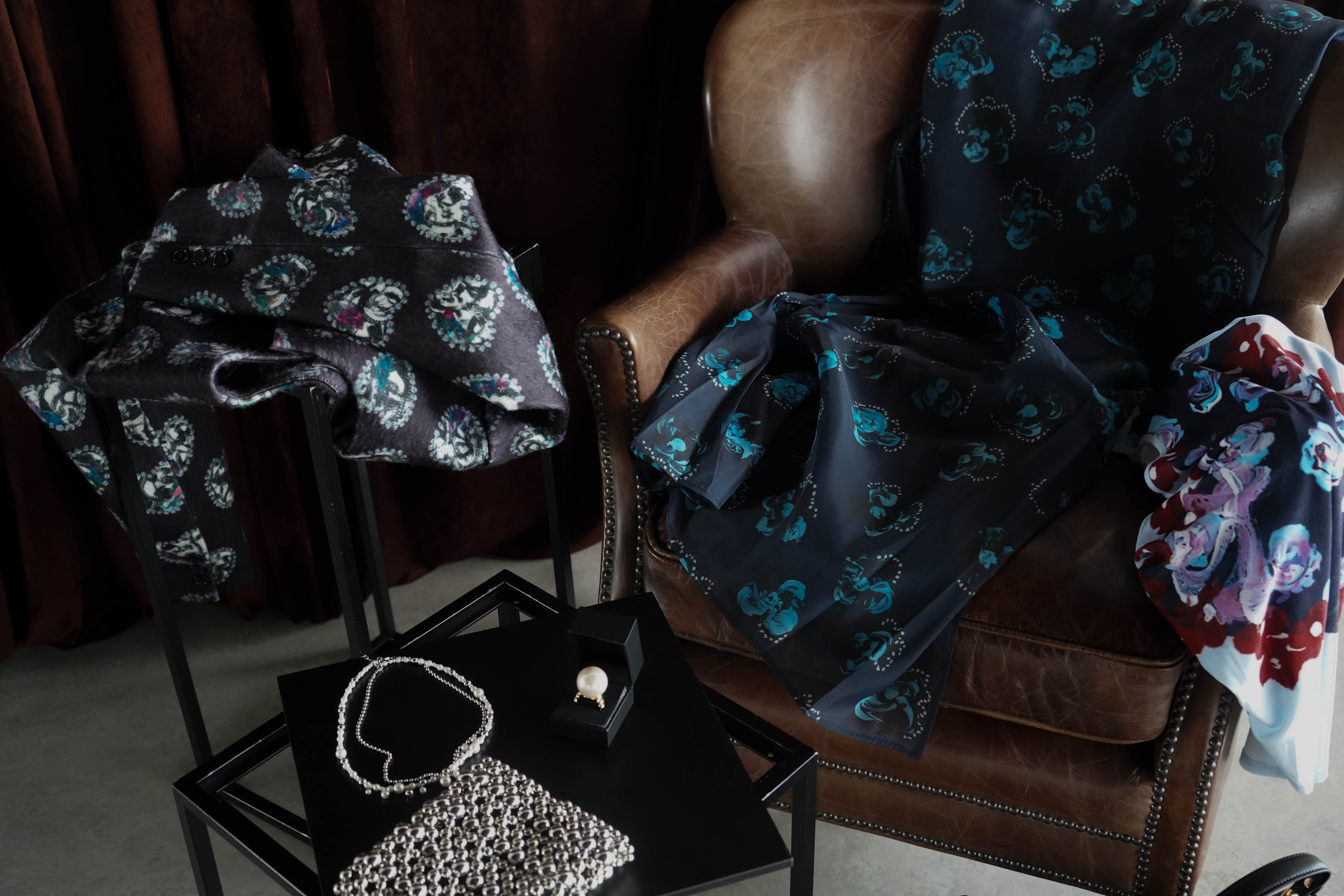 ホリデーのきらびやかさやナイト感が漂うアイテム。サイズ感を細かめにした柄とトーンを落とした色味が大人の女性でも着用していただきやすいデザインに。