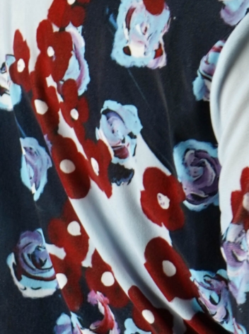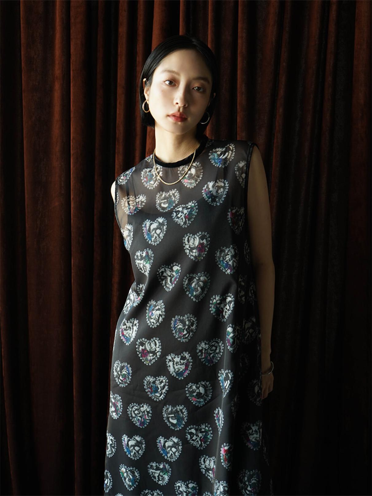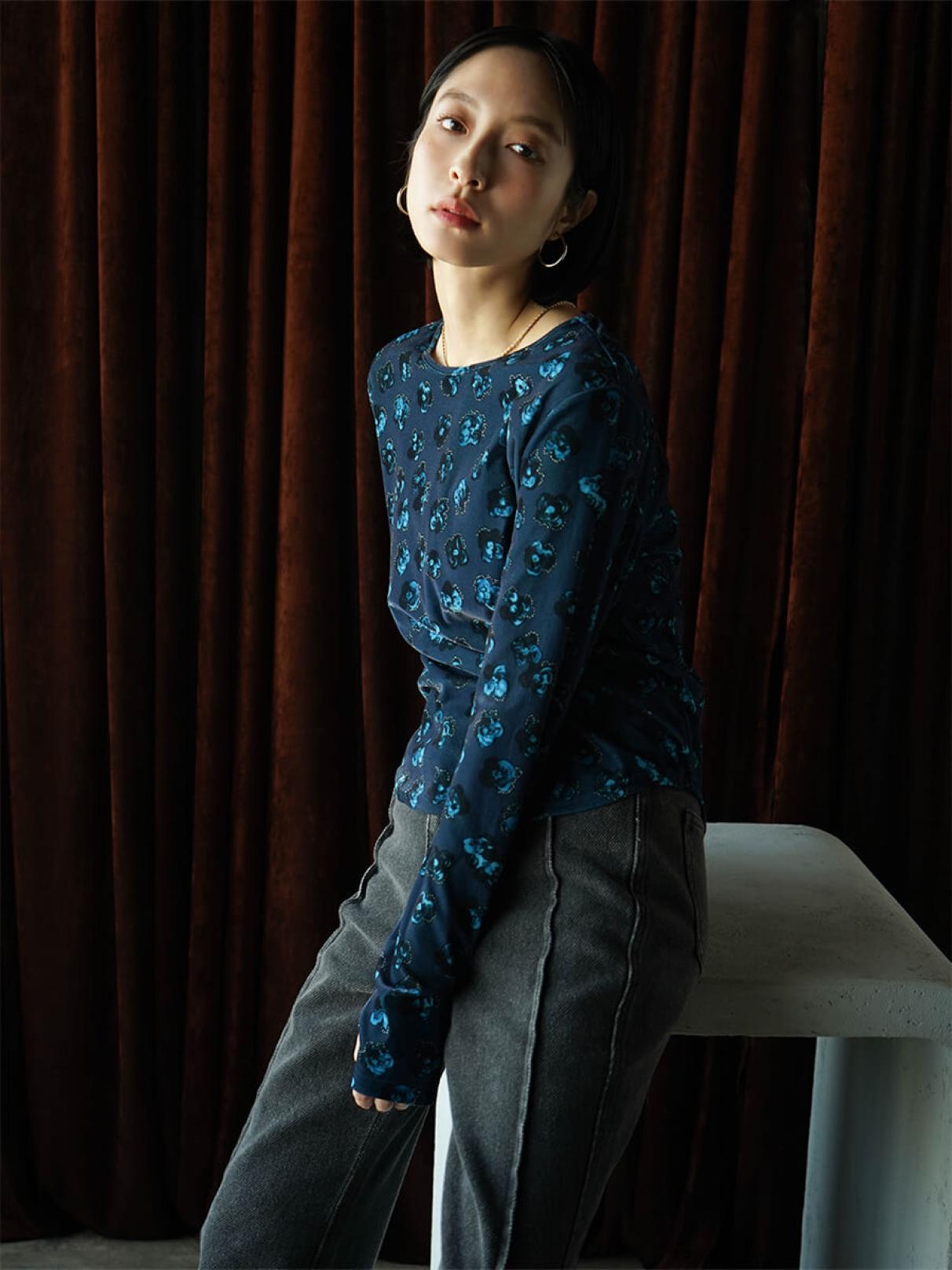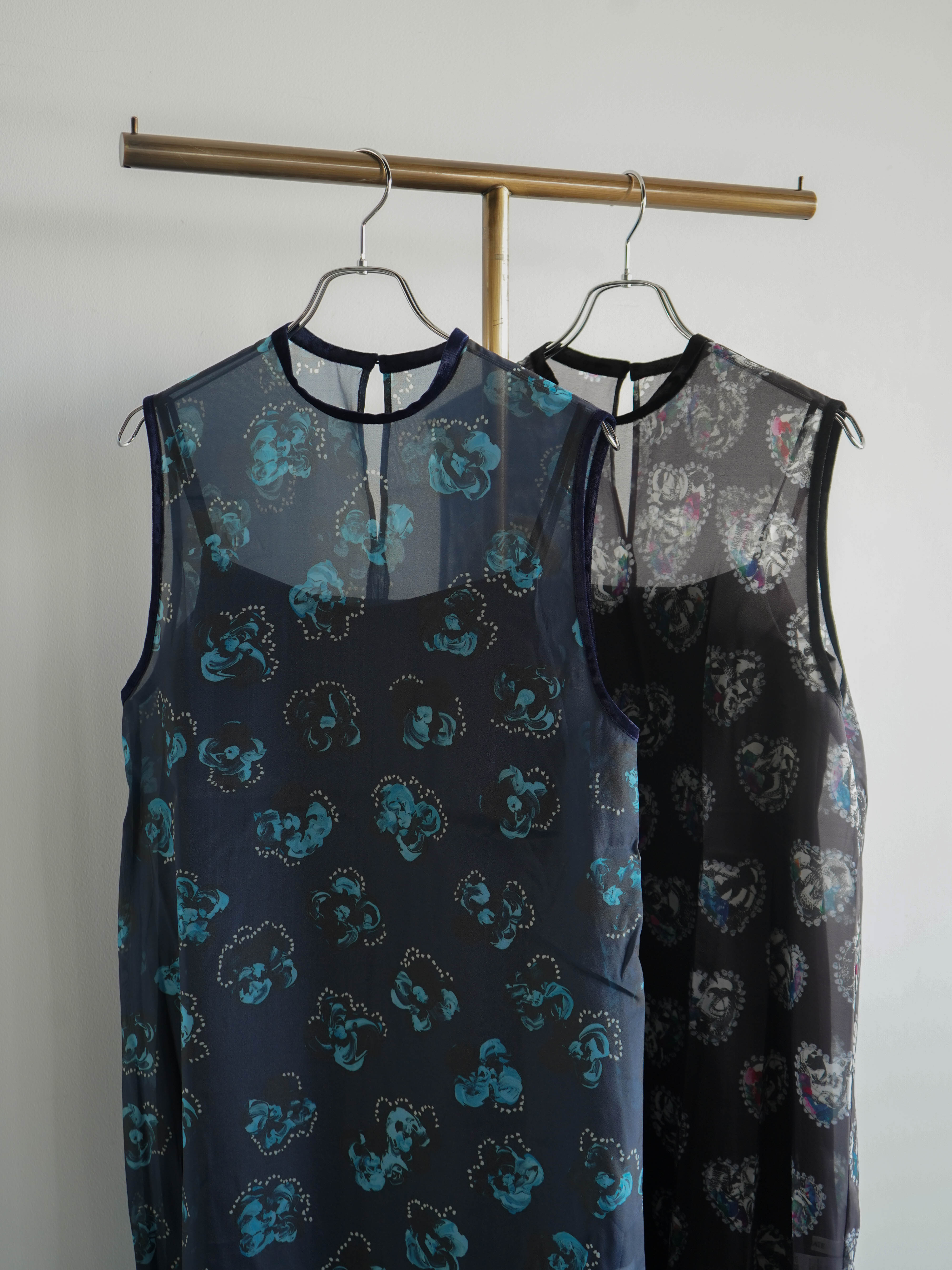 大胆な柄も、シアーならではの軽やかさで肌になじみ、上品さを演出。透け感のあるシアー素材にプリントをのせ、奥行きのある表情に仕上げました。
