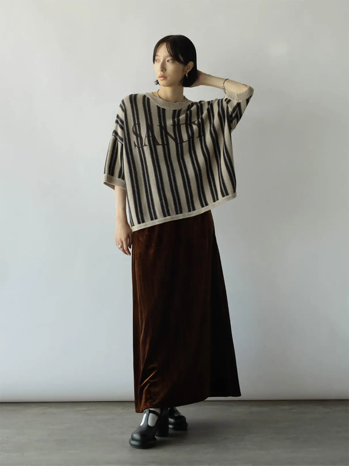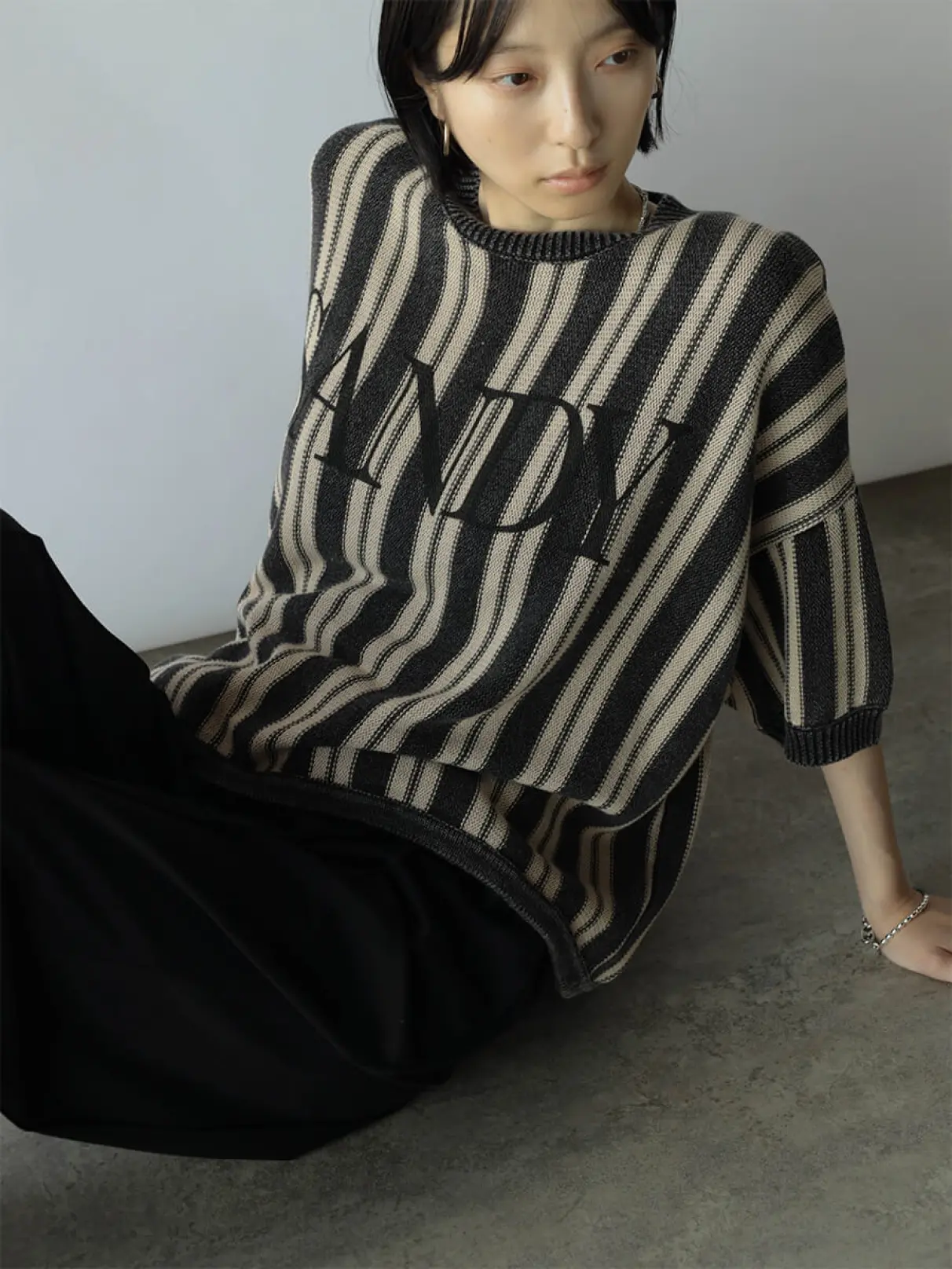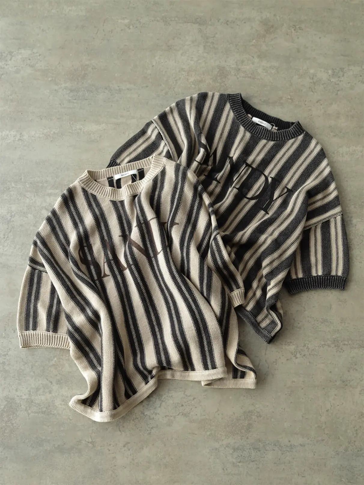 ロゴ×ストライプが大人カジュアルな雰囲気を漂わせるドルマンスリーブトップス。ケミカルウォッシュ加工を施し、ヴィンテージライクな雰囲気に仕上げました。柔らかく程よい厚みのニット素材なので、今から秋まで着用していただけます。ゆったりとしたサイズ感は着るだけでこなれ感を演出します。シンプルなボトムスと合わせてストライプを主役にしたコーデがおすすめです。