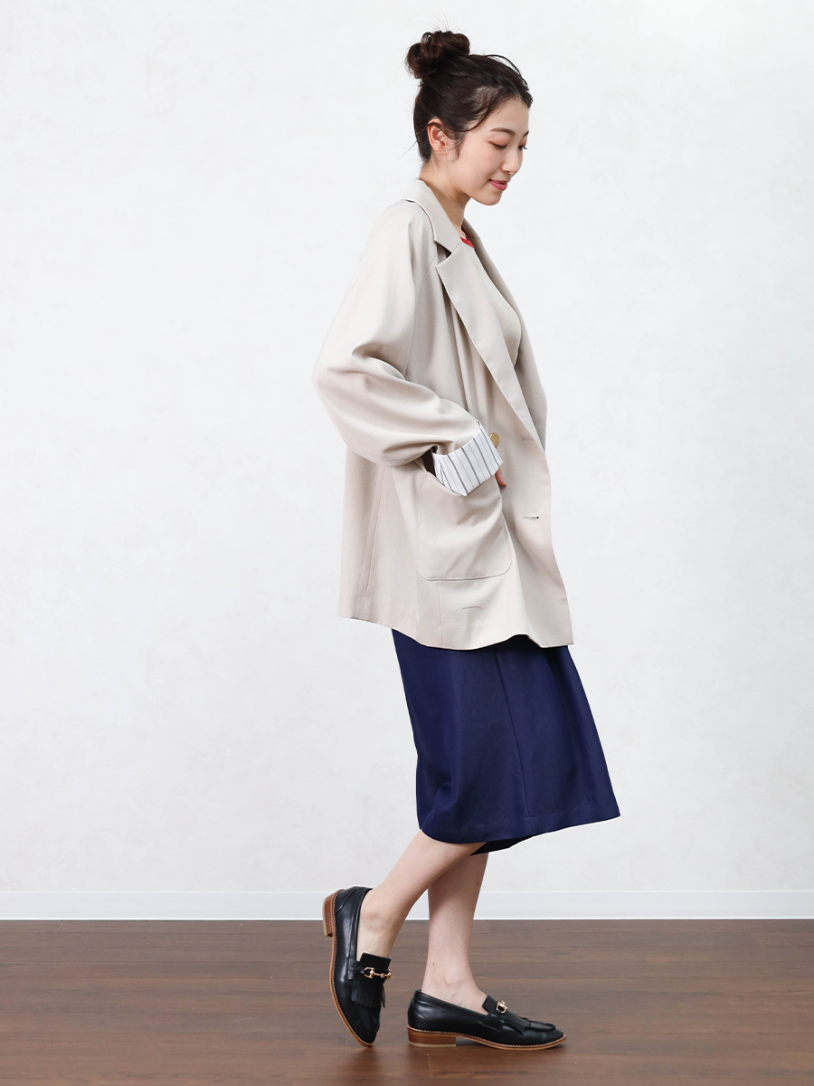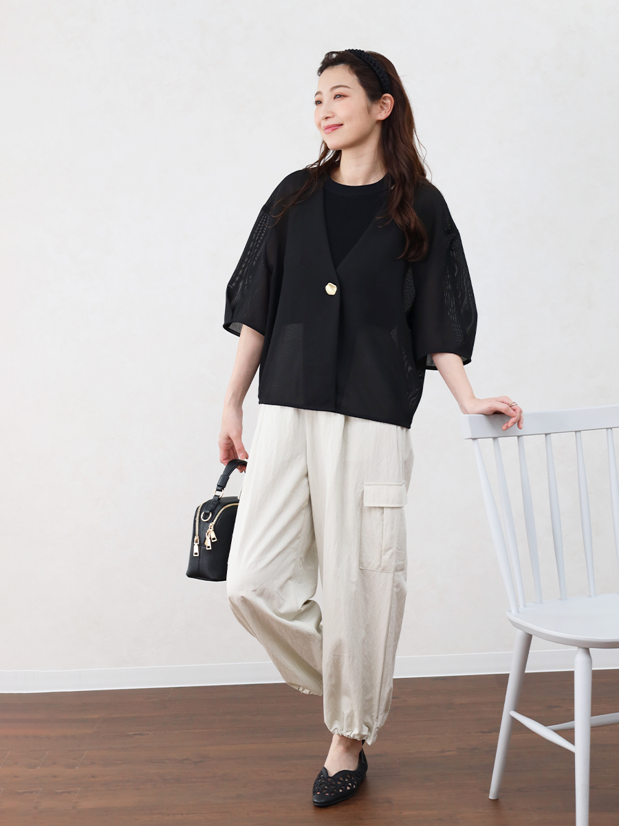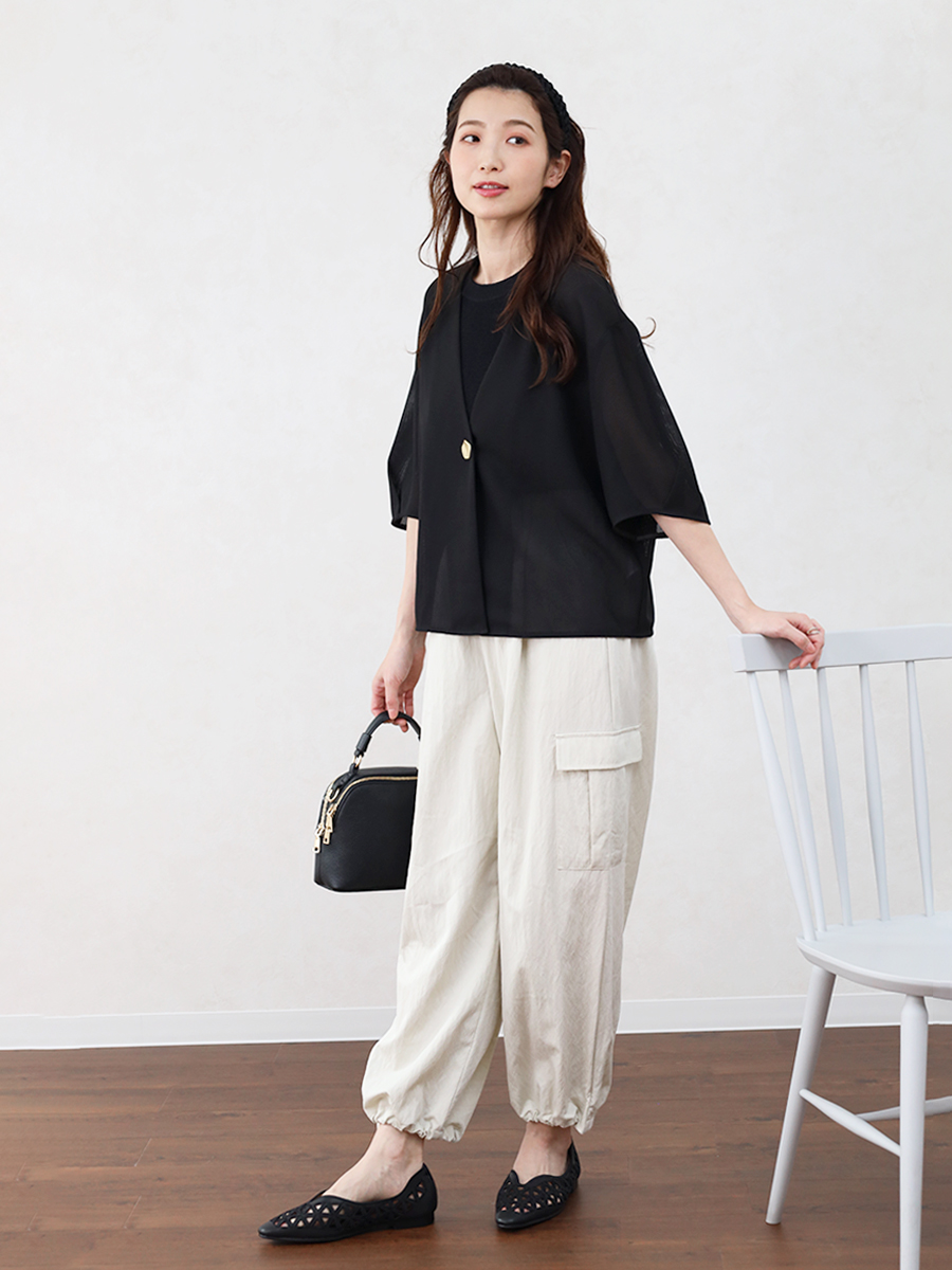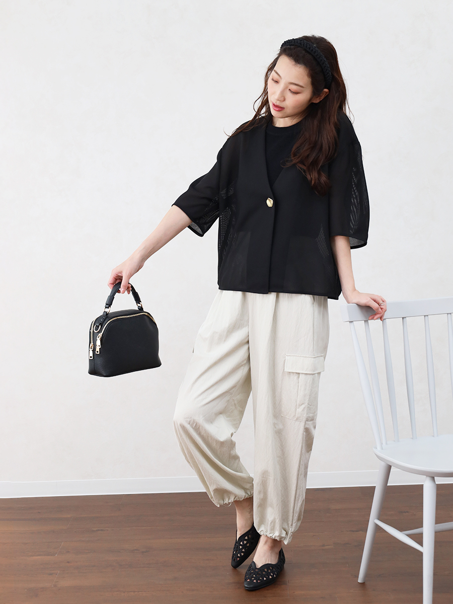 モノトーンでまとめた、シンプルで洗練された大人カジュアル。 ノーカラージャケットがきちんと感を出しつつ、ほどよい抜け感もプラスしてくれます。 インナーやボトムは少しカジュアルに振って、かしこまりすぎないバランスに。 丸みのあるシルエットやディテールが、さりげなく女性らしさも演出してくれます。 モノトーンなのにどこかやわらかい印象で、オンにもオフにも使える万能コーデです。