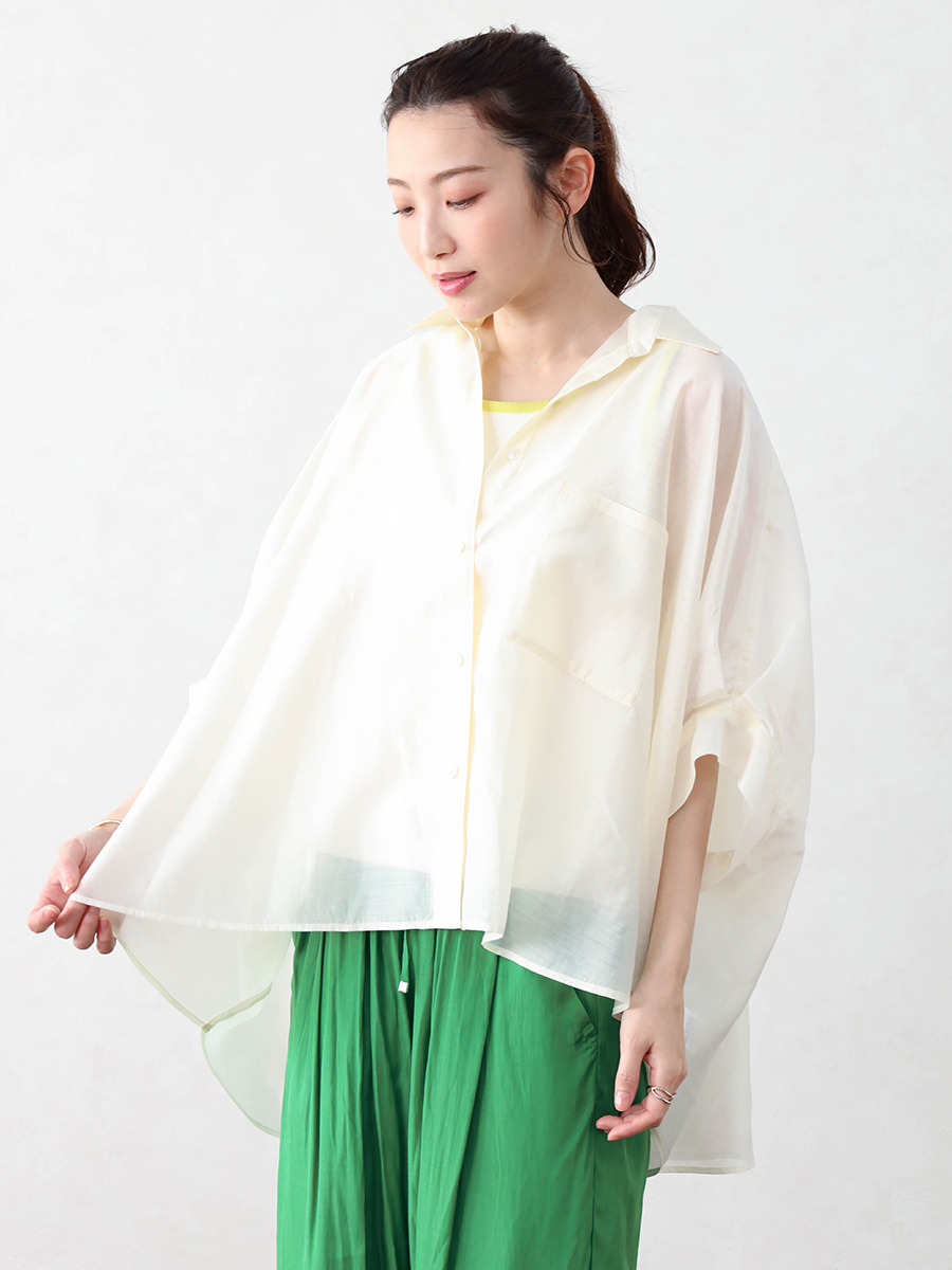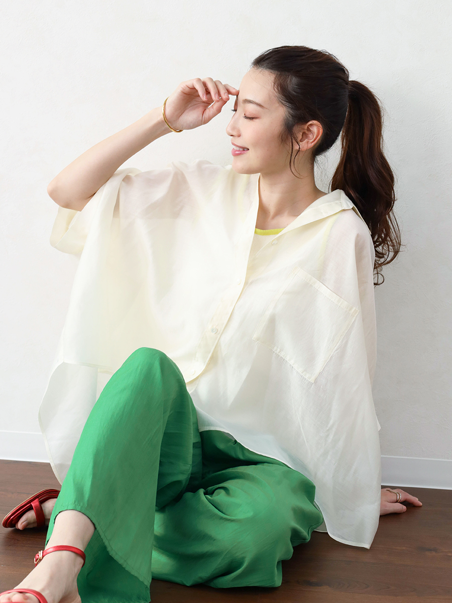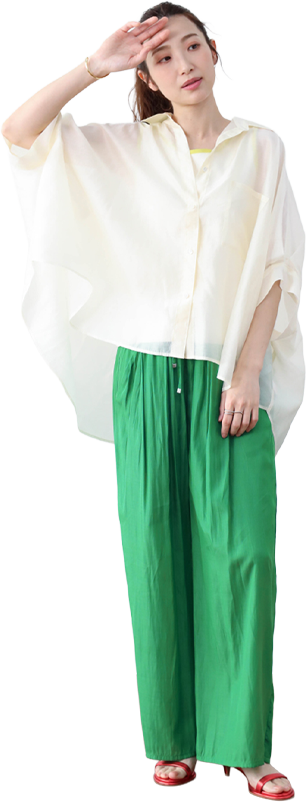 軽やかなシアーシャツで、抜け感たっぷりのサマーコーデ。 ボトムは主役になるビビットグリーンのパンツをチョイスして、一気にこなれた印象に。 リラックス感のある履き心地で、長時間の移動や旅行にもぴったりです◎ さらに、インナーのイエローと足元のレッドでさりげなくカラーをプラス。 シンプルだけどしっかり目を引く、カラーで楽しむスタイリングです。