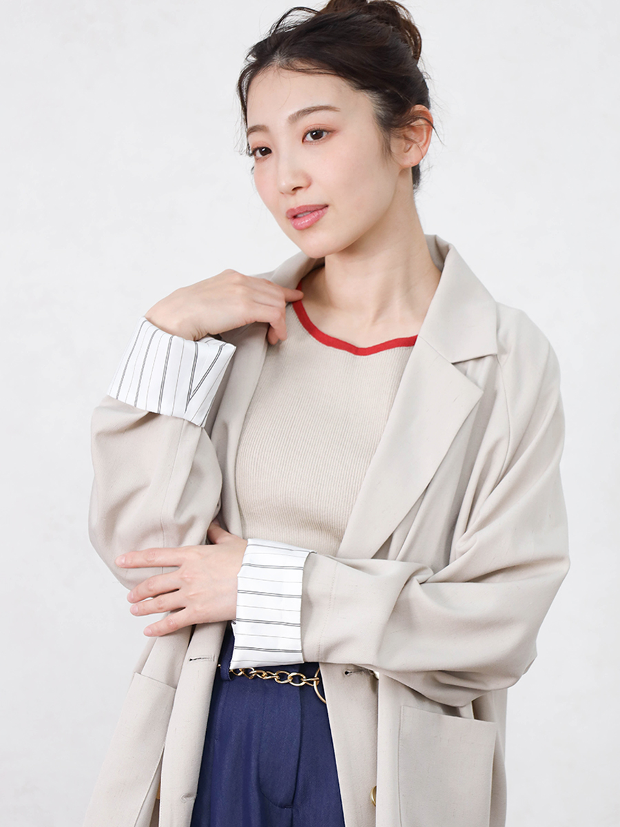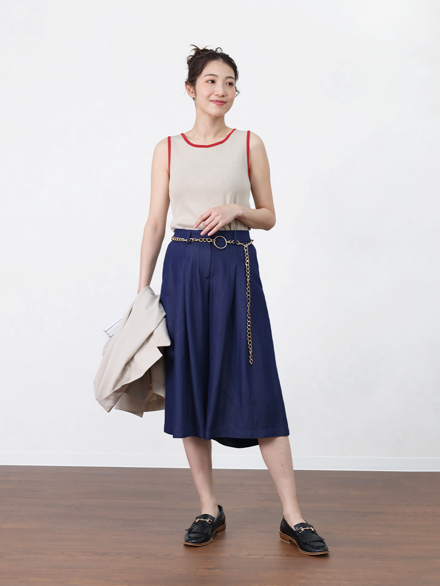 ベージュのジャケットにハーフパンツを合わせた、程よく力の抜けたサマースタイル。 赤×ベージュのバイカラータンクトップを合わせて、ヘルシーで鮮やかな印象をプラスします。 足元はローファーで引き締めつつ、ゴールドのチェーンベルトでほんのり華やかさを。 マリンを感じさせるカラーリングが、シーズンムードを高めます◎ お買い物や街歩きにもぴったりな、都会的サマールックです。