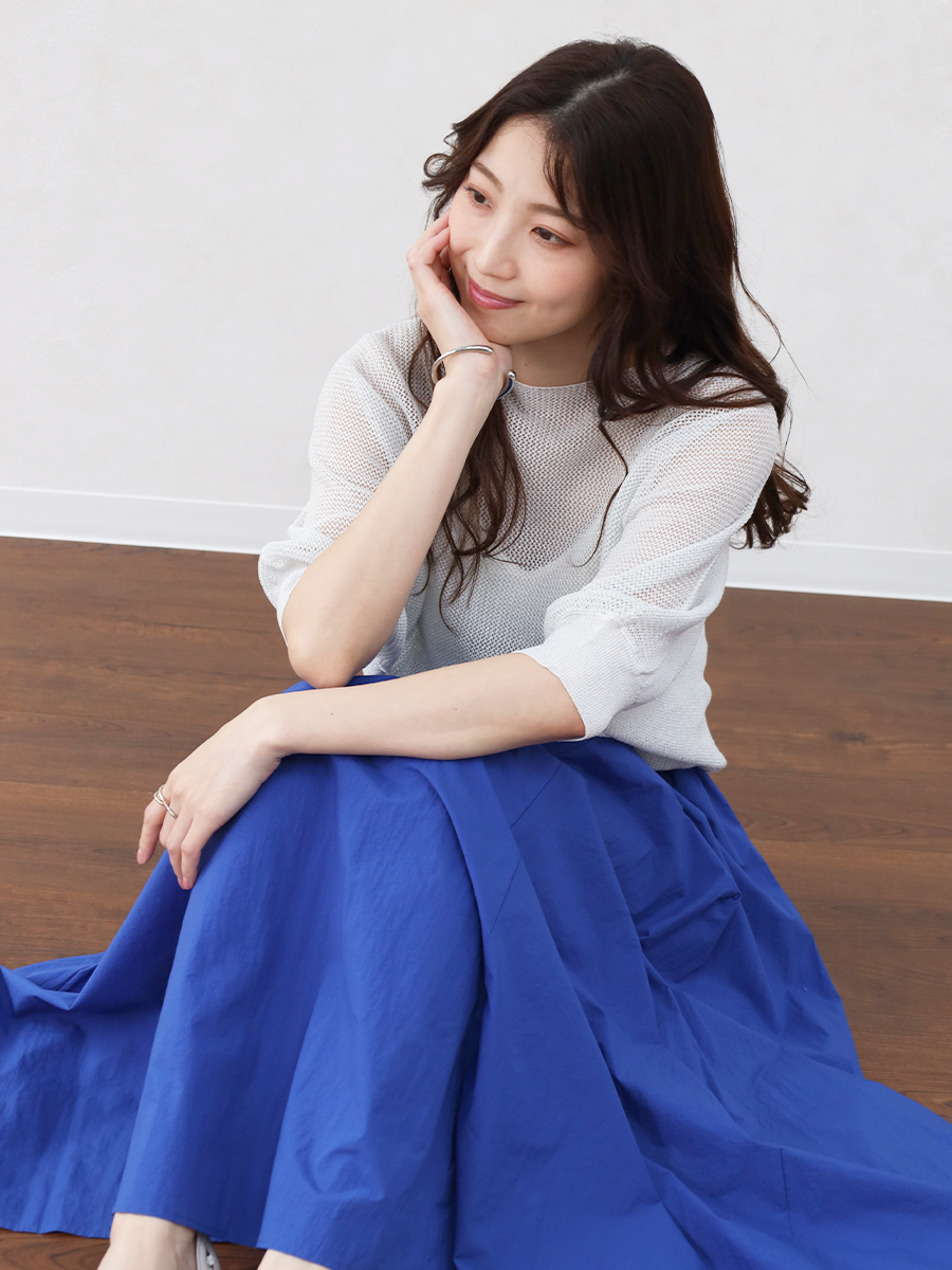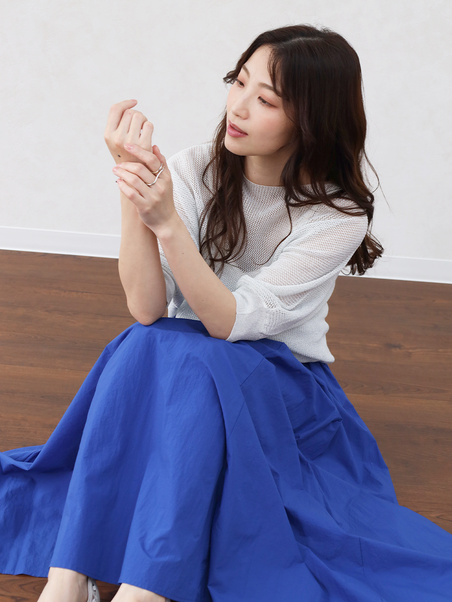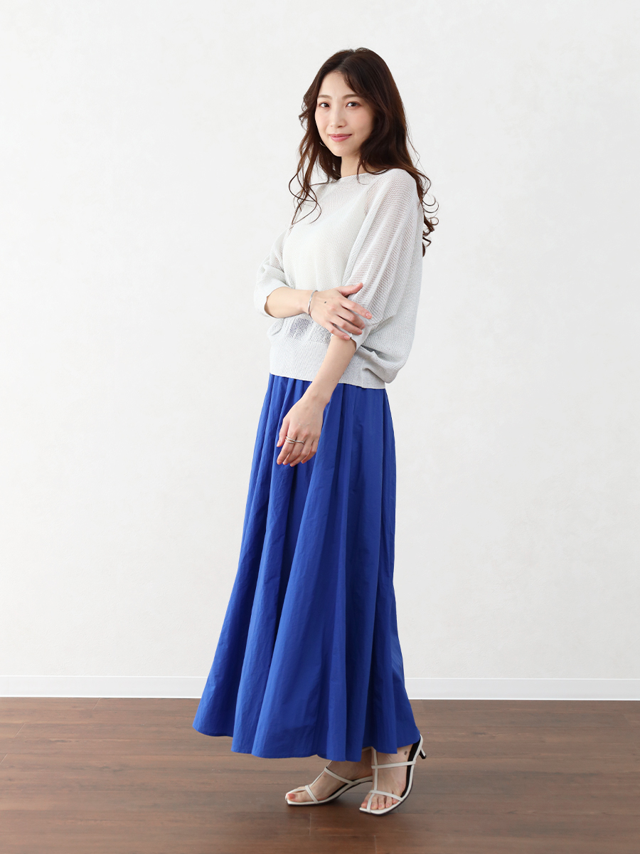 鮮やかなブルーのフレアスカートが主役の、華やかさと軽やかさを兼ね備えたスタイリング。 動くたびに揺れるシルエットが女性らしさを引き立てつつ、シンプルながらも印象的な着こなしへと導きます。 トップスには、シルバーのラメ糸を織り込んだサマーニットをセレクト。 ドルマンスリーブのゆるやかなフォルムと、メッシュ編みの程よい透け感が抜け感を生み、見た目にも涼やかな印象に◎ 足元は白のヒールサンダルで軽やかに仕上げることで、全体のバランスをより洗練された印象へとまとめます。