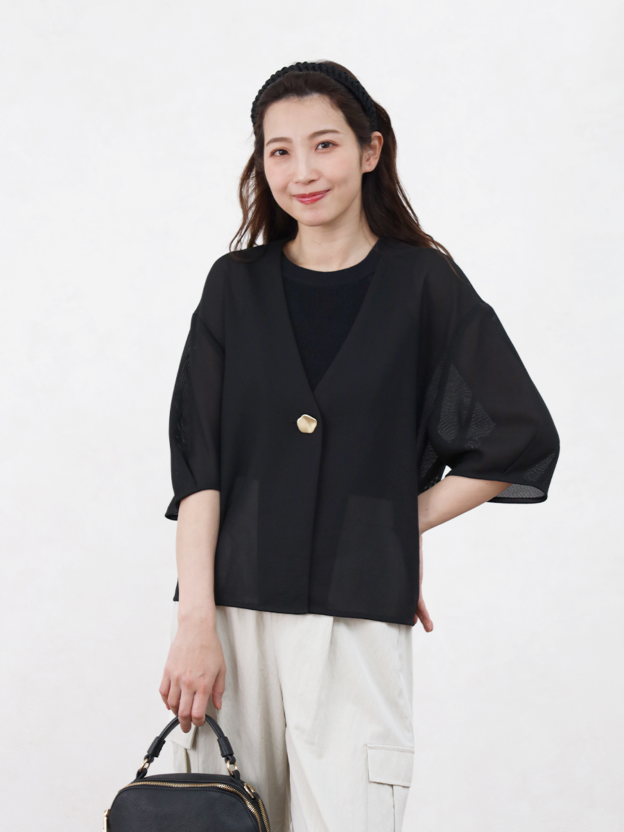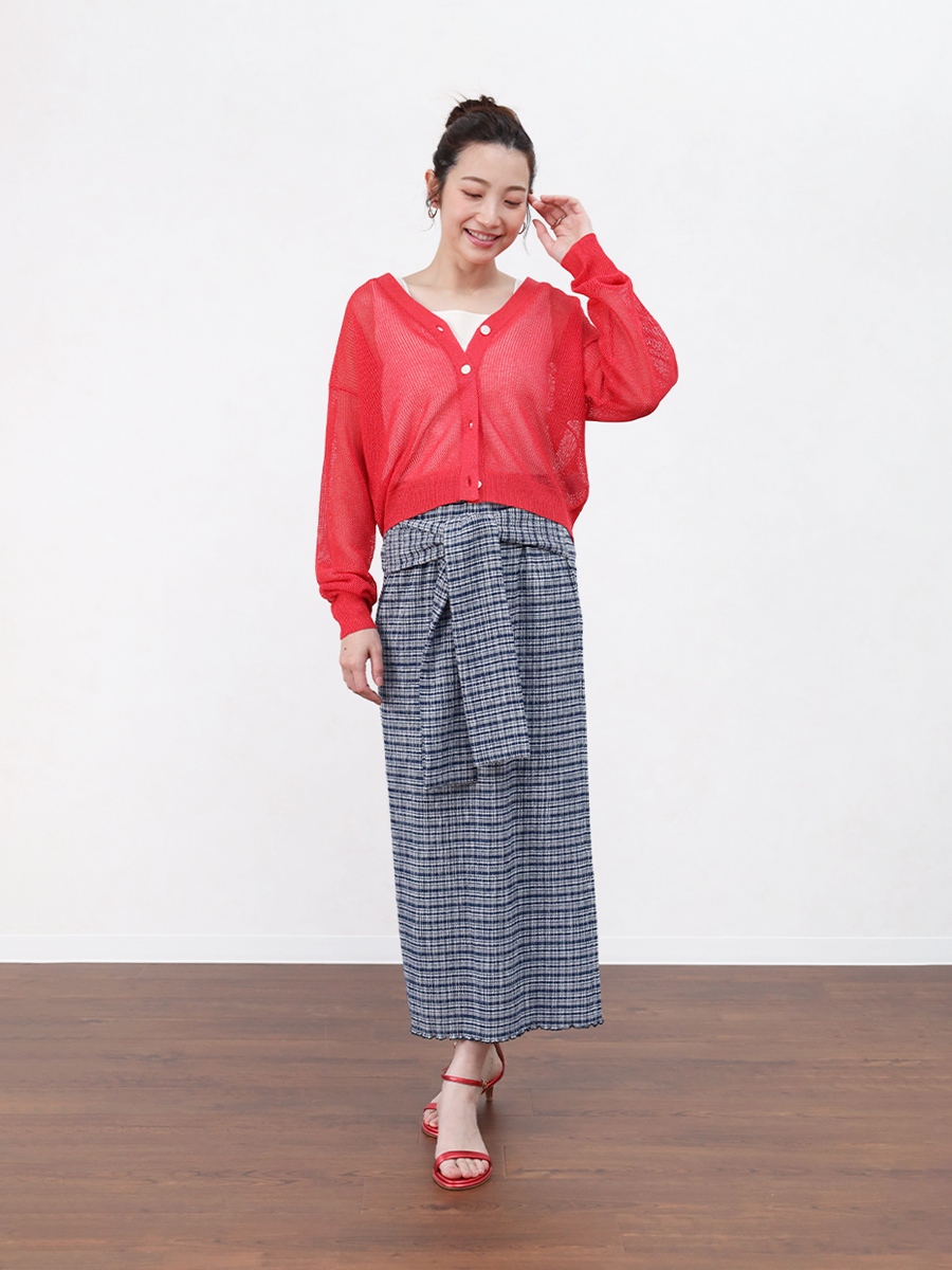 鮮やかな赤のシアーカーディガンで、コーディネートを一気に華やかに。 程よい透け感が女性らしさを引き立て、コンパクトなので冷房対策や持ち運びにも◎ ネイビーのスカートで引き締めつつ、ウエストのノットデザインでさりげないこなれ感を演出します。 シンプルながらも印象に残る、大人のカラースタイルです。