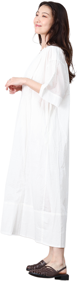 やわらかな風合いが魅力のインドコットンを使用したワンピース。 軽やかで通気性の良い素材感が、暑い季節にも心地よく、見た目にも涼やかな印象を与えてくれます。 たっぷりとしたシルエットと繊細なディテールが、シンプルながらもどこか上品で大人な雰囲気に。 足元はラフなサンダルで抜け感をプラスして、 楽ちんだけどお出かけにもぴったりなナチュラルコーデの完成です。