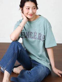 パールの飾りのアクセントが華やかなロゴTシャツ。