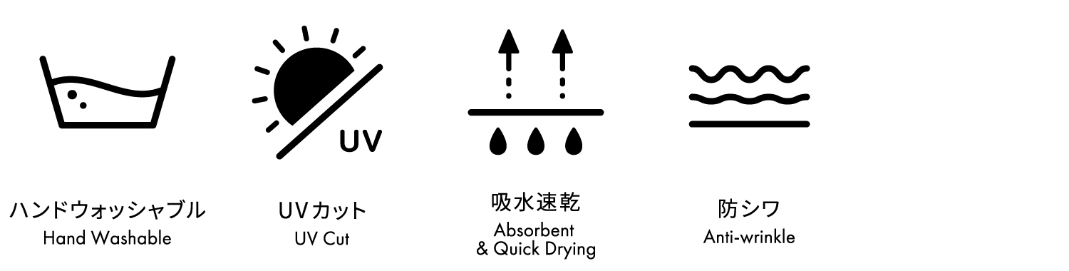 吸水速乾・UVカット・防しわに加え、自宅で洗えるイージーケア仕様。