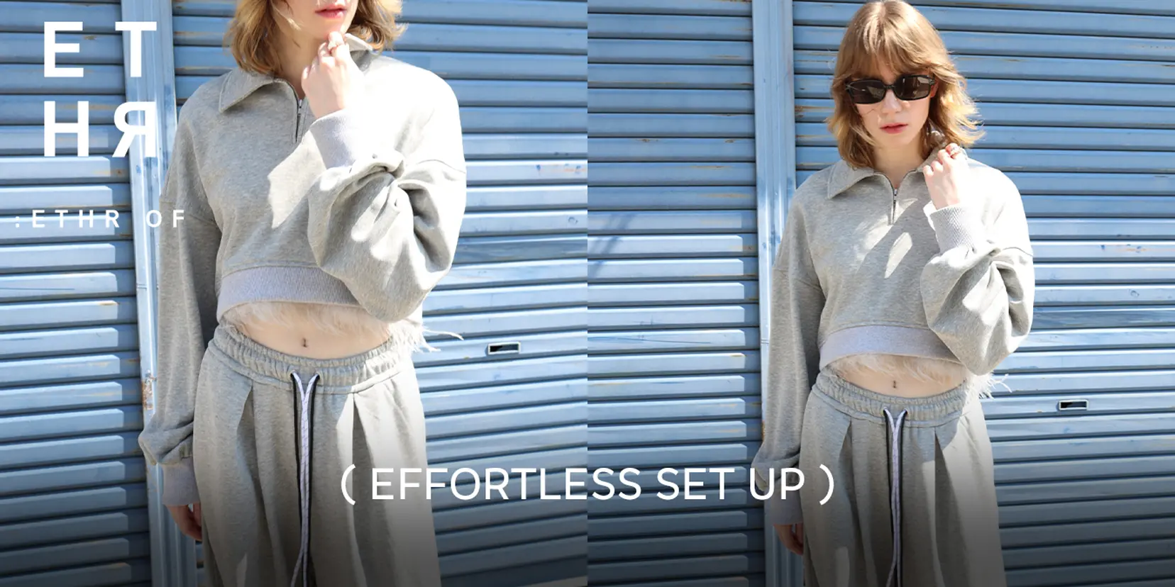 point:ハーフジップ×フェザーのデザインがこなれ感を演出するスウェットトップス。ややボリューム感がありながら、ショート丈にすることでバランスの取れたシルエットに。裾のフェザー部分は取り外し可能なので、着回し力抜群です。ハーフジップデザインなので、ネックの開き具合やレイヤードで雰囲気を変えられるアイテムです。