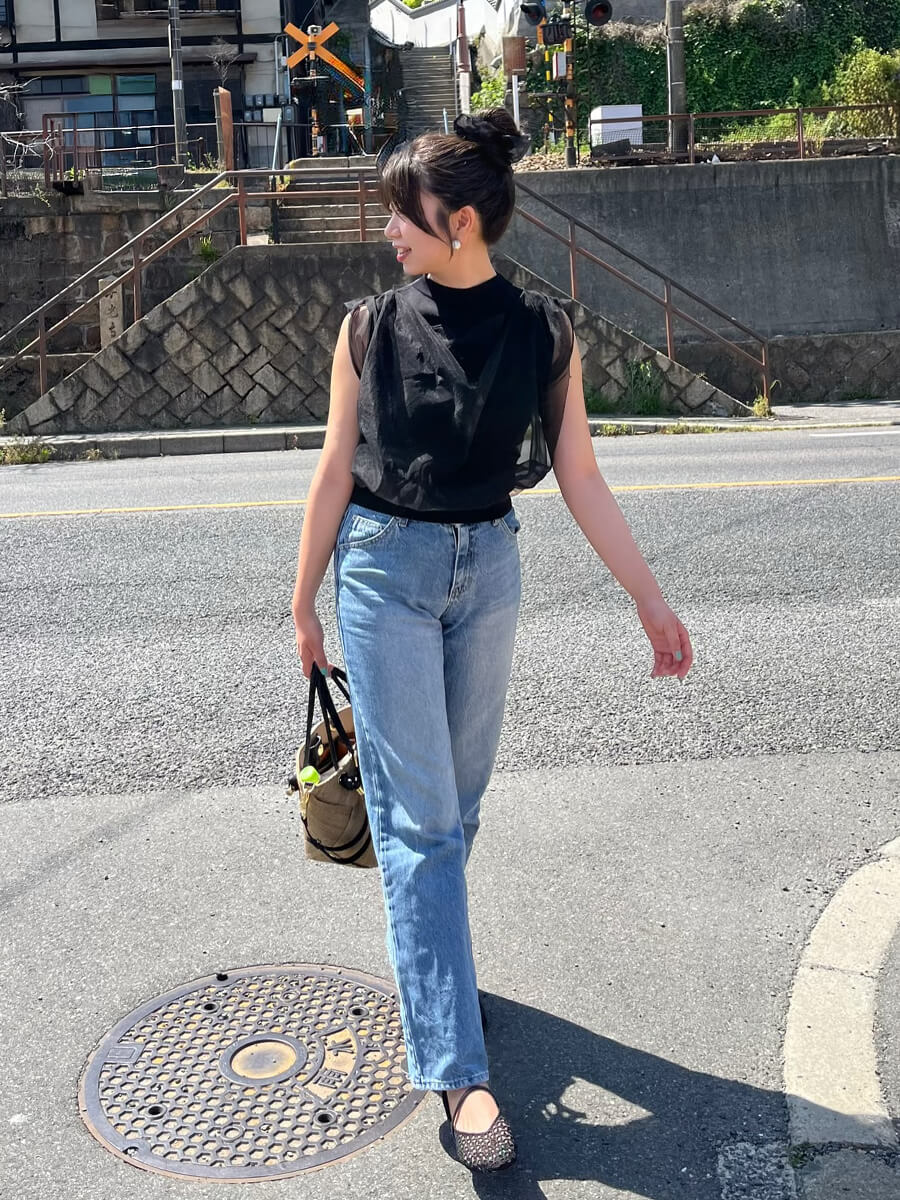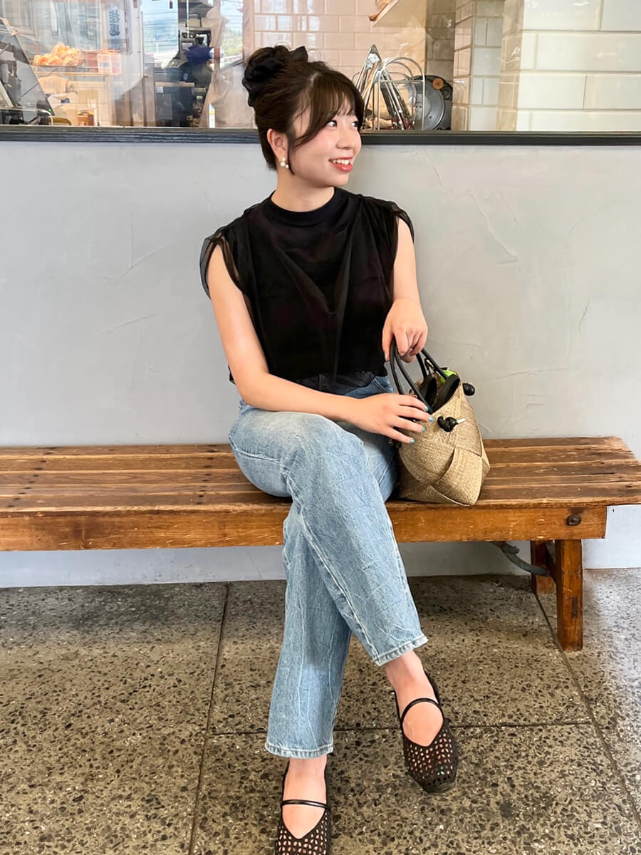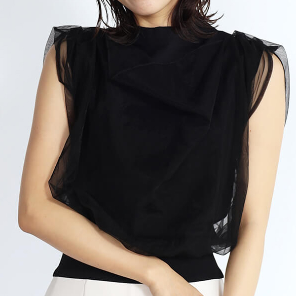 コンパクトなサイズ感なのでスカートでもパンツでもボトムを選ばず合わせやすいです。チュールがふわっと重なっていることで、ボディラインを拾いすぎない&腕周りを程よくカバーしてくれるのが嬉しい◎