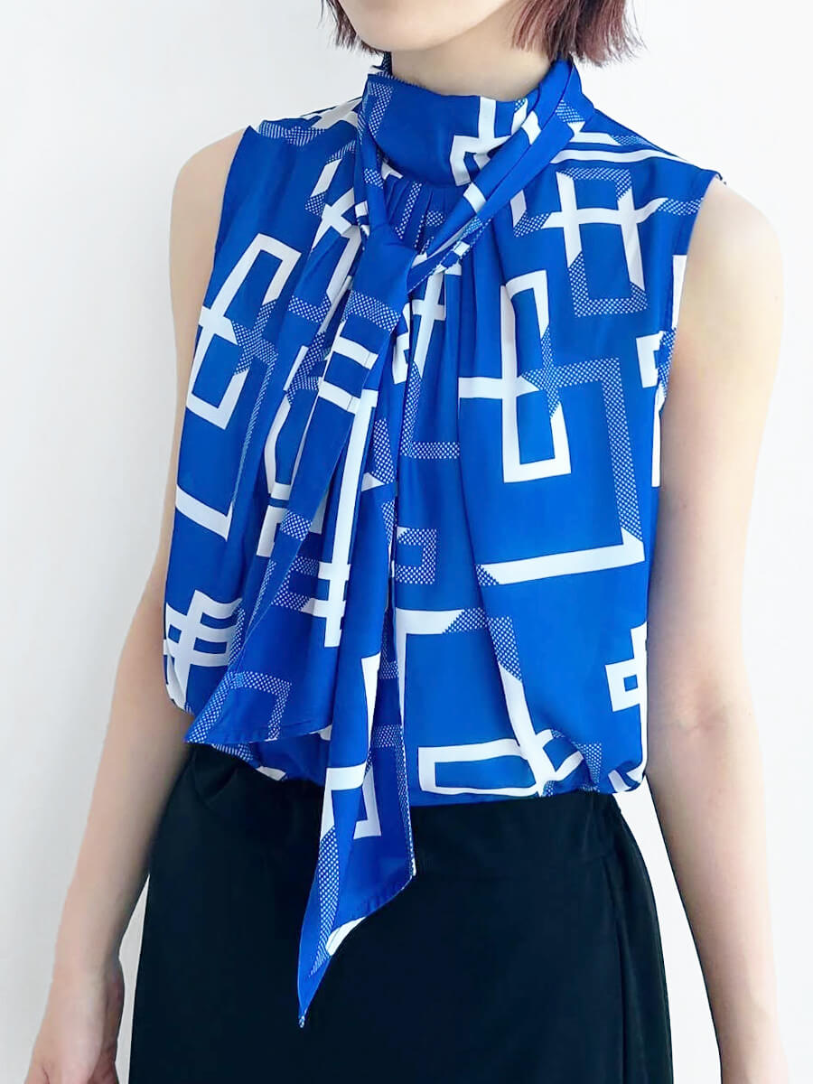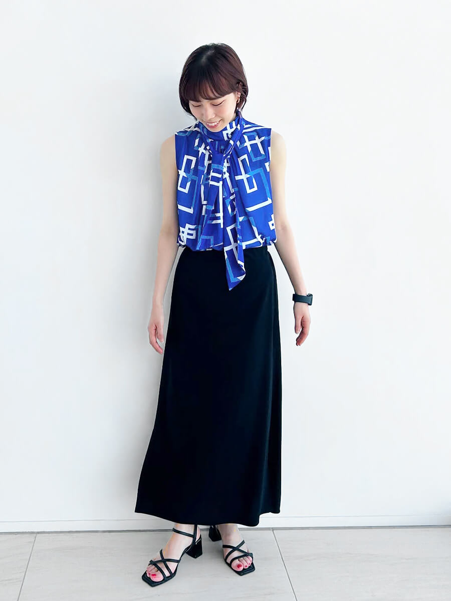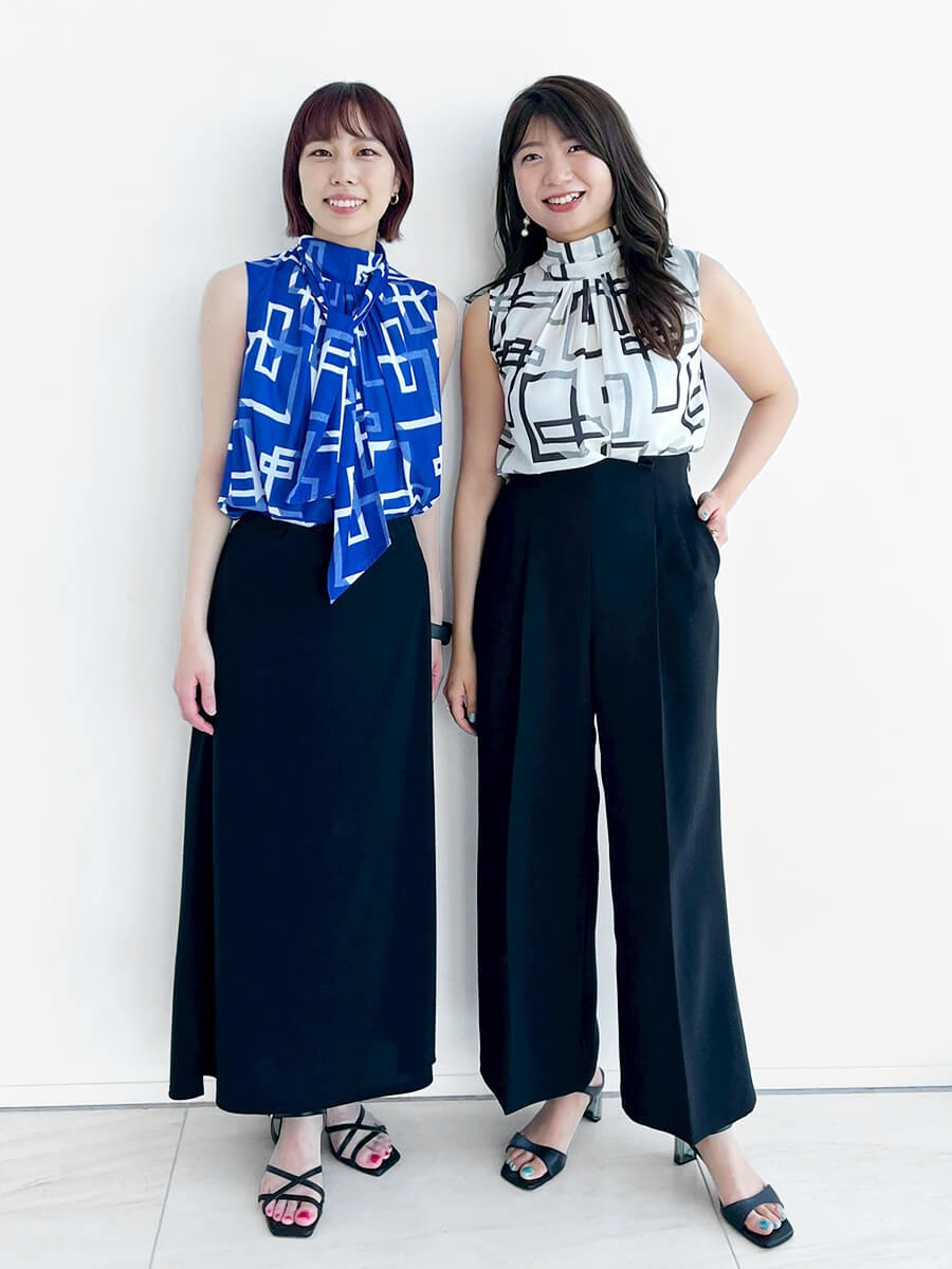 最近リアルバイしたアイテム。先日の展示会にも着て行きました!ジオメトリック柄×リボンで華やかな印象に。リボンは後ろで縛っても、前に持ってきてボウタイ風にするのも可愛いのでオススメです。スタッフの井田さんとお揃いだったので一緒に撮影♪