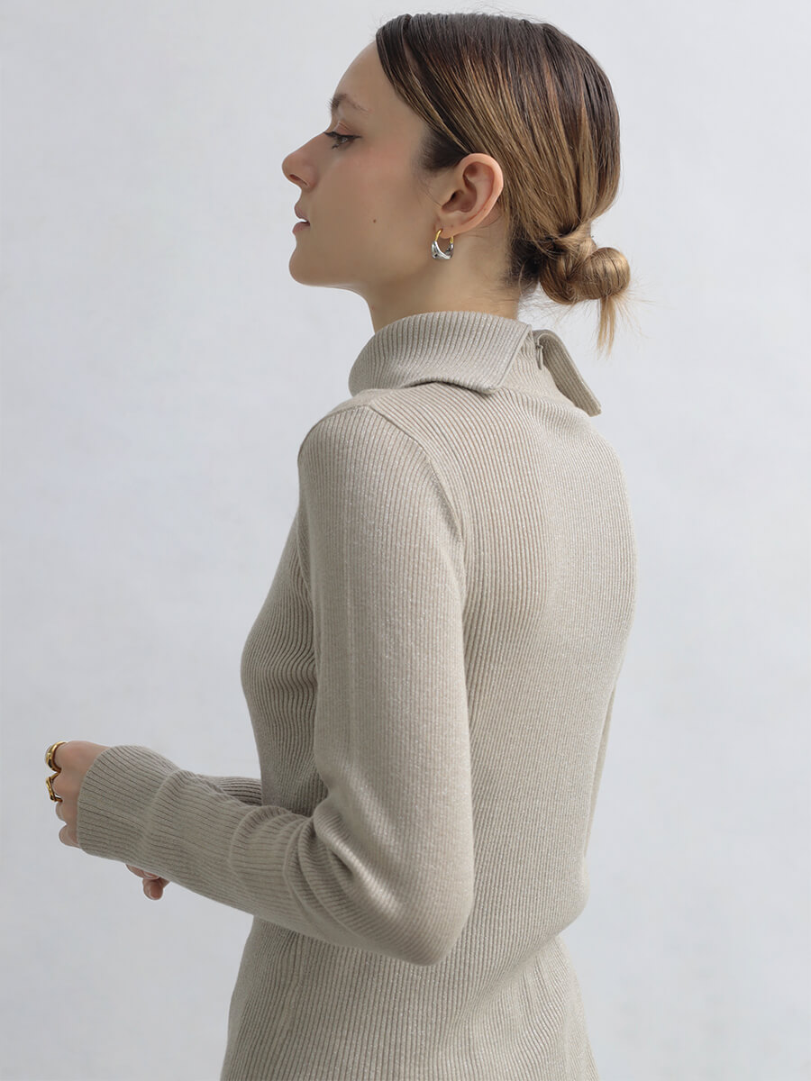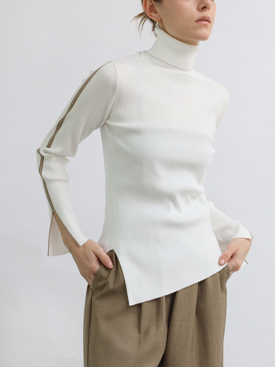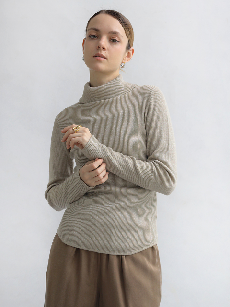 対比が魅力のポイントアイテム No.2 バックジップタートルネックリブニット |