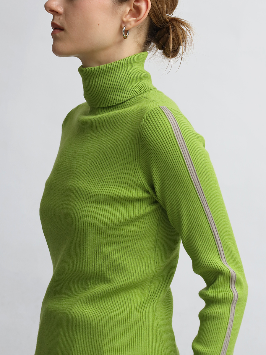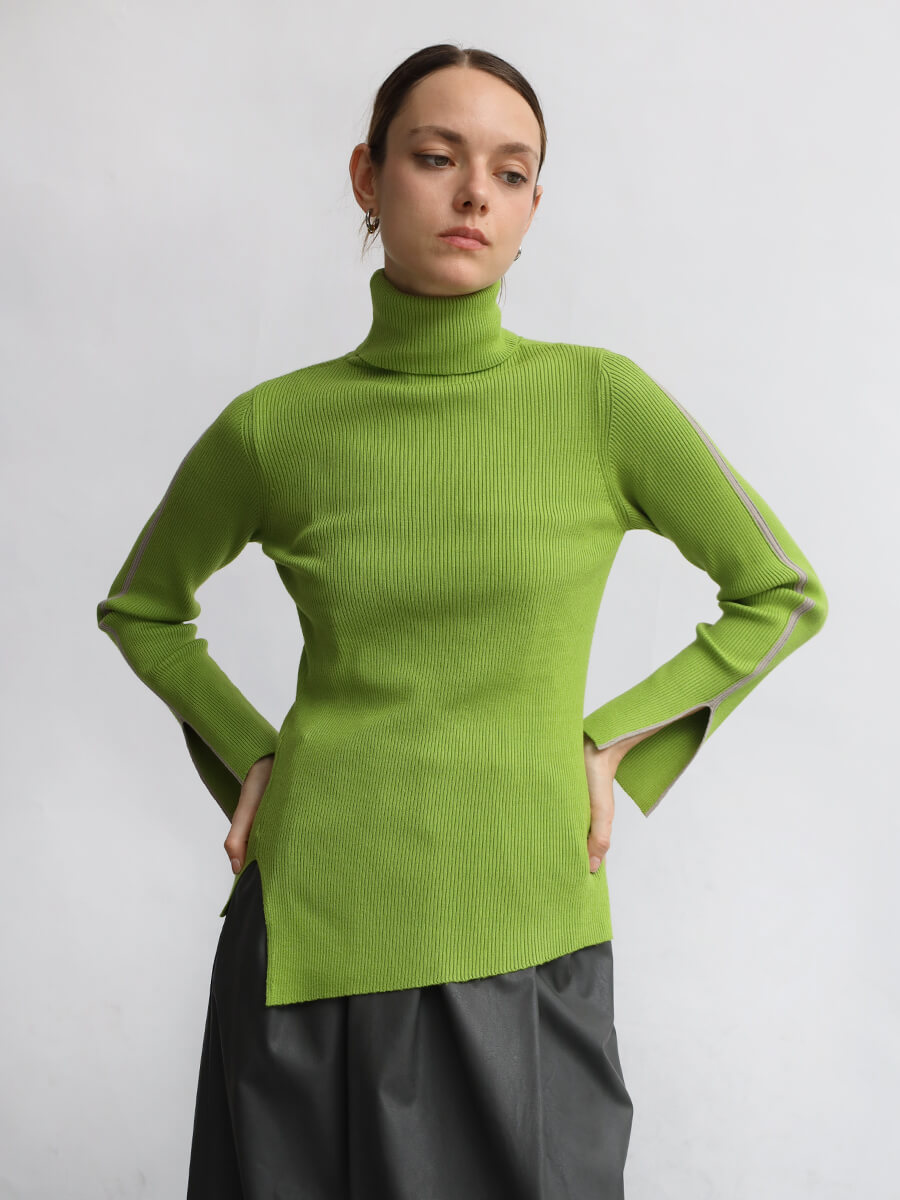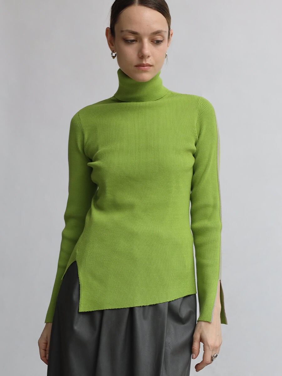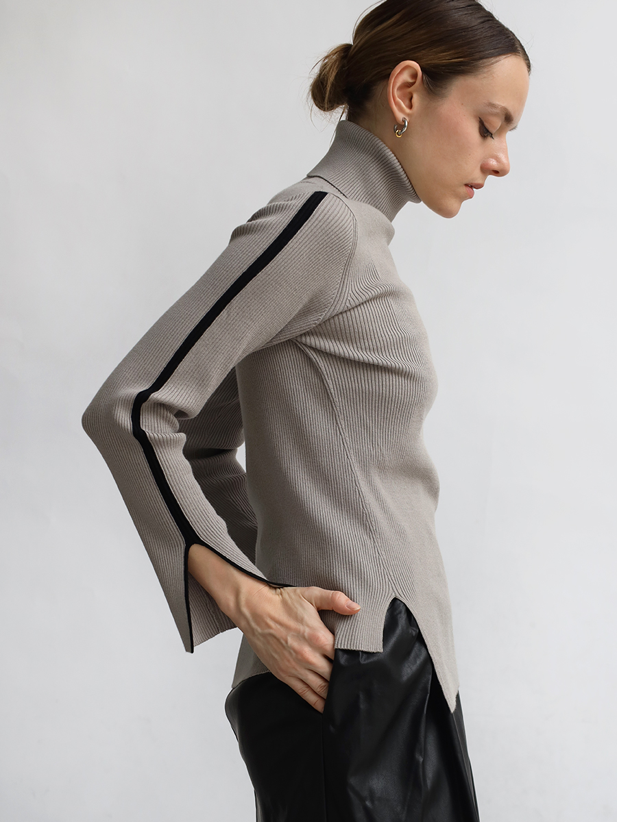 対比が魅力のポイントアイテム No.2 バックジップタートルネックリブニット |